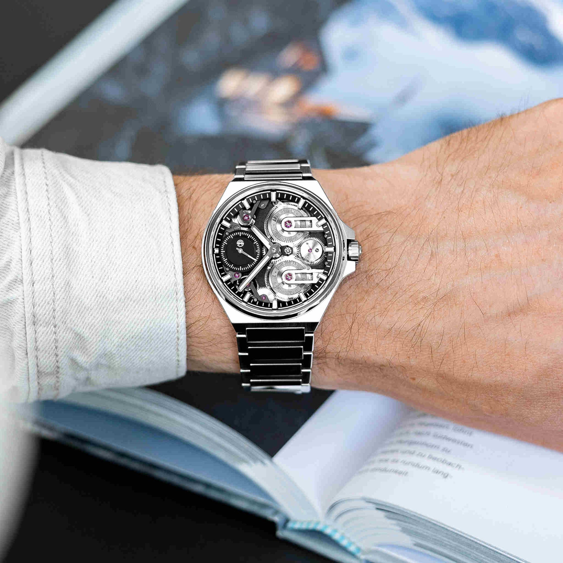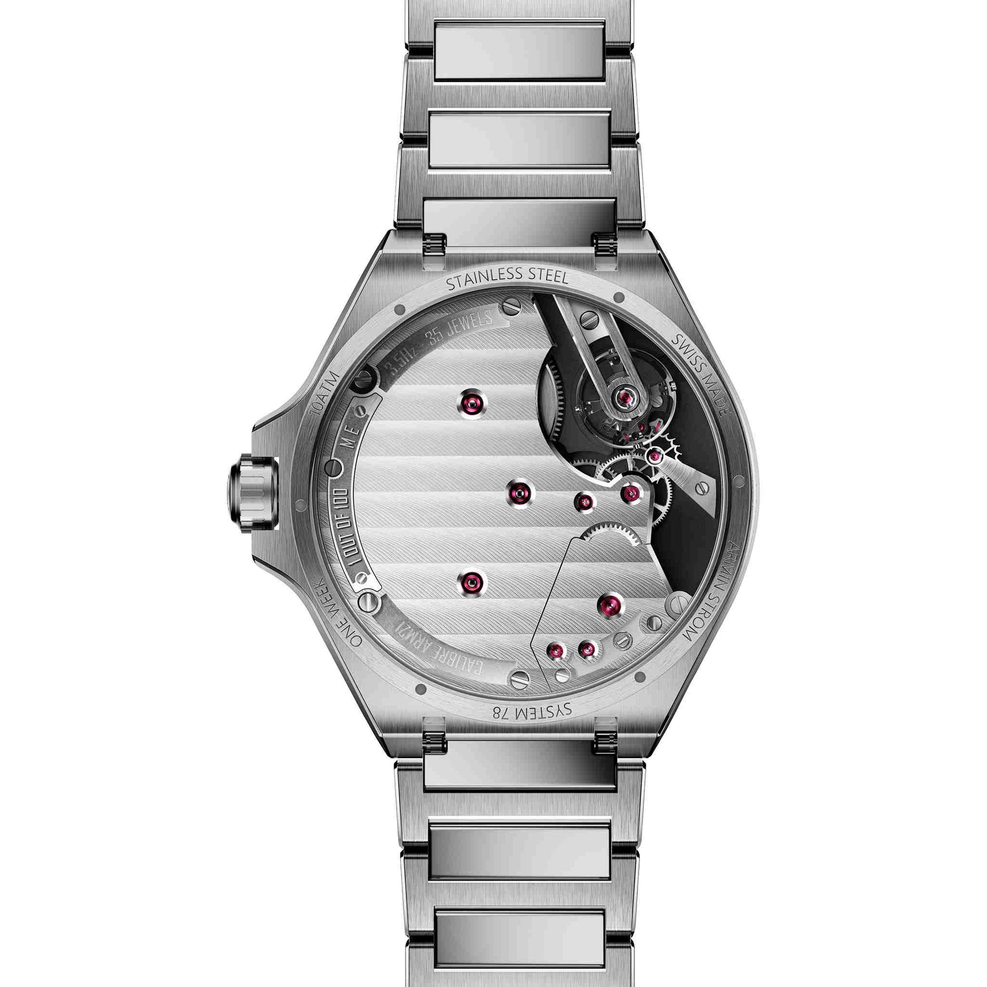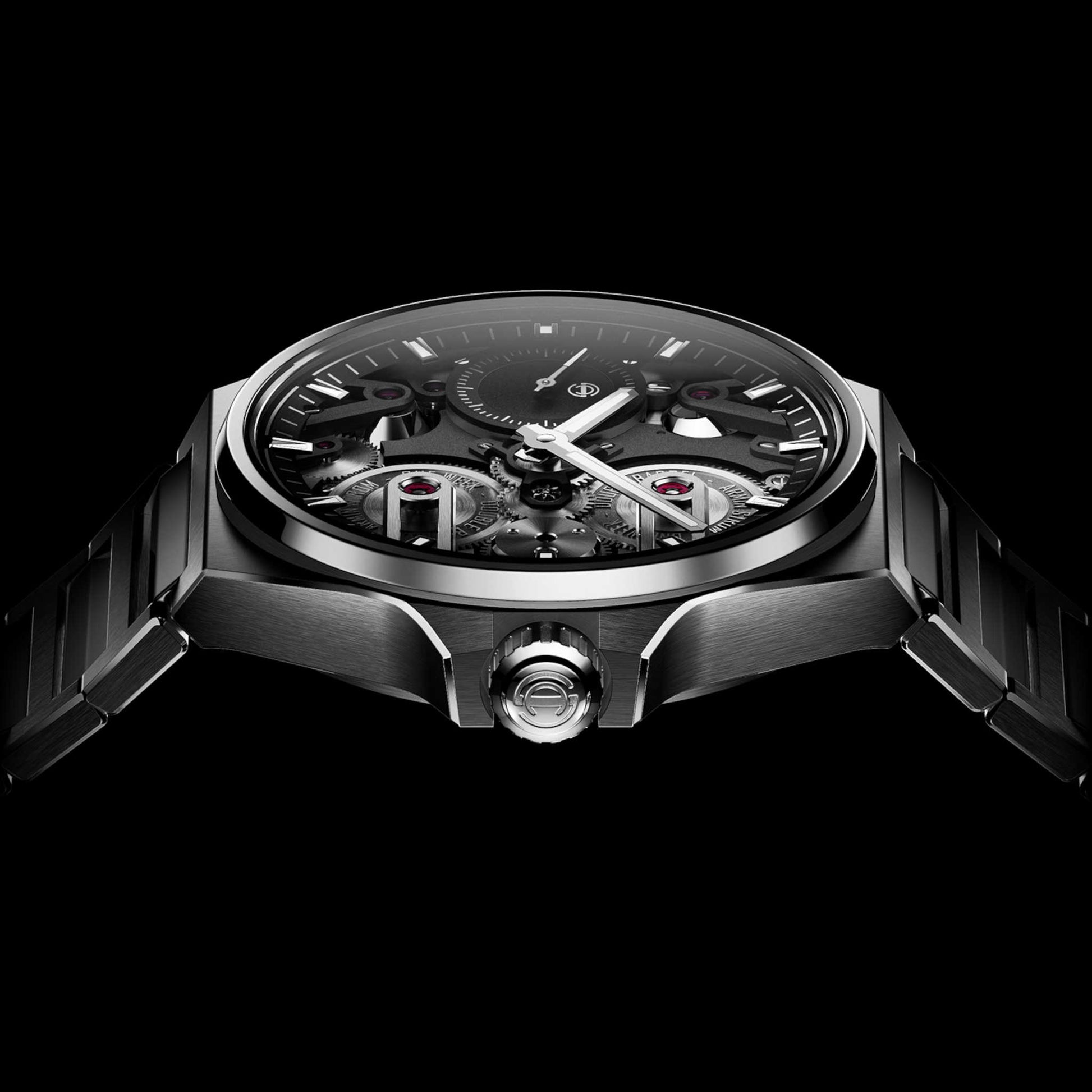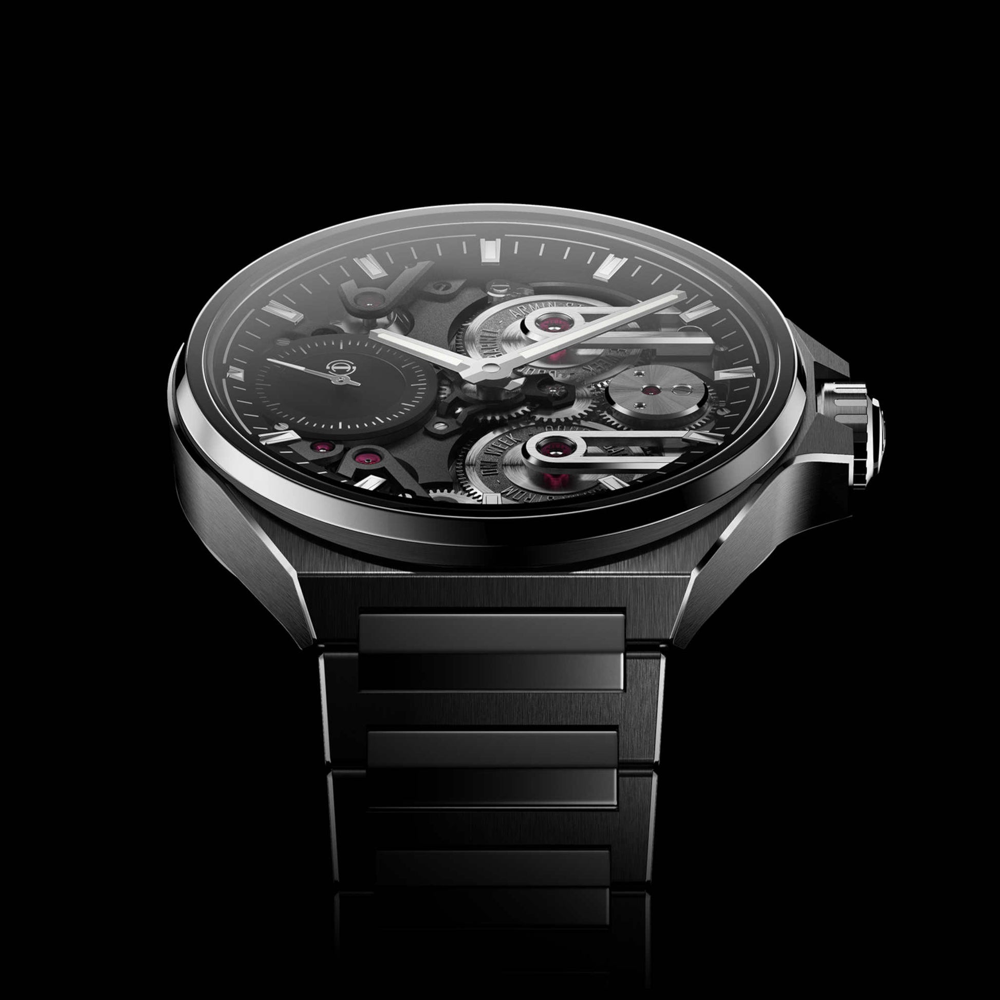 41mmのステンレススティール製ケースと一体型ブレスレットを備え、アントラサイトPVD仕上げのメインプレートとブリッジが立体的な陰影を生み出します。
