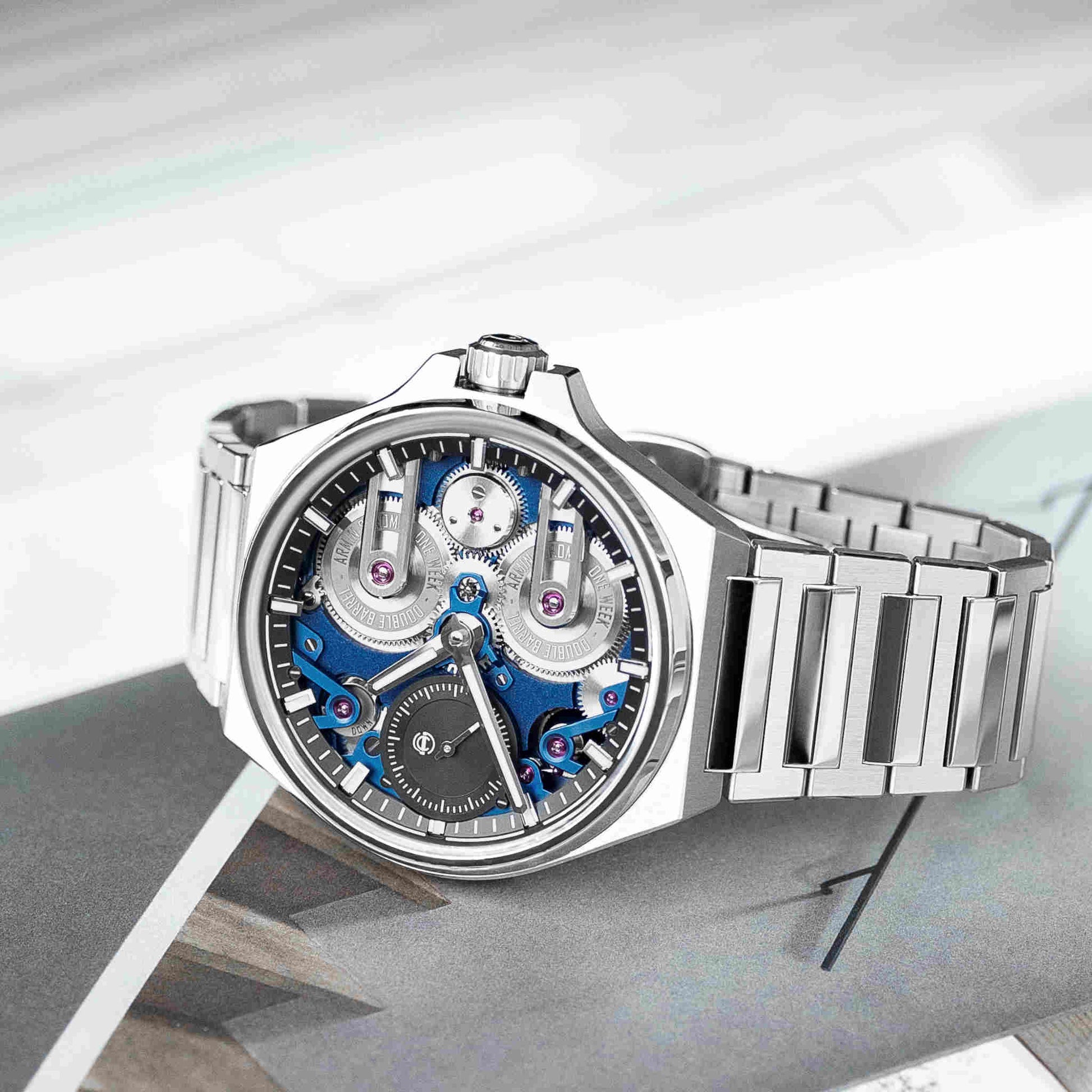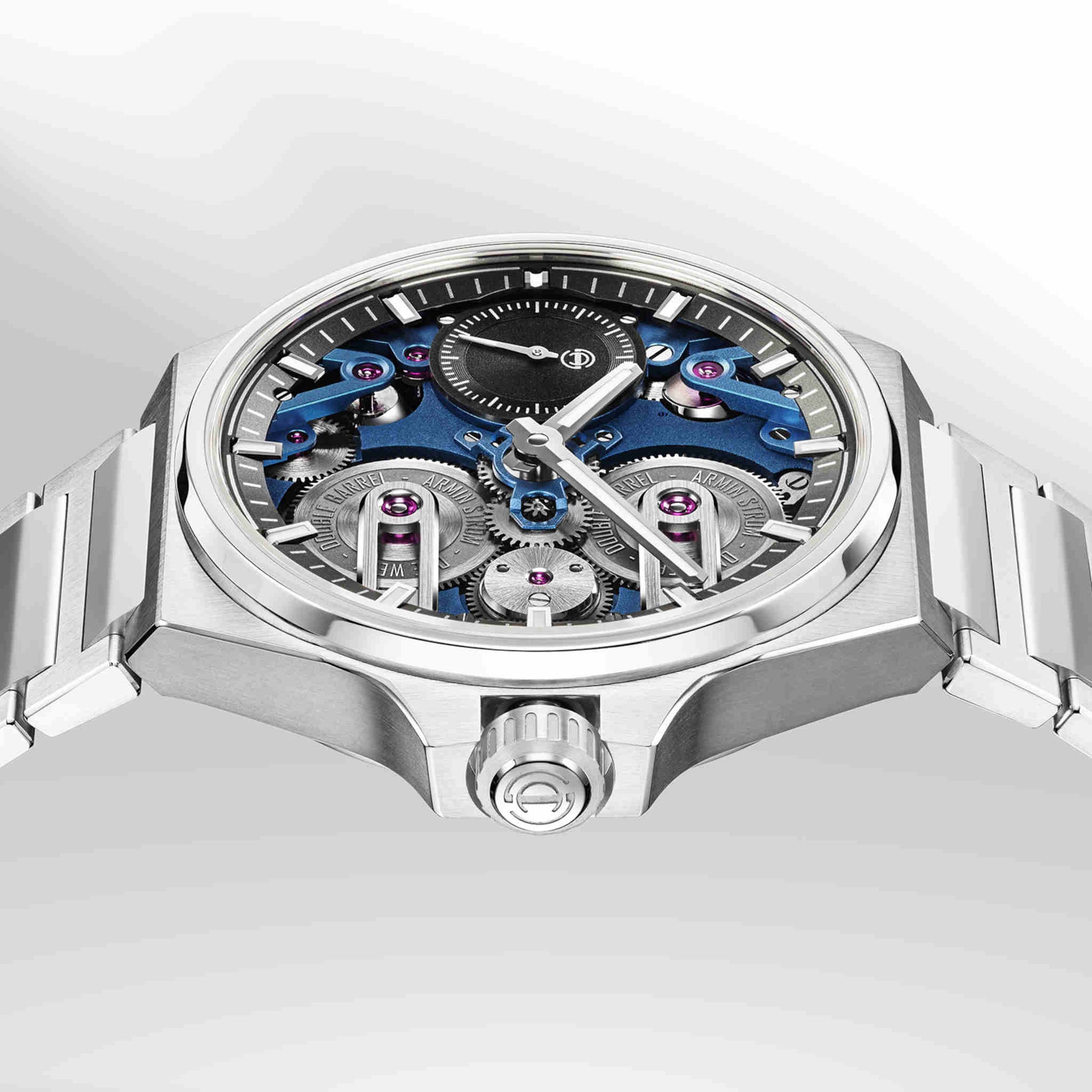 41mmのステンレススティール製ケースに収められたこのモデルは、伝統的な文字盤を排し、ブルーPVD仕上げのメインプレートをデザインの中心に据えています。