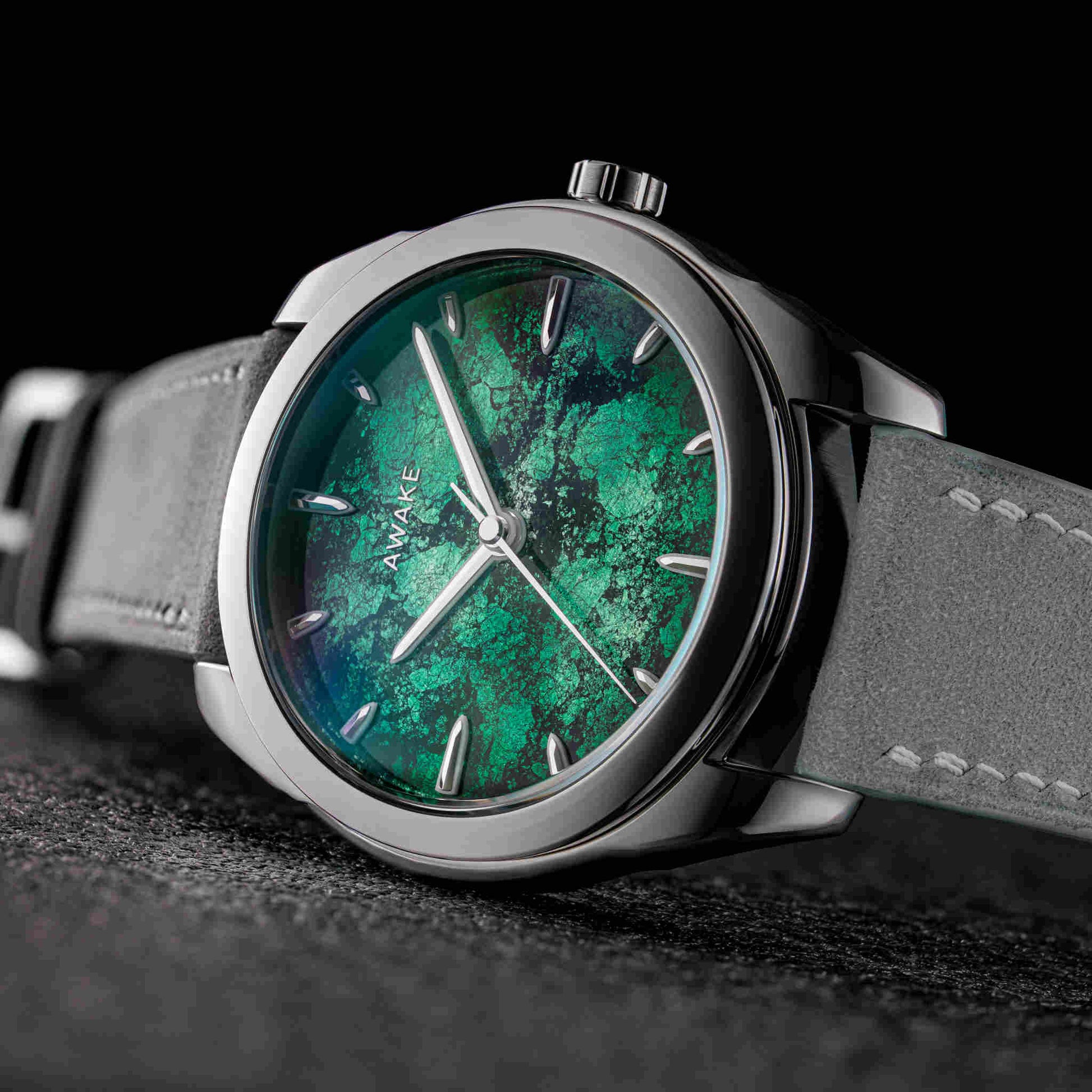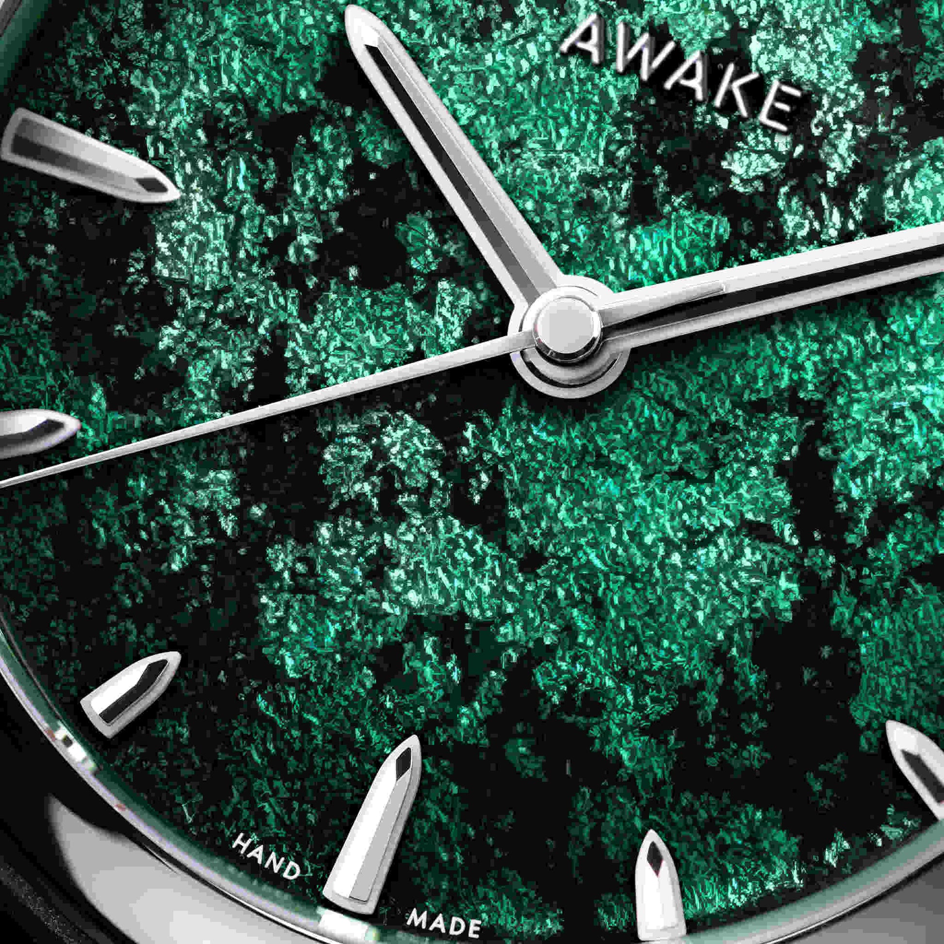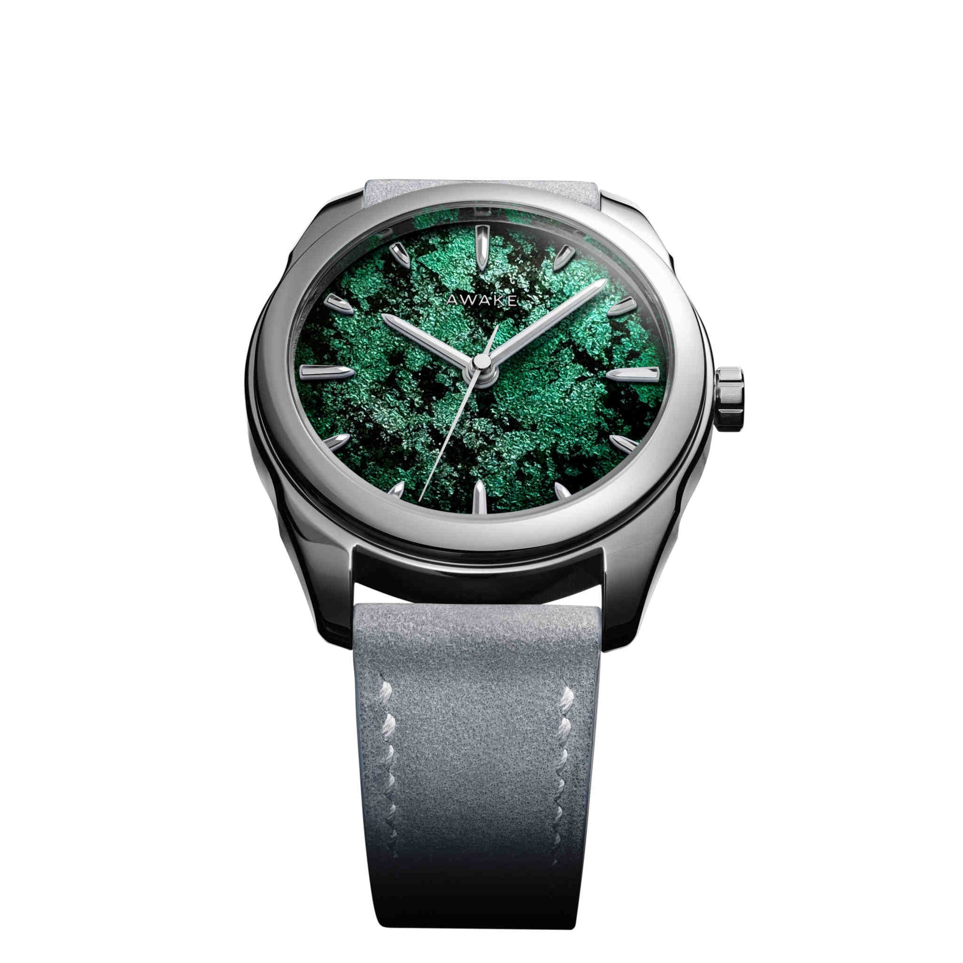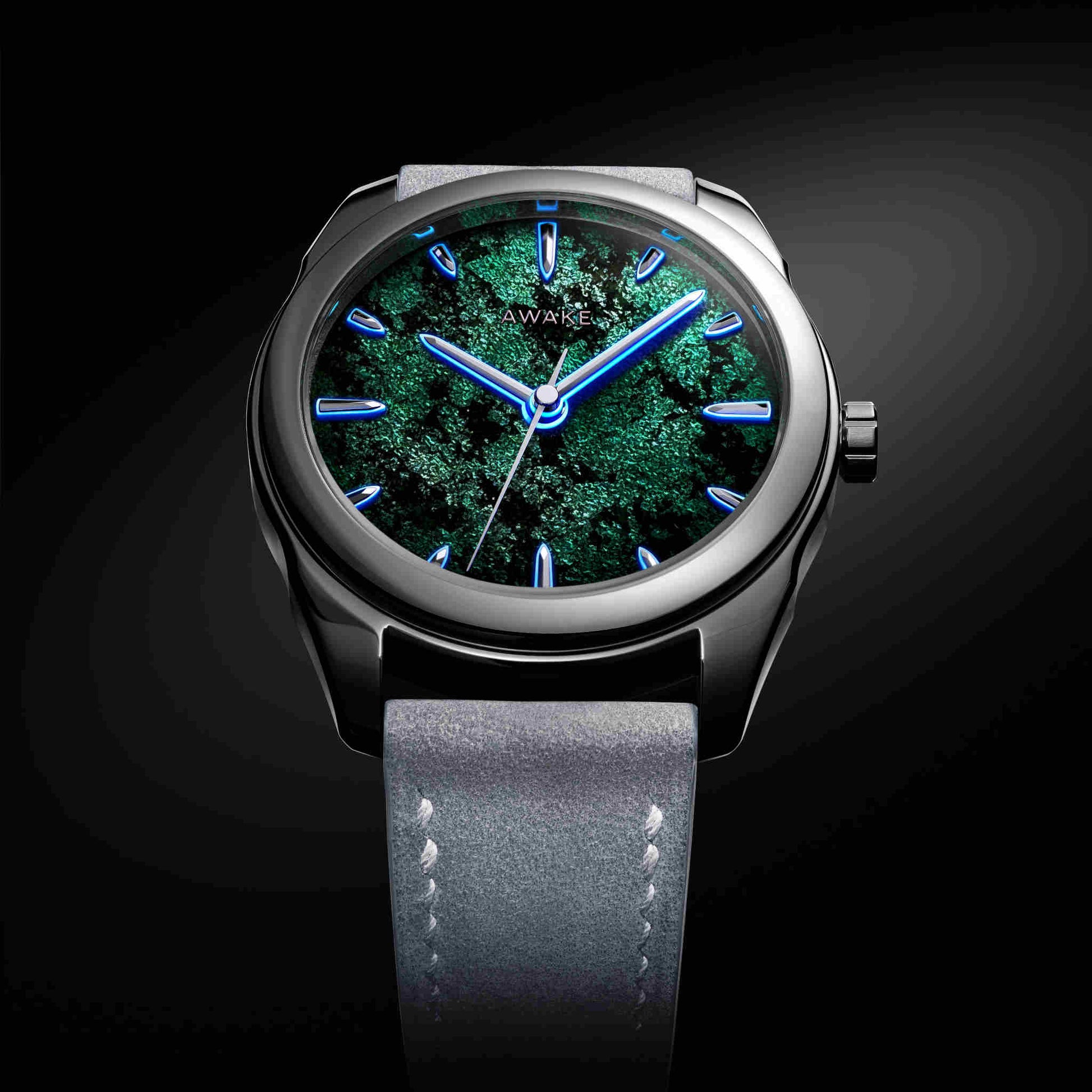 生命の象徴ともいえるグリーンダイヤルは、森の静謐さや自然の息吹を映し出します。伝統漆芸と銀箔を重ね合わせた「フロステッドリーフ」技法によって、有機的で奥行きのある質感が実現。静けさとエネルギーを併せ持つ色合いは、自然との深い調和を感じさせます。La Joux-Perret製ムーブメントを搭載し、クラフトと現代性を融合したこのモデルも、世界限定50本の希少な存在です。