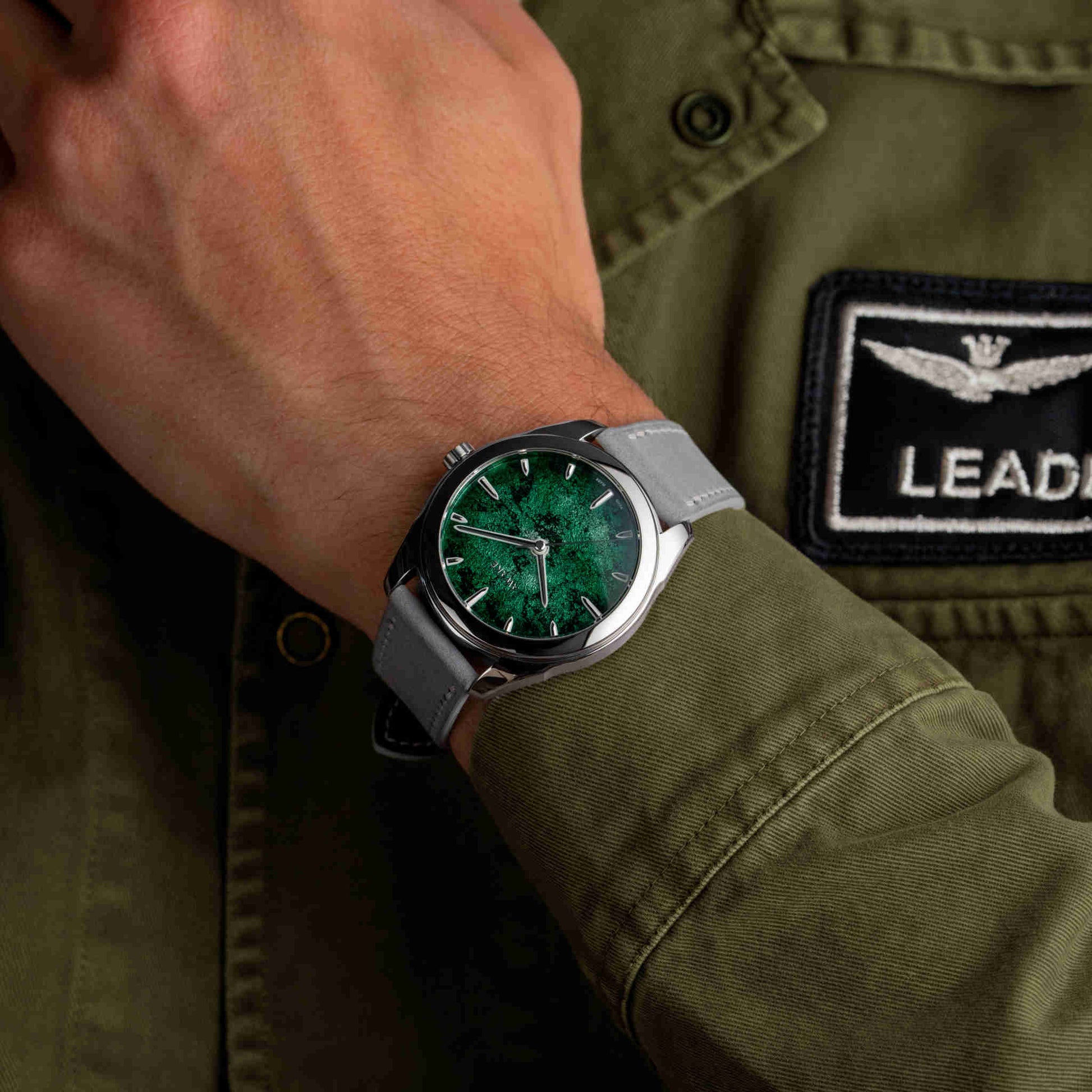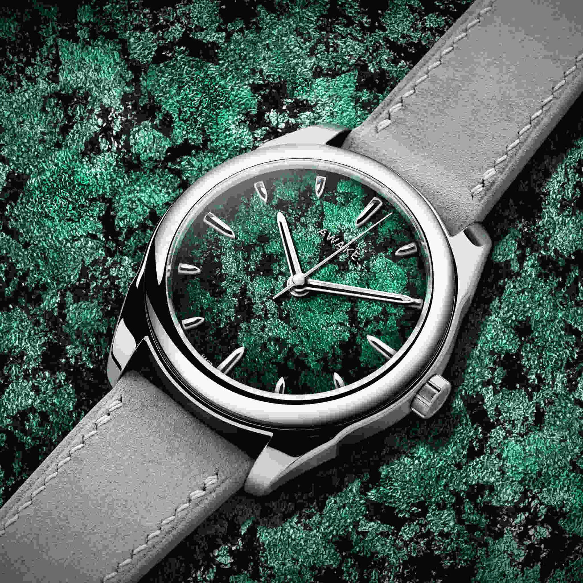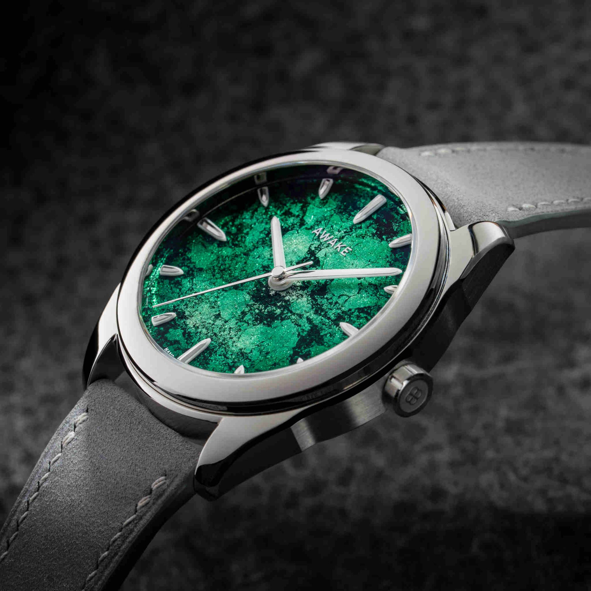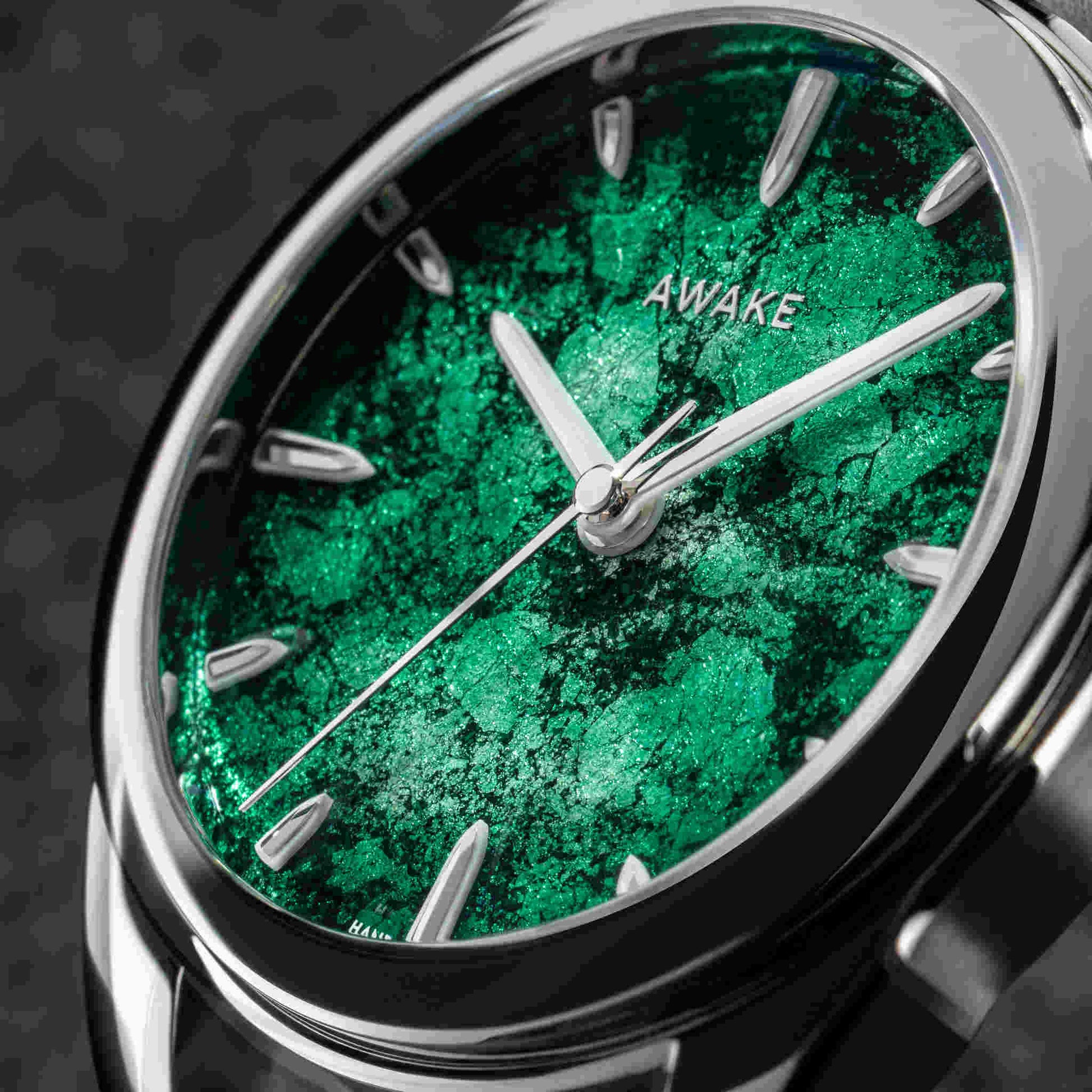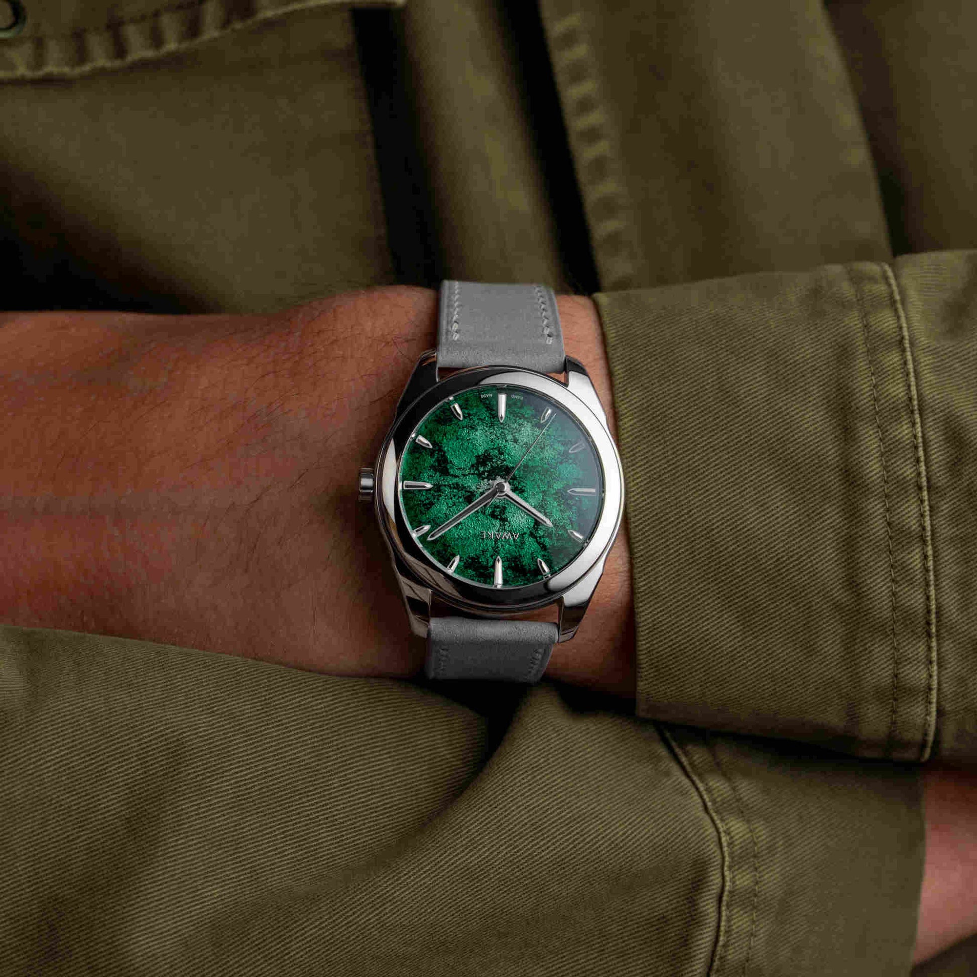 生命の象徴ともいえるグリーンダイヤルは、森の静謐さや自然の息吹を映し出します。伝統漆芸と銀箔を重ね合わせた「フロステッドリーフ」技法によって、有機的で奥行きのある質感が実現。静けさとエネルギーを併せ持つ色合いは、自然との深い調和を感じさせます。La Joux-Perret製ムーブメントを搭載し、クラフトと現代性を融合したこのモデルも、世界限定50本の希少な存在です。
