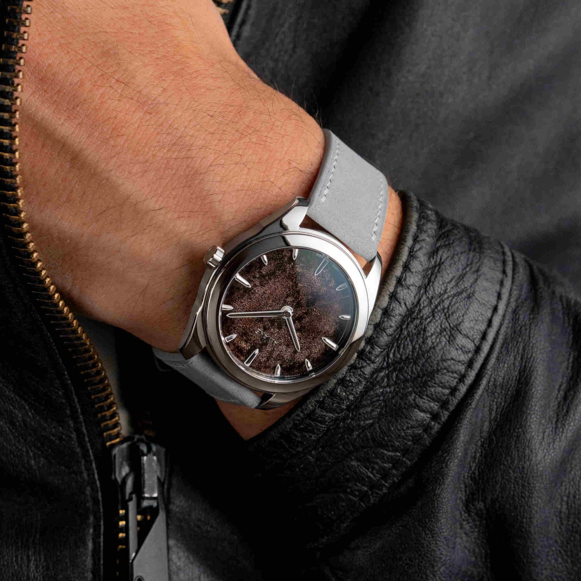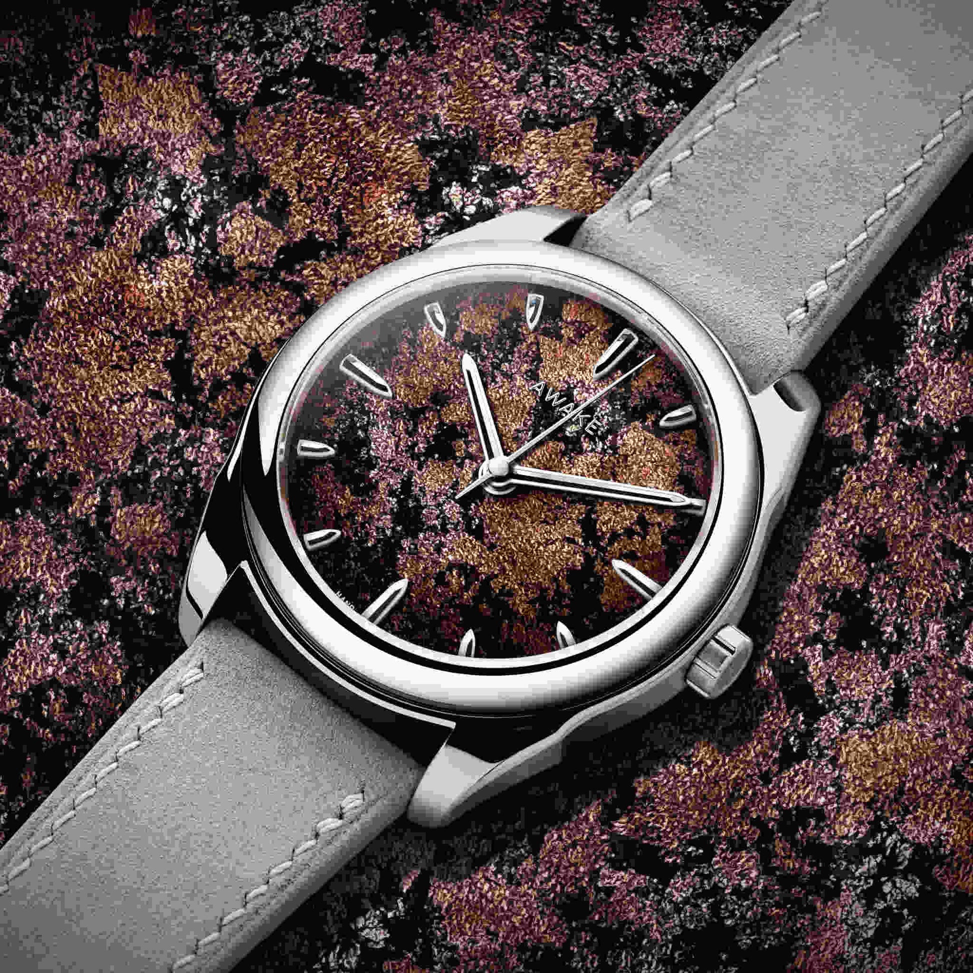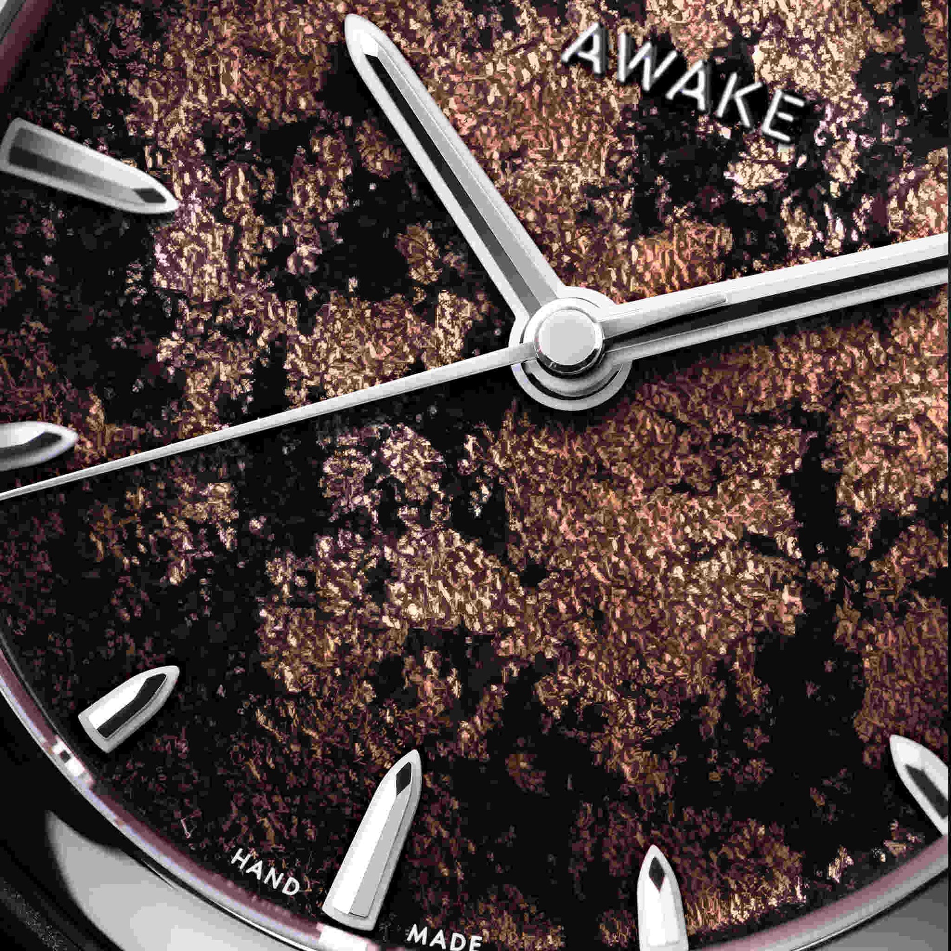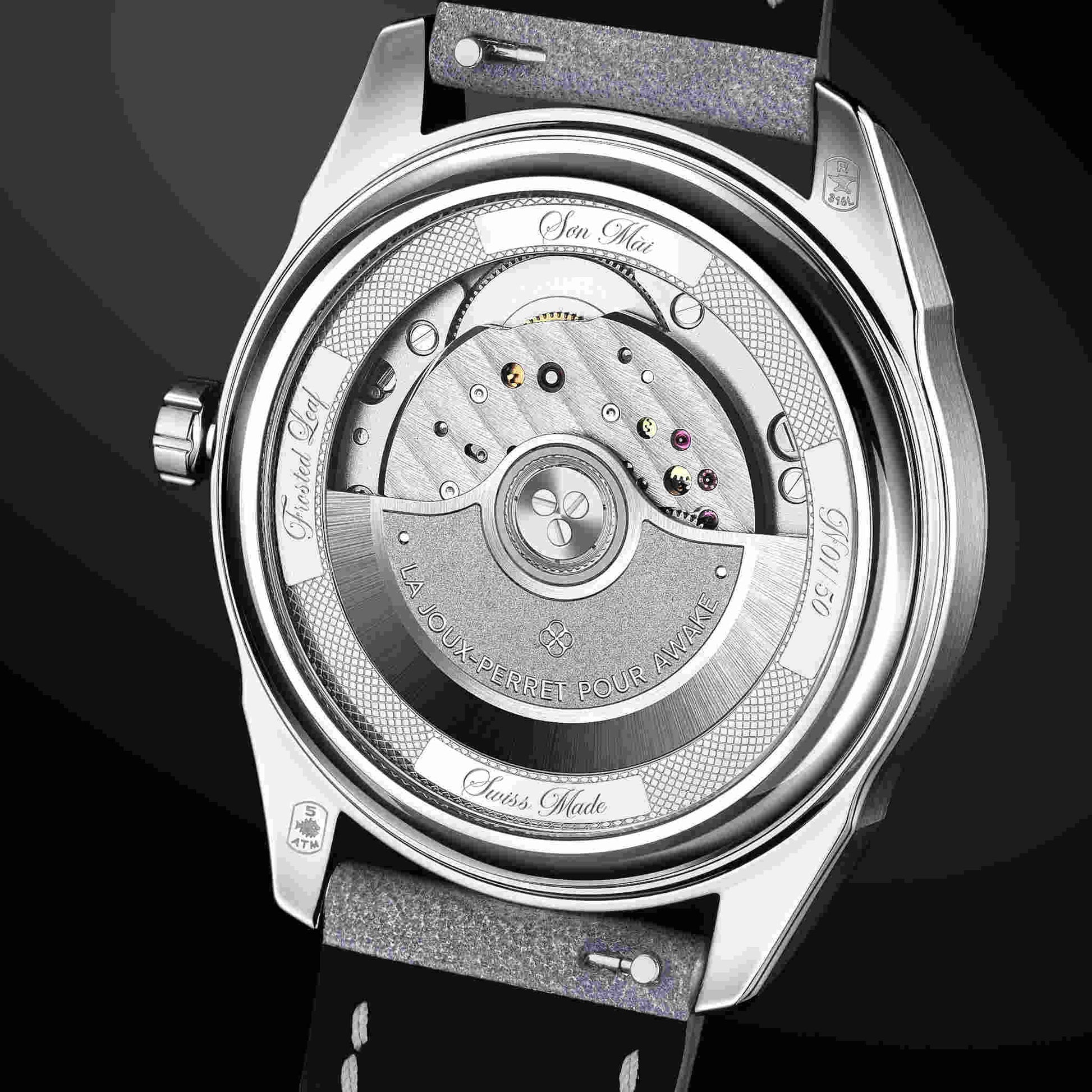 温もりあるモカブラウンのダイヤルは、大地の豊かさと根源的な力強さを表現しています。ベトナム伝統の漆芸「ソンマイ」と純銀箔を融合させた新技法「フロステッドリーフ」により、奥行きと霜のような光沢が生まれ、一本ごとに異なる表情を見せます。15時間にわたる手仕事とスイス製La Joux-Perret G101自動巻きムーブメントが結実したこのモデルは、世界限定50本の特別なアートピースです。