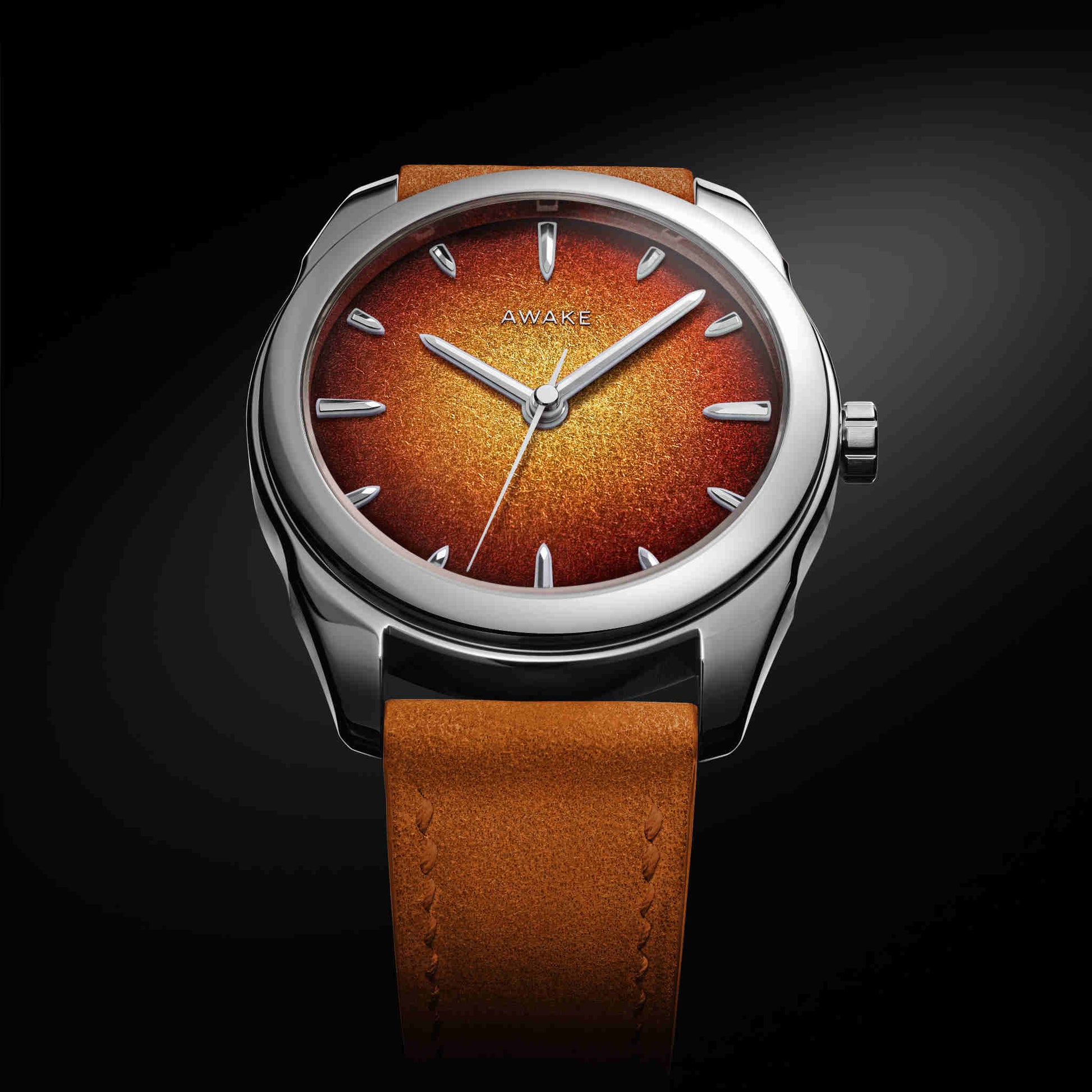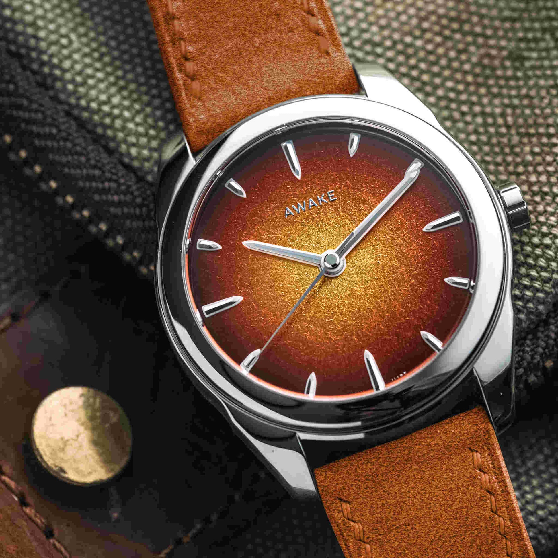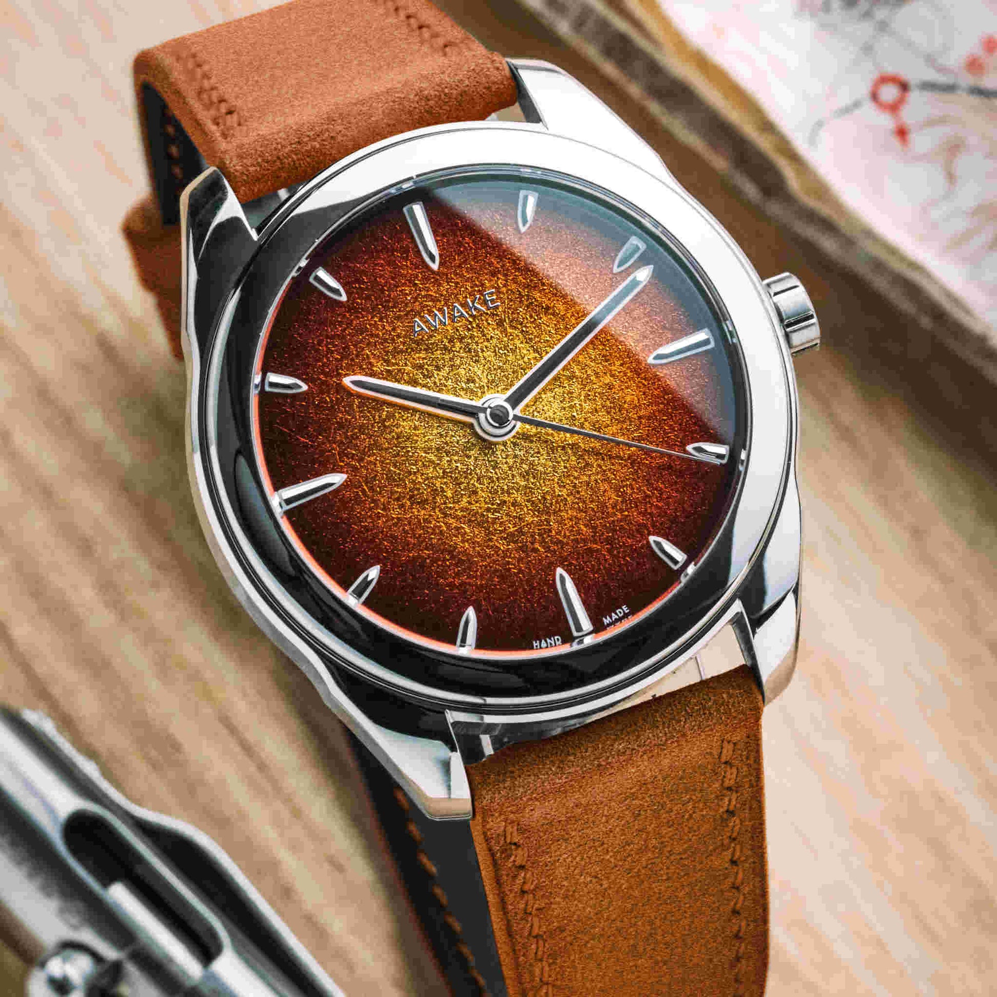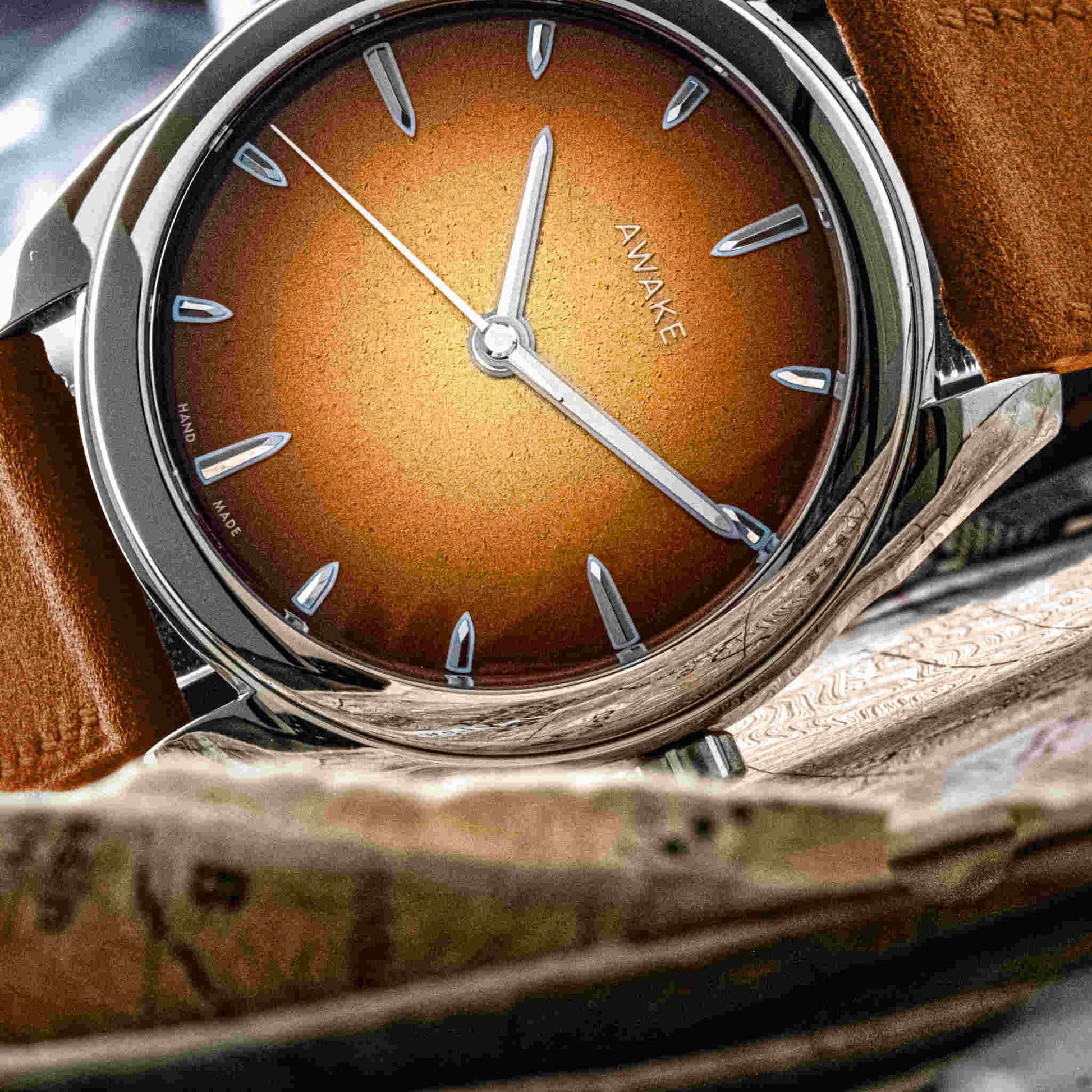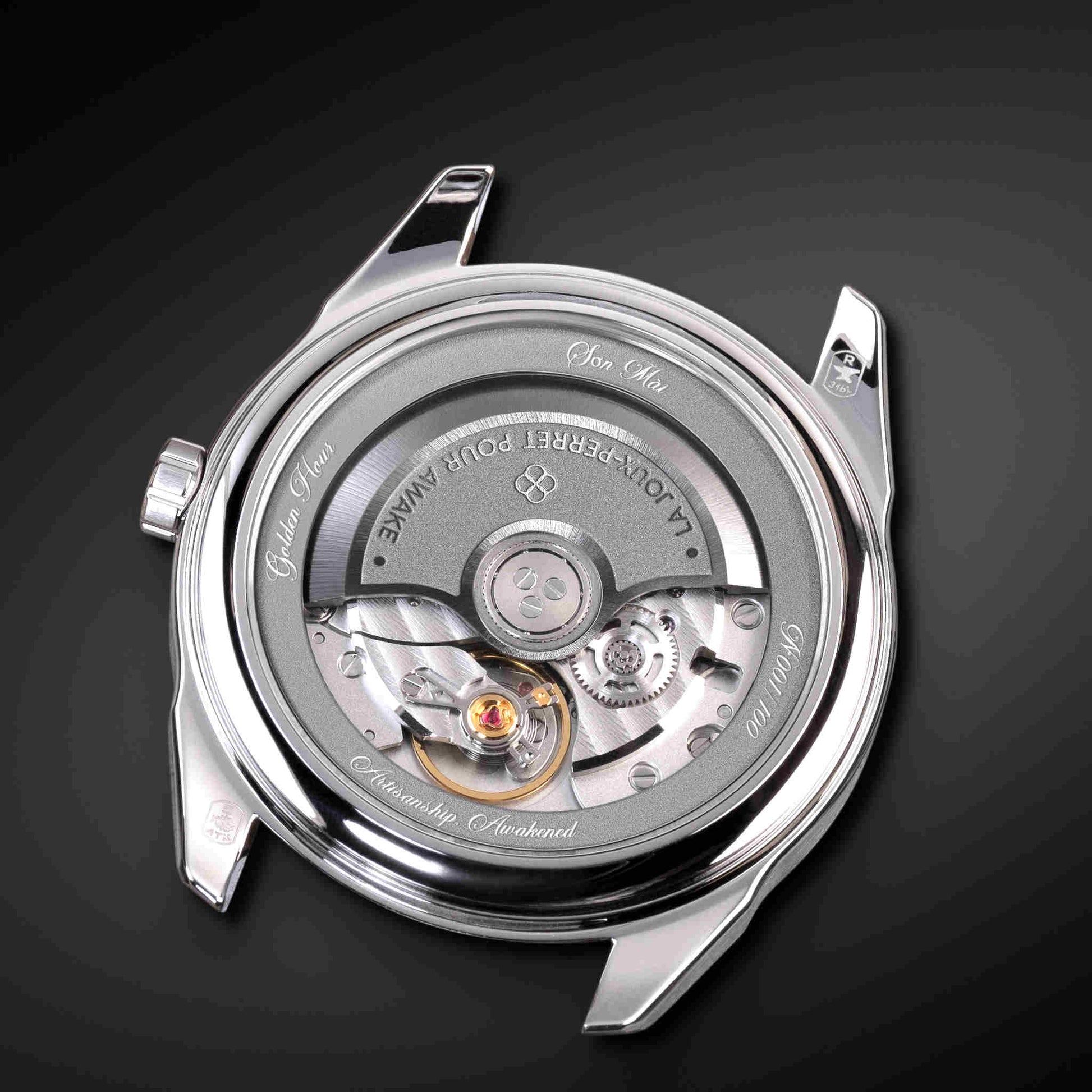 朝夕の「ゴールデンアワー」に見られる柔らかな光の温度を、漆の深みと金属の反射で再構築。ハノイの職人による完全手仕上げで仕上げられた文字盤は、ひとつとして同じものがありません。