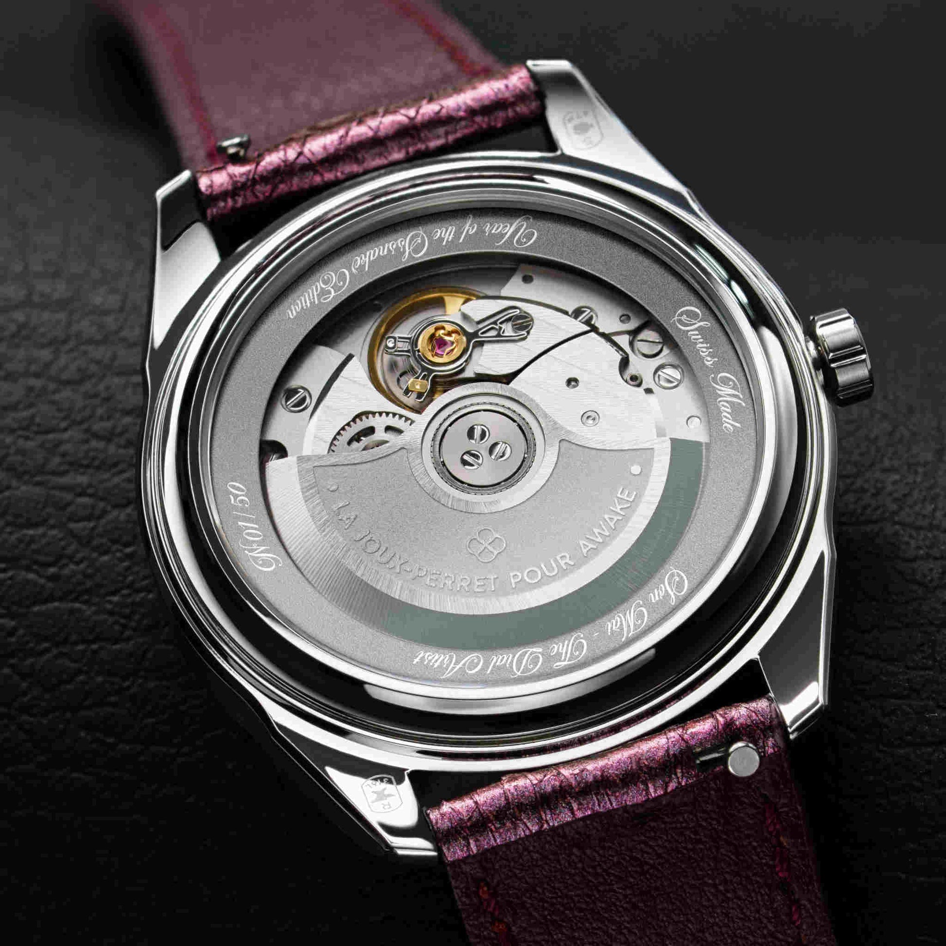 ベトナム・ハノイの漆職人による天然ラッカー仕上げと、The Dial Artistによる手描きの蛇柄モチーフ。光の加減で変化する奥行きある質感は一本ごとに異なり、唯一無二の存在感を放ちます。ロゴやインデックスを排した純粋なアートピースともいえるモデルであり、蛇の鱗を思わせる模様が光を受けて妖しく輝き、夜になるとAWAKE独自のルミナス・シグネチャーが闇の中でひそやかに輝き、蛇の気配を纏うように時を刻みます。