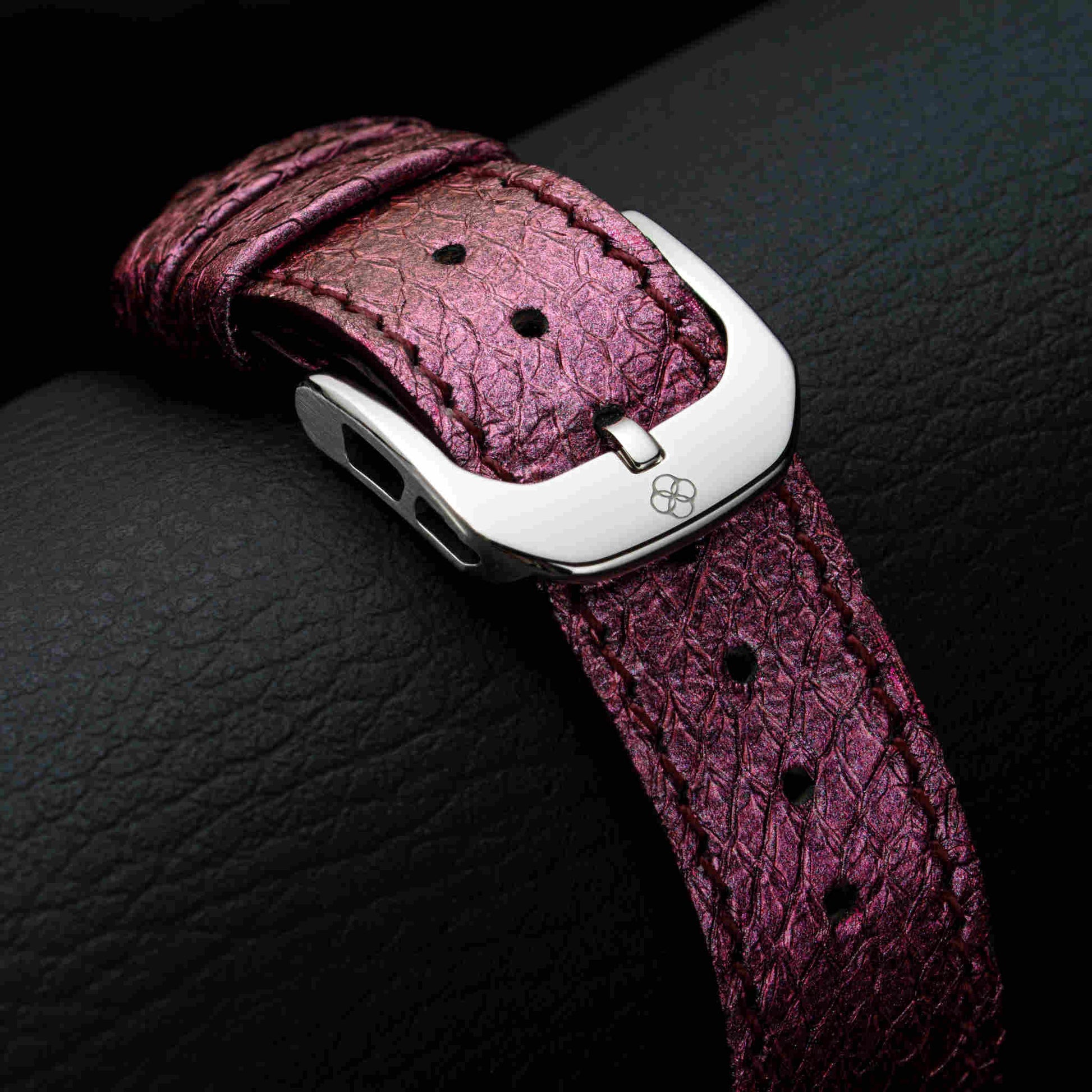 メタリック・パープルのウルトラ・トラウト レザーストラップ/ バーガンディーカーフのライニング/ ステンレススティール製ピンバックル。