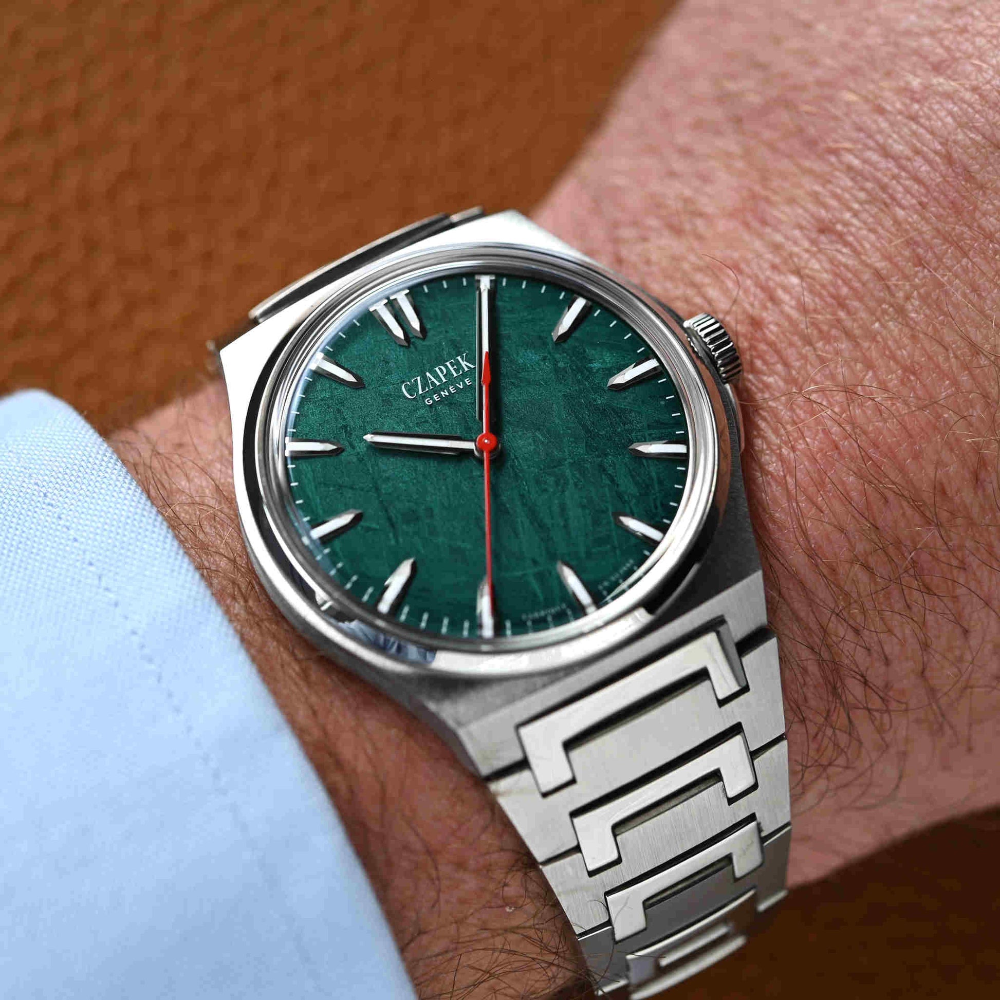 チャペック アンタークティック グリーン・メテオは、ナミビアに落下した約6億年前のギベオン隕石から削り出したメテオライト・ダイヤルを採用した限定100本のモデルです。