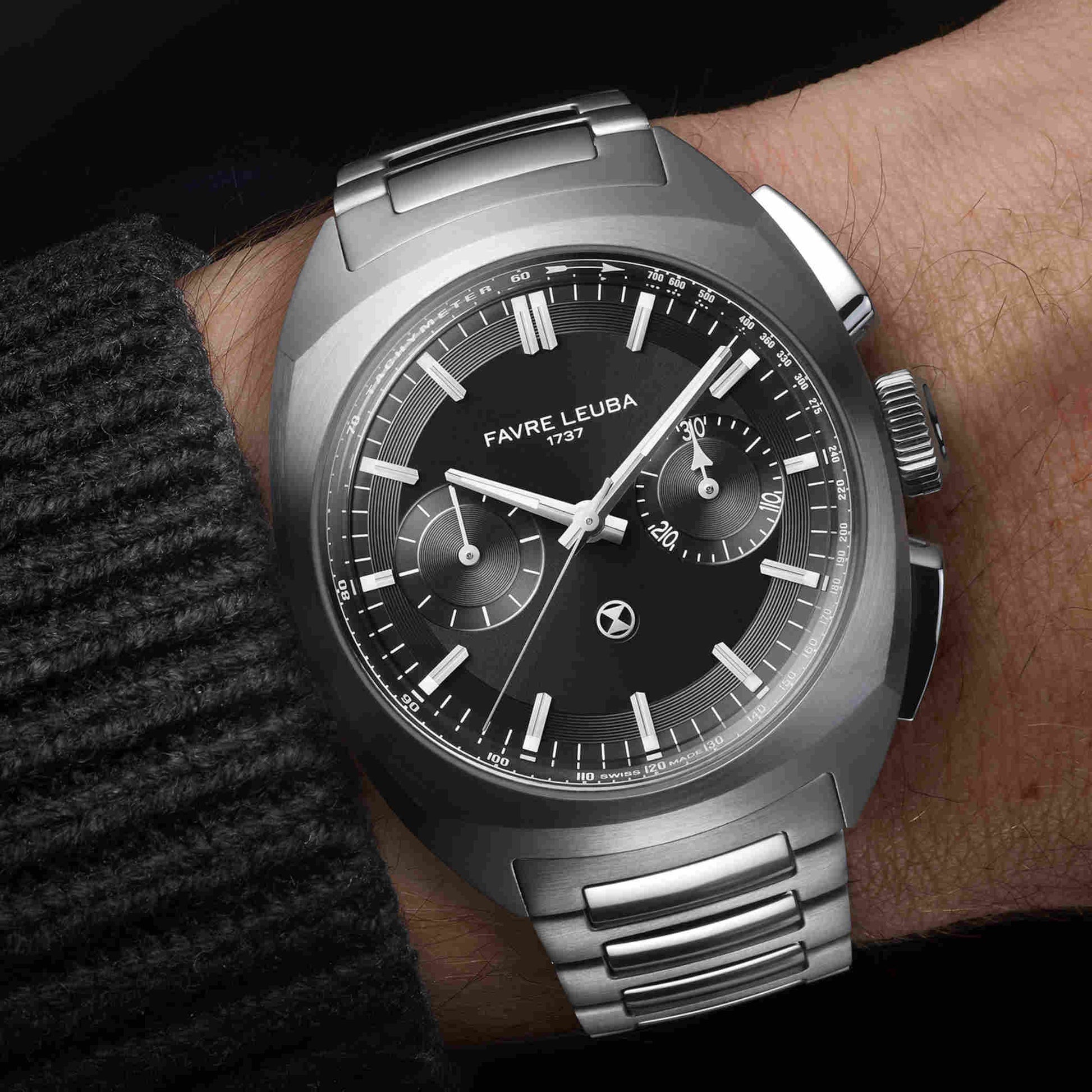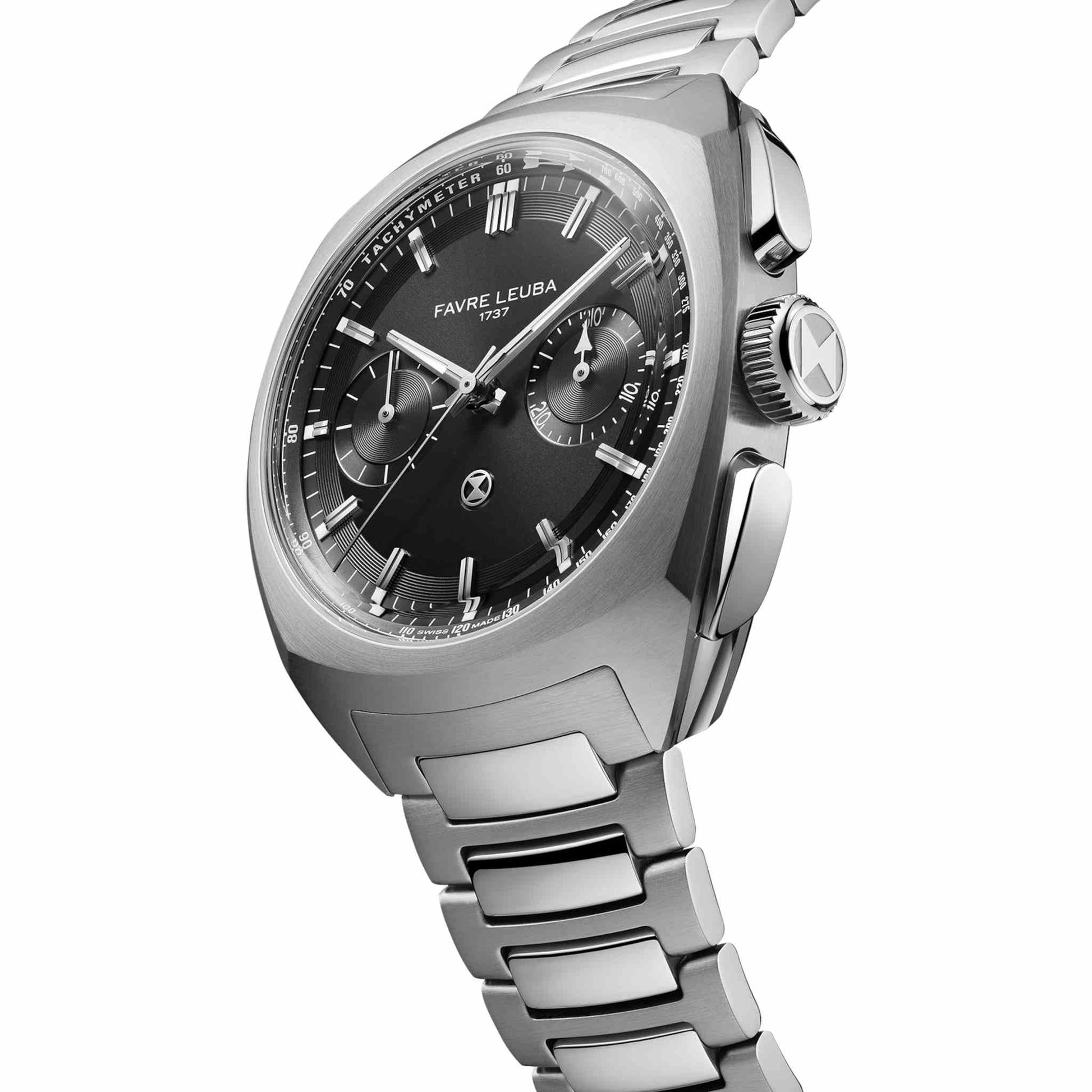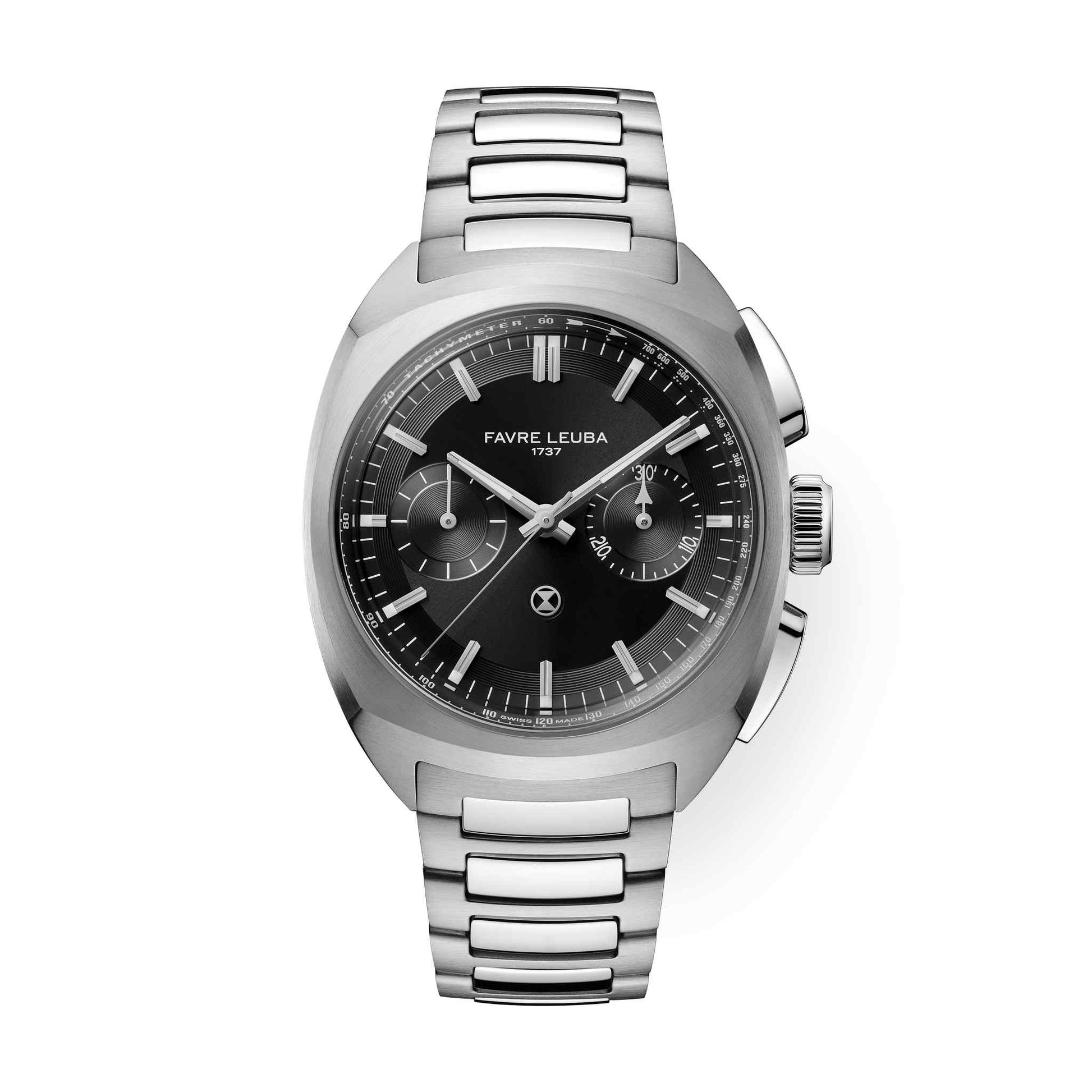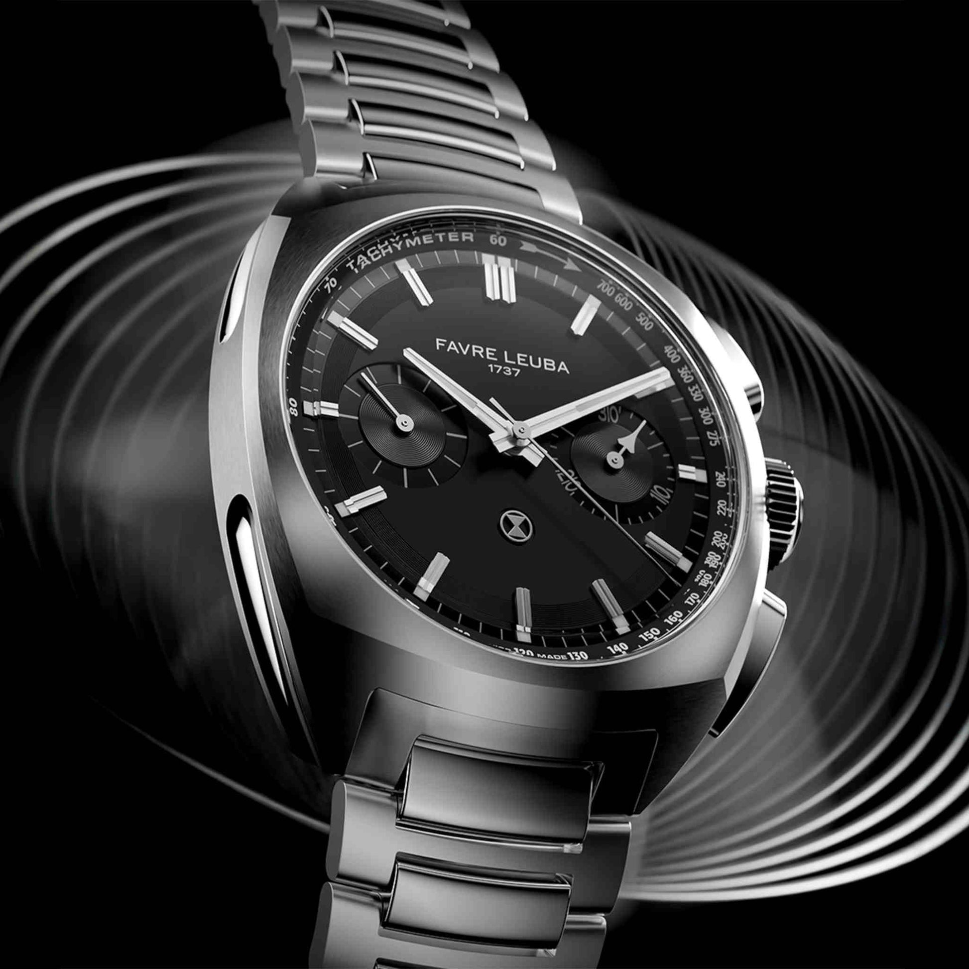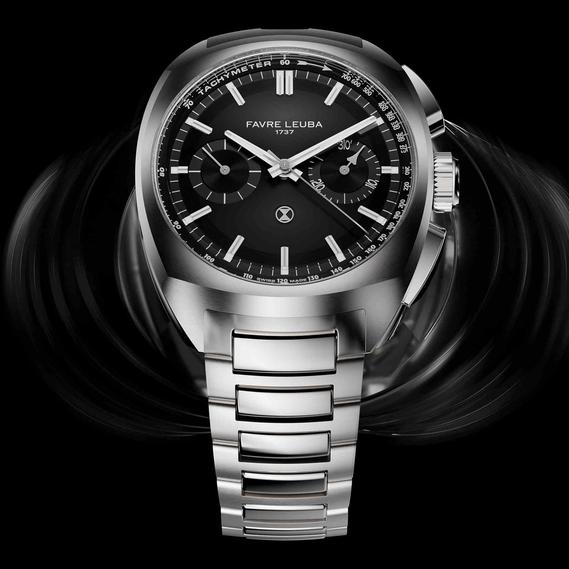 チーフ・クロノグラフ ブラックダイヤル × ブレスレットは、41mm径・厚さ14mmのクッションケースを持つ本格クロノグラフ。サンレイ仕上げのダイヤルに円形ブラッシュのサブダイヤルを配し、タキメータースケールを内周に備えます。ムーブメントはLa Joux-Perret L113をベースとしたキャリバー FLC02(コラムホイール式)で約60時間駆動。サファイアクリスタルのケースバックからはジュネーブストライプやペルラージュ仕上げが覗きます。Super-LumiNova X1による夜間視認性と100m防水、統合ブレスレット仕様で堅牢性と洗練を両立します。