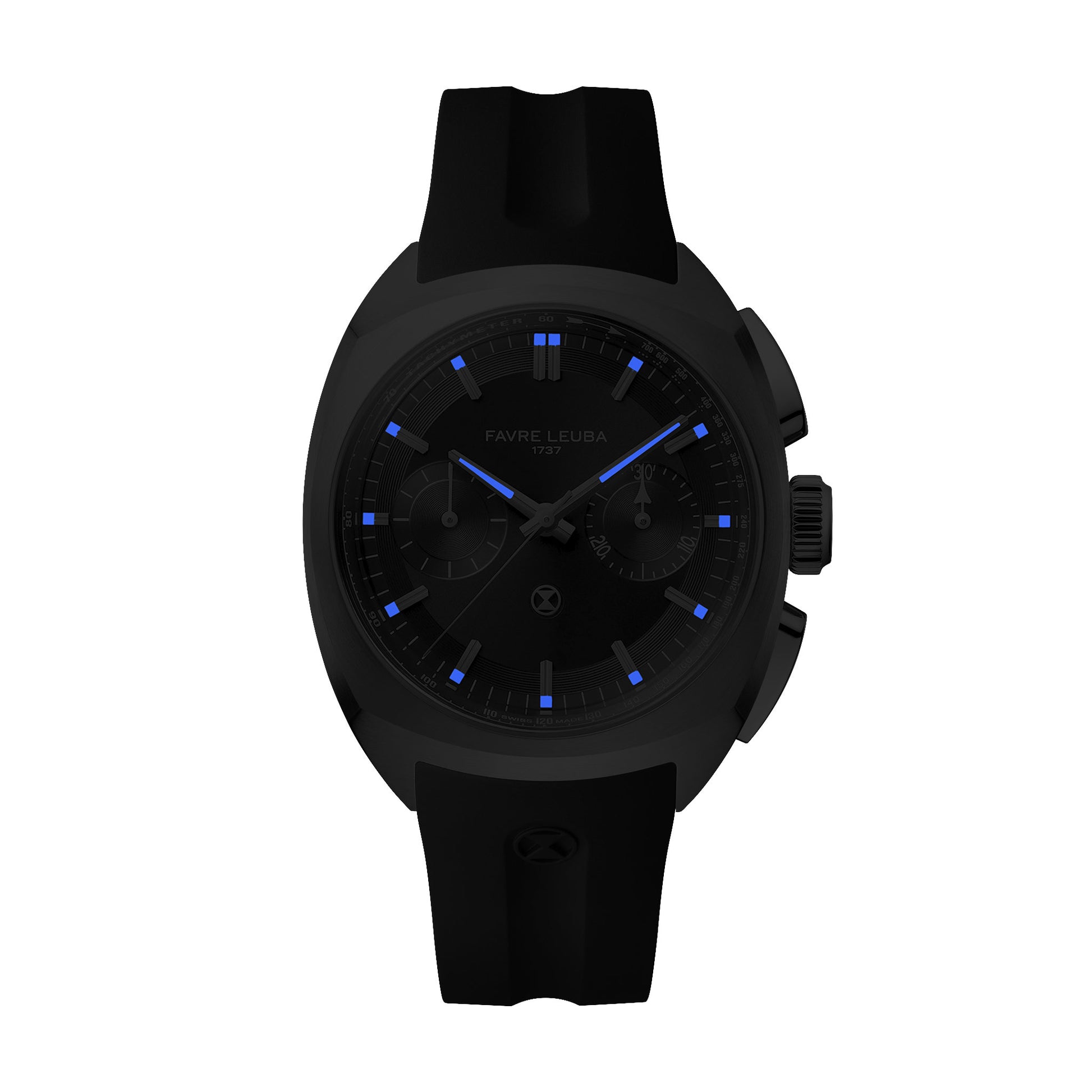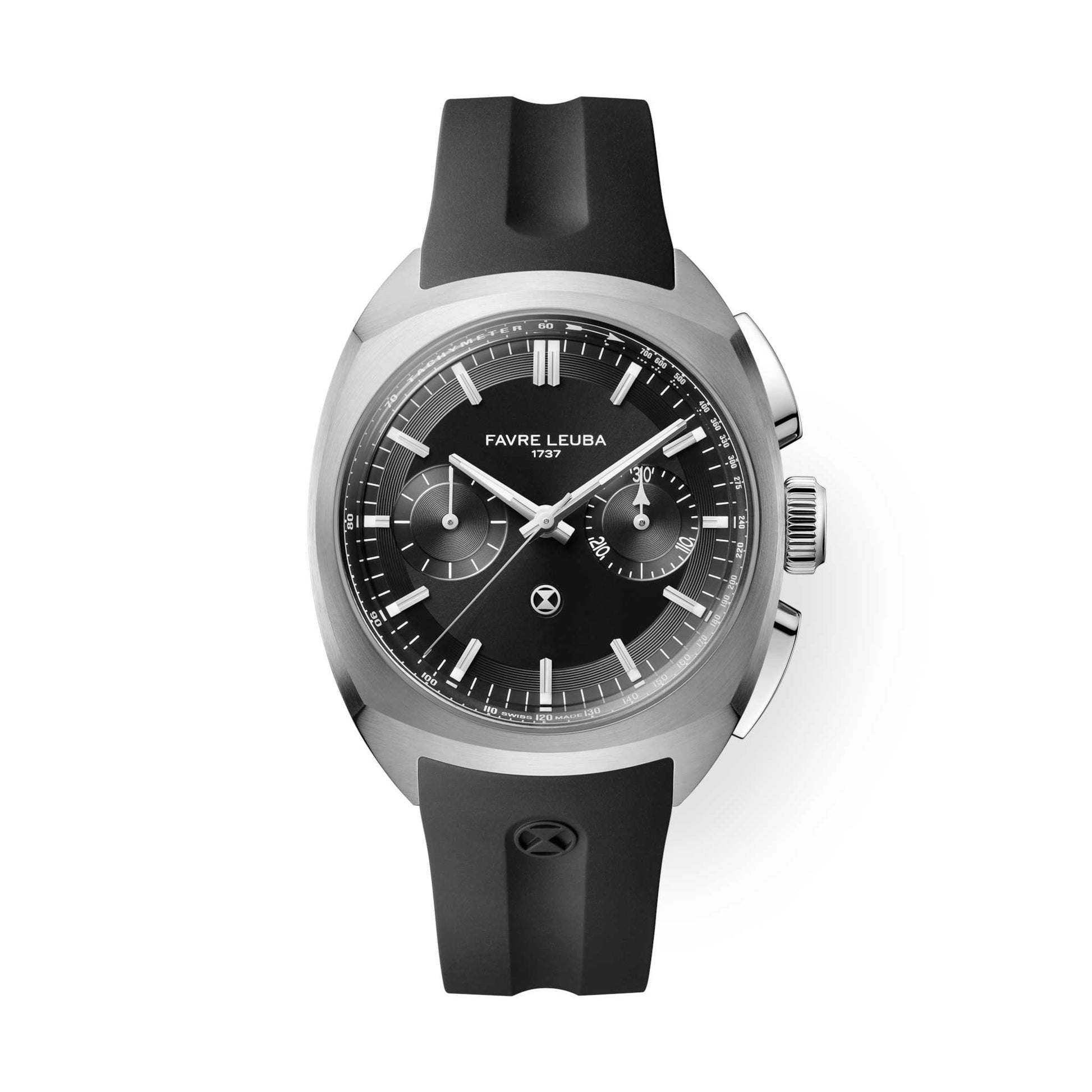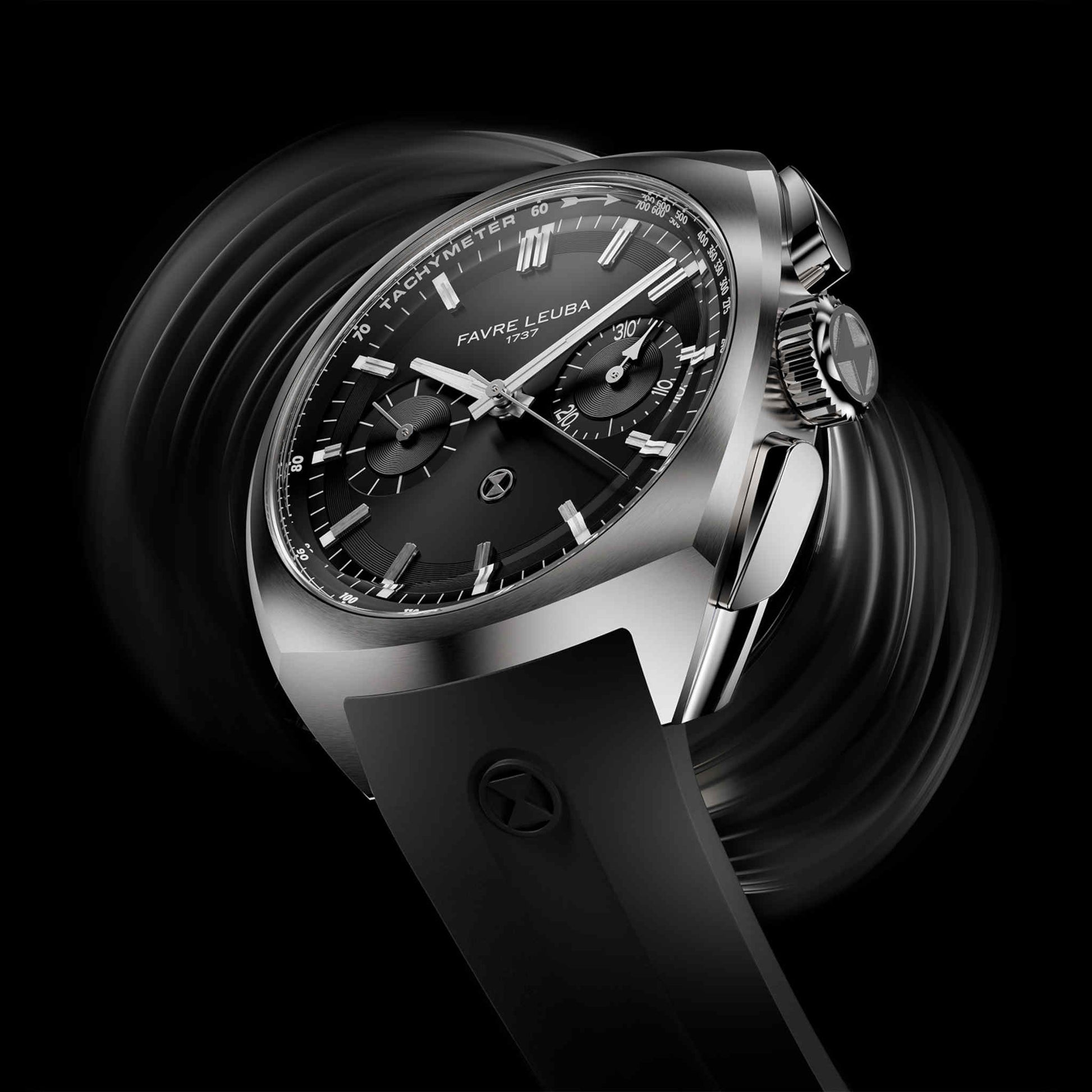 ブラックダイヤルにスポーティなラバーストラップを合わせたチーフ・クロノグラフ。41mm径のステンレススティール製のケースは厚さ14mmで、サンレイ仕上げとブラッシュ仕上げのサブダイヤルがコントラストを生みます。La Joux-Perret L113をベースとしたキャリバー FLC02を搭載し、コラムホイール制御で約60時間のパワーリザーブを誇ります。サファイアケースバック越しに見える装飾仕上げが美しく、Super-LumiNova X1で暗所の視認性も確保。100m防水とラバーストラップにより、都会でもアウトドアでも活躍します。