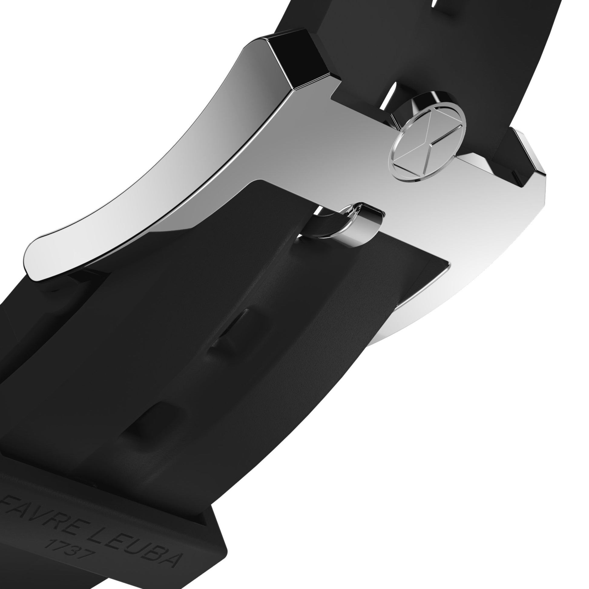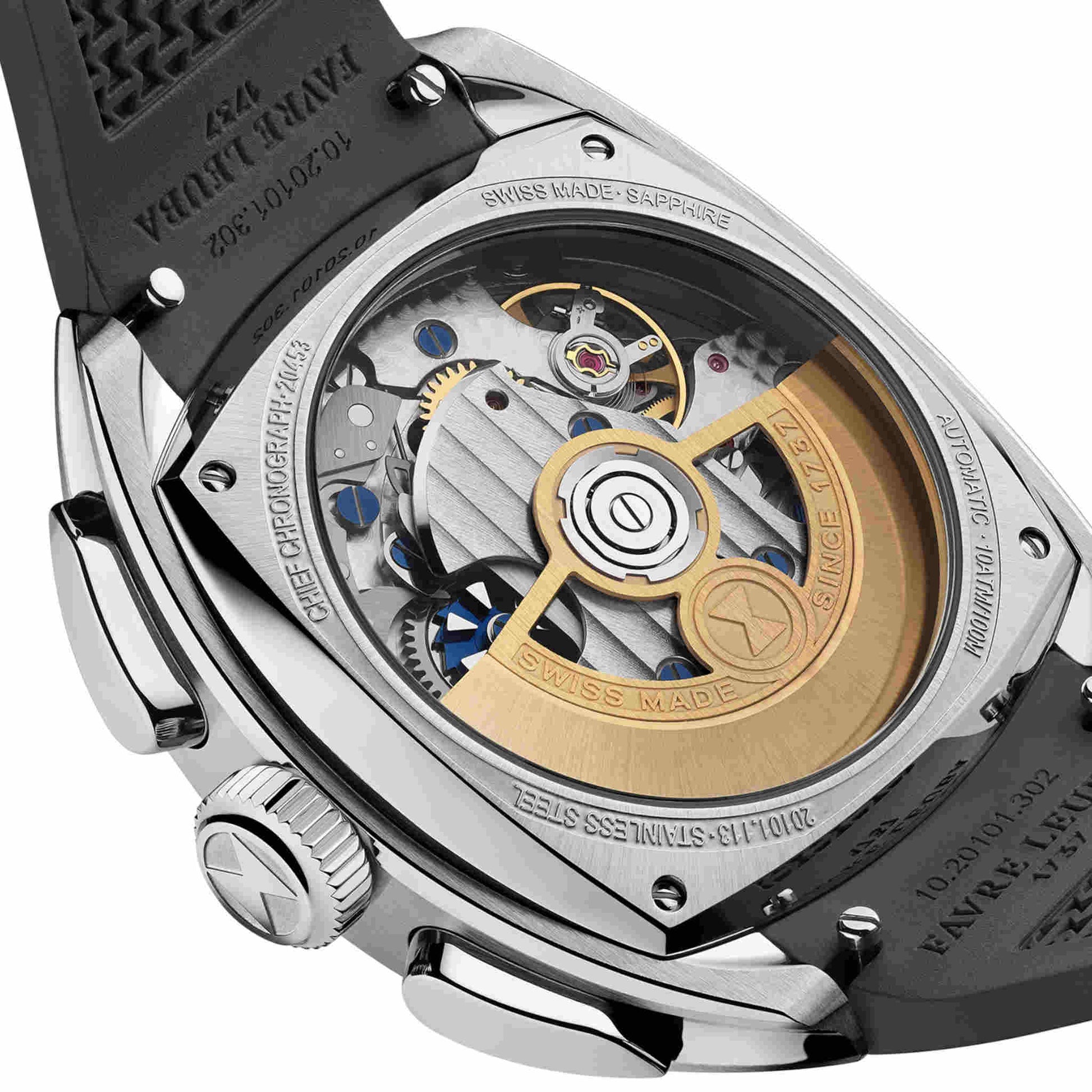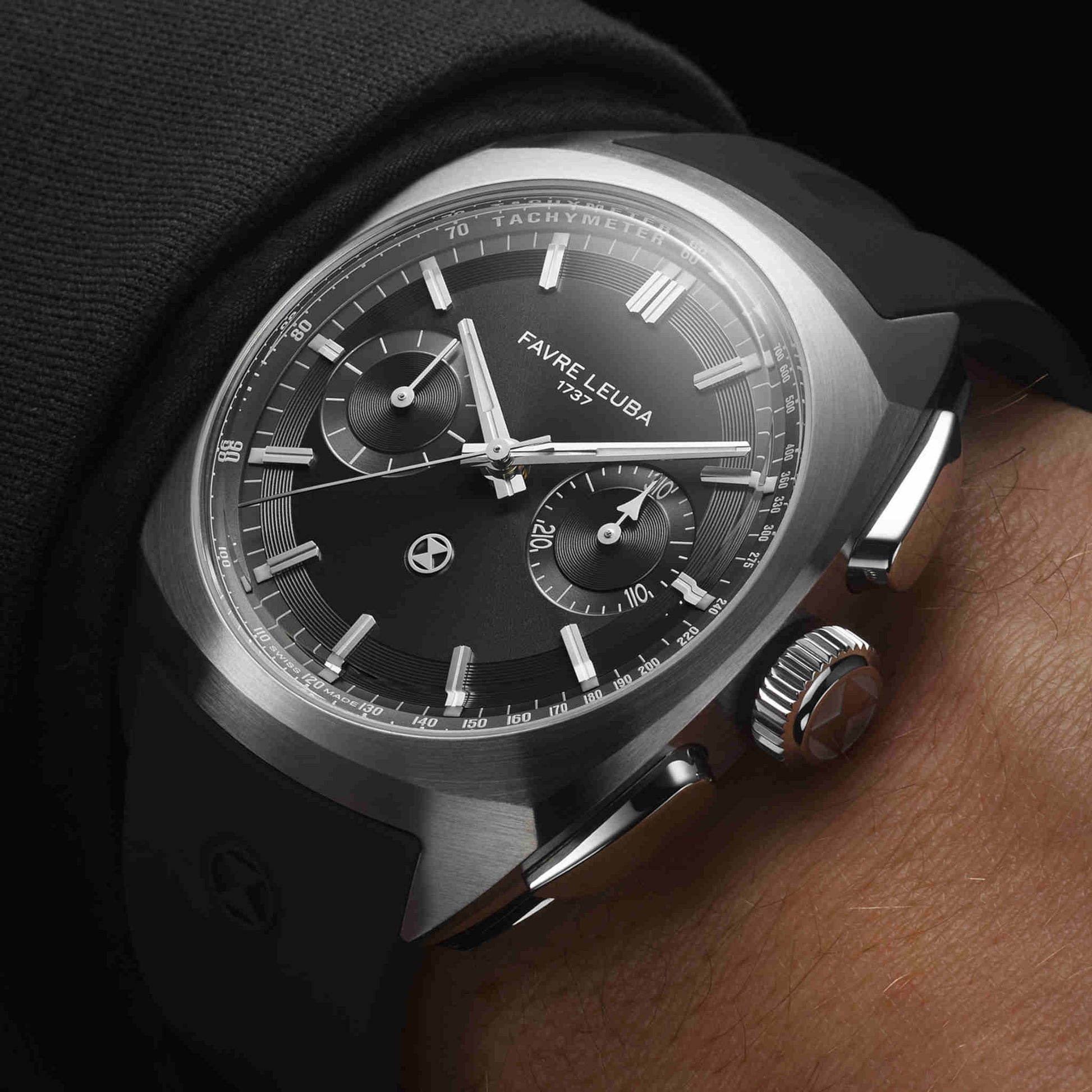 ブラックダイヤルにスポーティなラバーストラップを合わせたチーフ・クロノグラフ。41mm径のステンレススティール製のケースは厚さ14mmで、サンレイ仕上げとブラッシュ仕上げのサブダイヤルがコントラストを生みます。La Joux-Perret L113をベースとしたキャリバー FLC02を搭載し、コラムホイール制御で約60時間のパワーリザーブを誇ります。サファイアケースバック越しに見える装飾仕上げが美しく、Super-LumiNova X1で暗所の視認性も確保。100m防水とラバーストラップにより、都会でもアウトドアでも活躍します。
