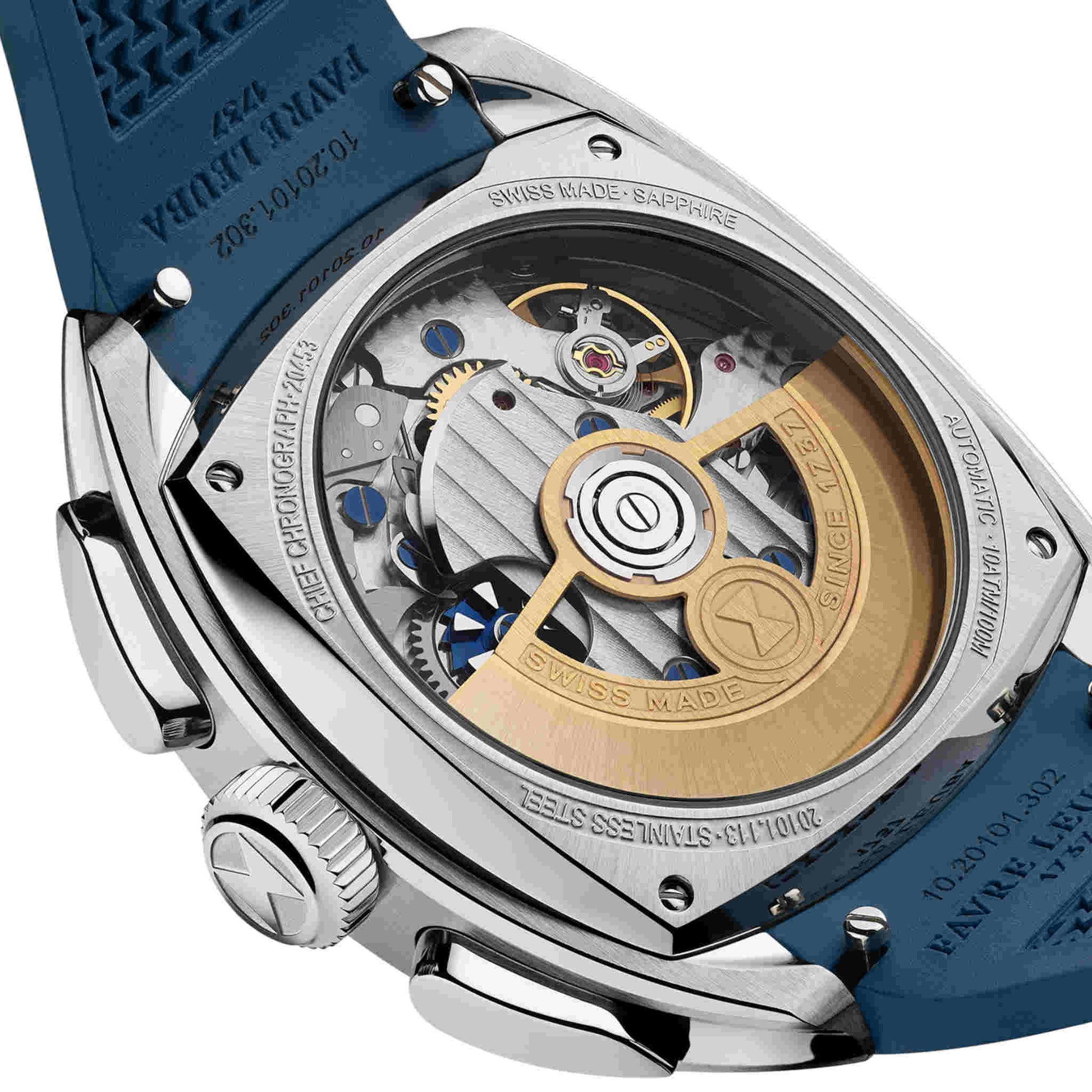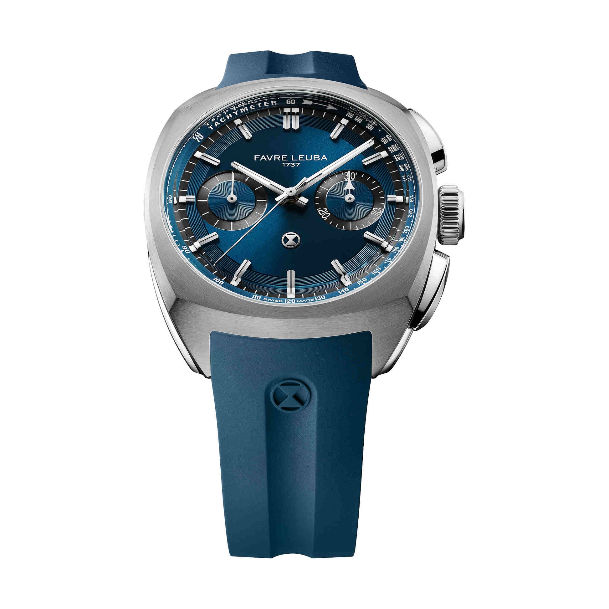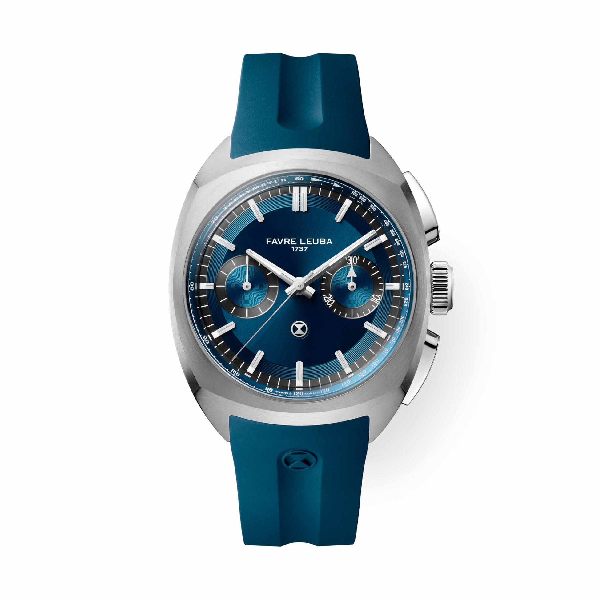 鮮やかなブルーダイヤルをラバーストラップで軽快に仕上げたチーフ・クロノグラフ。41mm径の316Lステンレススティール製ケースにサンレイ仕上げのダイヤルとコントラストの効いたサブダイヤルを配置。La Joux-Perret L113をベースとしたキャリバー FLC02を搭載し、コラムホイール制御で約60時間駆動。裏蓋はサファイアクリスタルで、精緻な仕上げを鑑賞可能。Super-LumiNova X1が暗所での視認性を確保し、100m防水とラバー仕様でアクティブシーンに最適です。