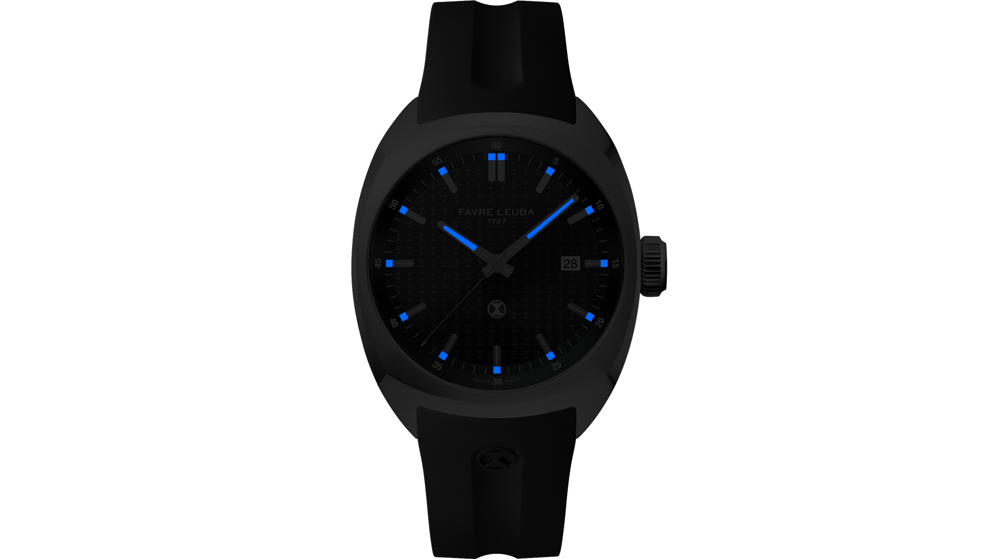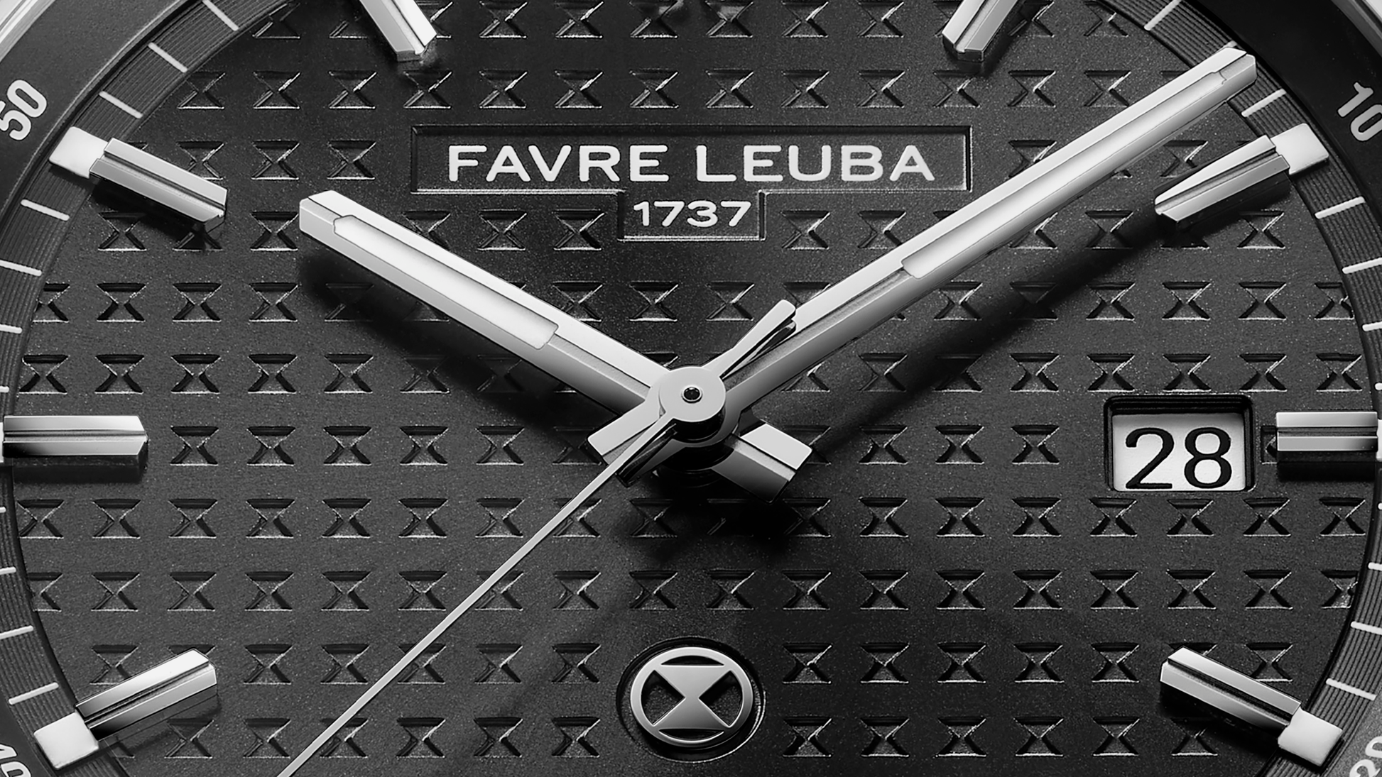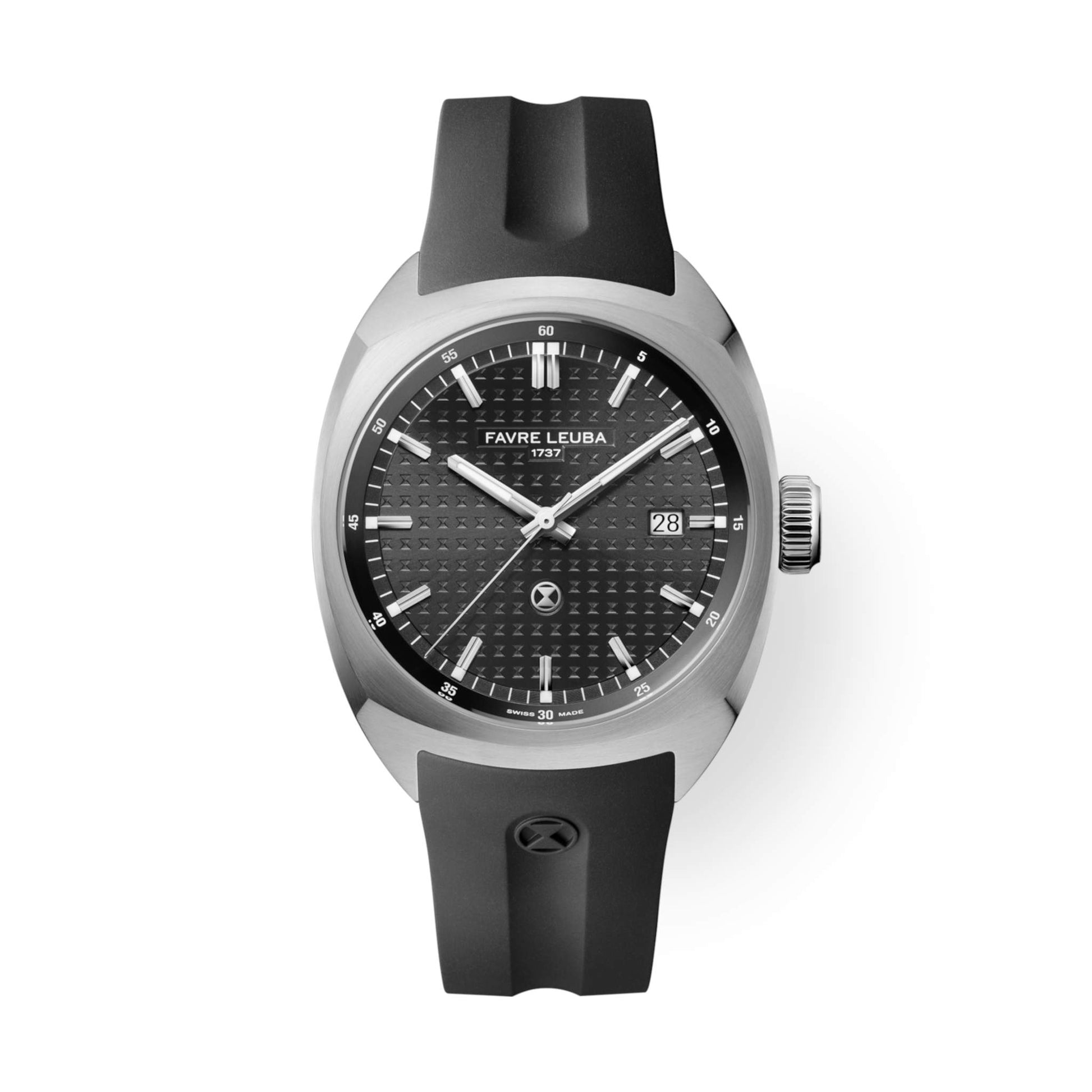 精悍なブラックダイヤルをラバーストラップで軽快に仕上げたチーフ・デイト。316Lステンレス製40mmケースに、タペストリー模様とサンレイ仕上げのダイヤルを搭載。ムーブメントはLa Joux-Perret G100をベースとしたキャリバー FLD03で約68時間駆動し、ケースバックのサファイアクリスタル越しに精緻な仕上げを堪能できます。Super-LumiNovaを施した針とインデックスは暗所でも高い視認性を発揮。100m防水と快適な装着感を持ち、日常からアクティブシーンまで幅広く活躍する一本です。