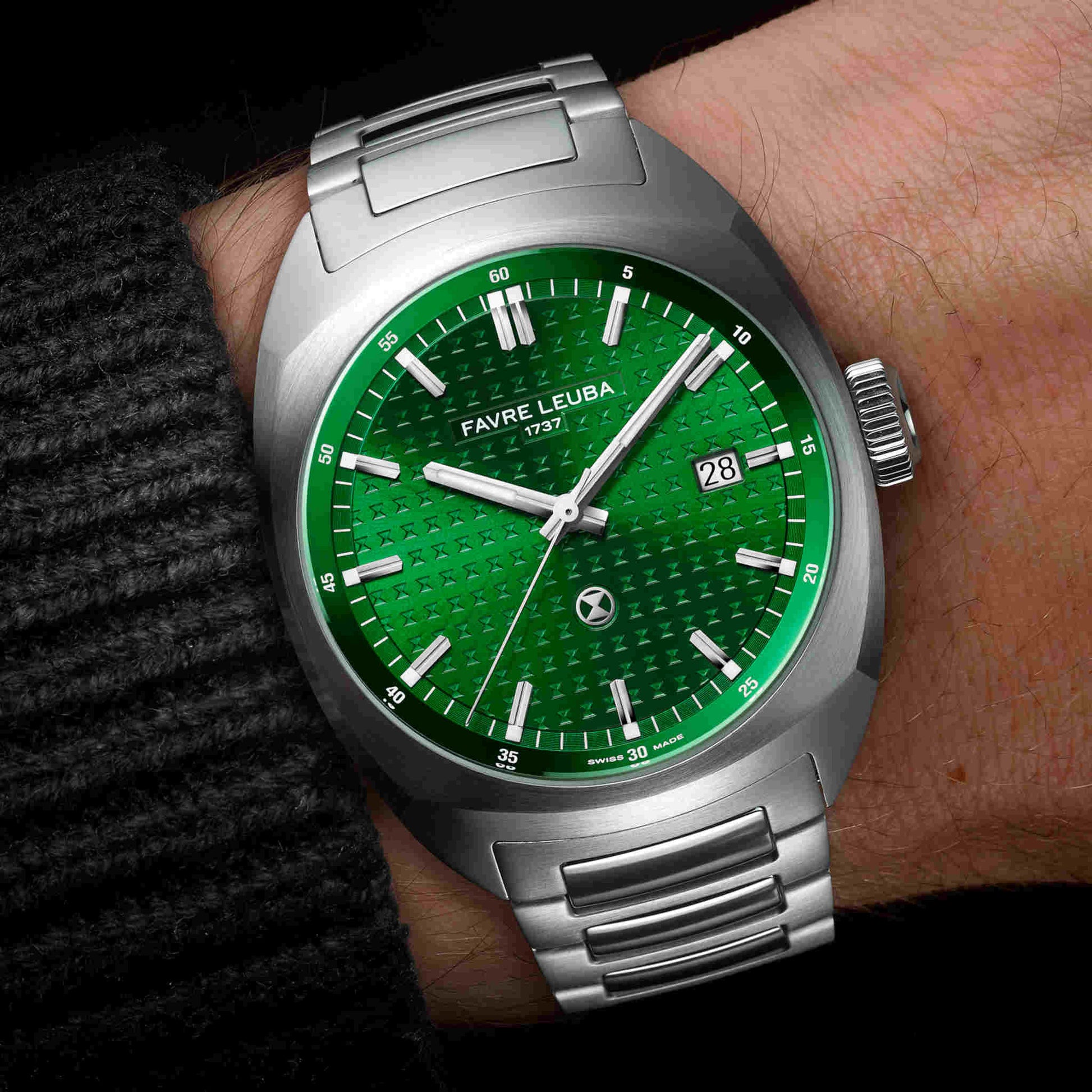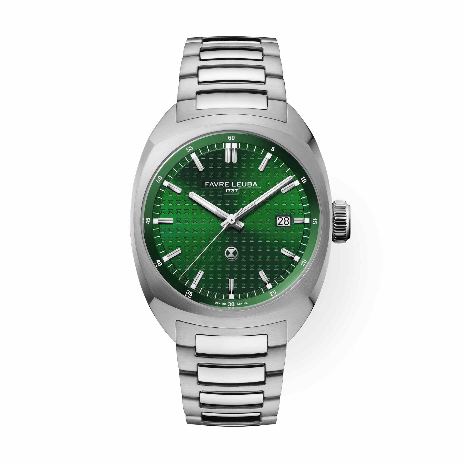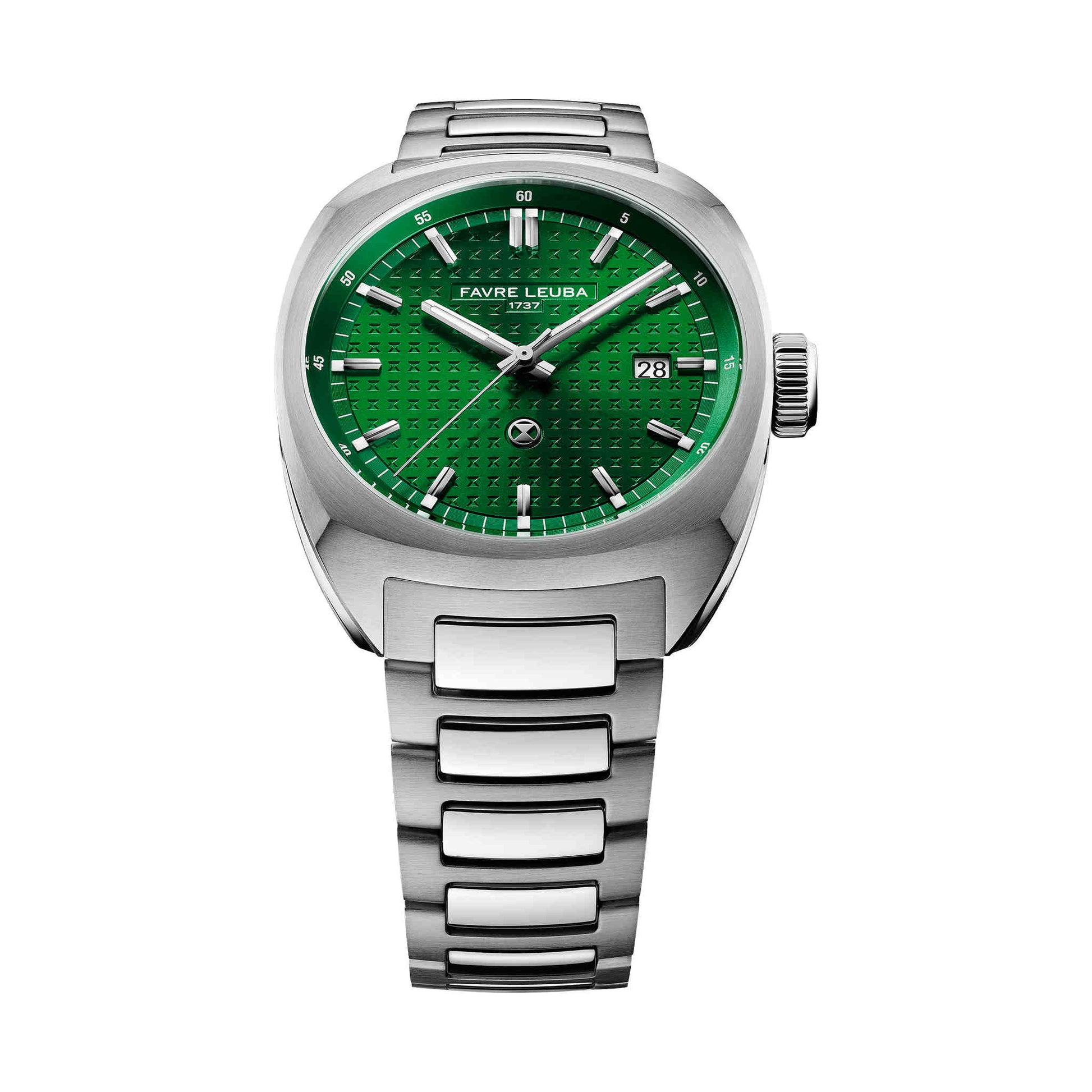森林を思わせるグリーンダイヤルにステンレスブレスレットを合わせたチーフ・デイト。40mm径・厚さ10.8mmのクッションケースにはサファイアクリスタル風防を備え、タペストリー模様とサンレイ仕上げのダイヤルが深みのある色彩を放ちます。ムーブメントはLa Joux-Perret G100をベースとしたキャリバー FLD03で、約68時間のパワーリザーブを実現。サファイアケースバック越しに美しいジュネーブストライプやブルースクリューを鑑賞可能。100m防水の堅牢性と洗練を兼ね備えた万能な一本です。
