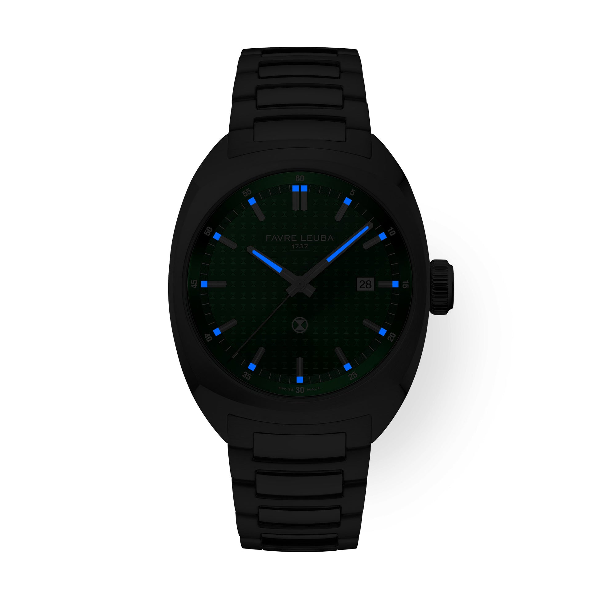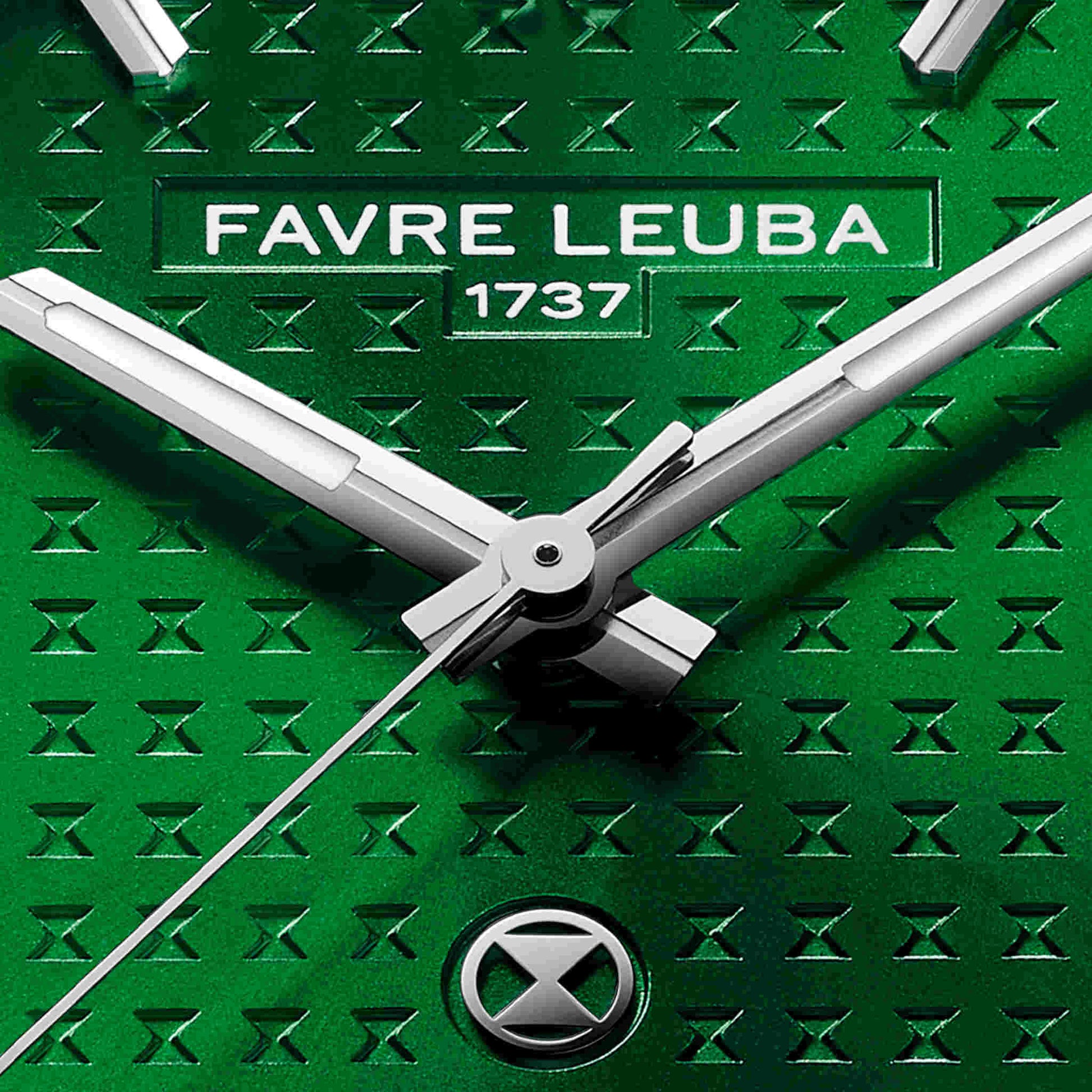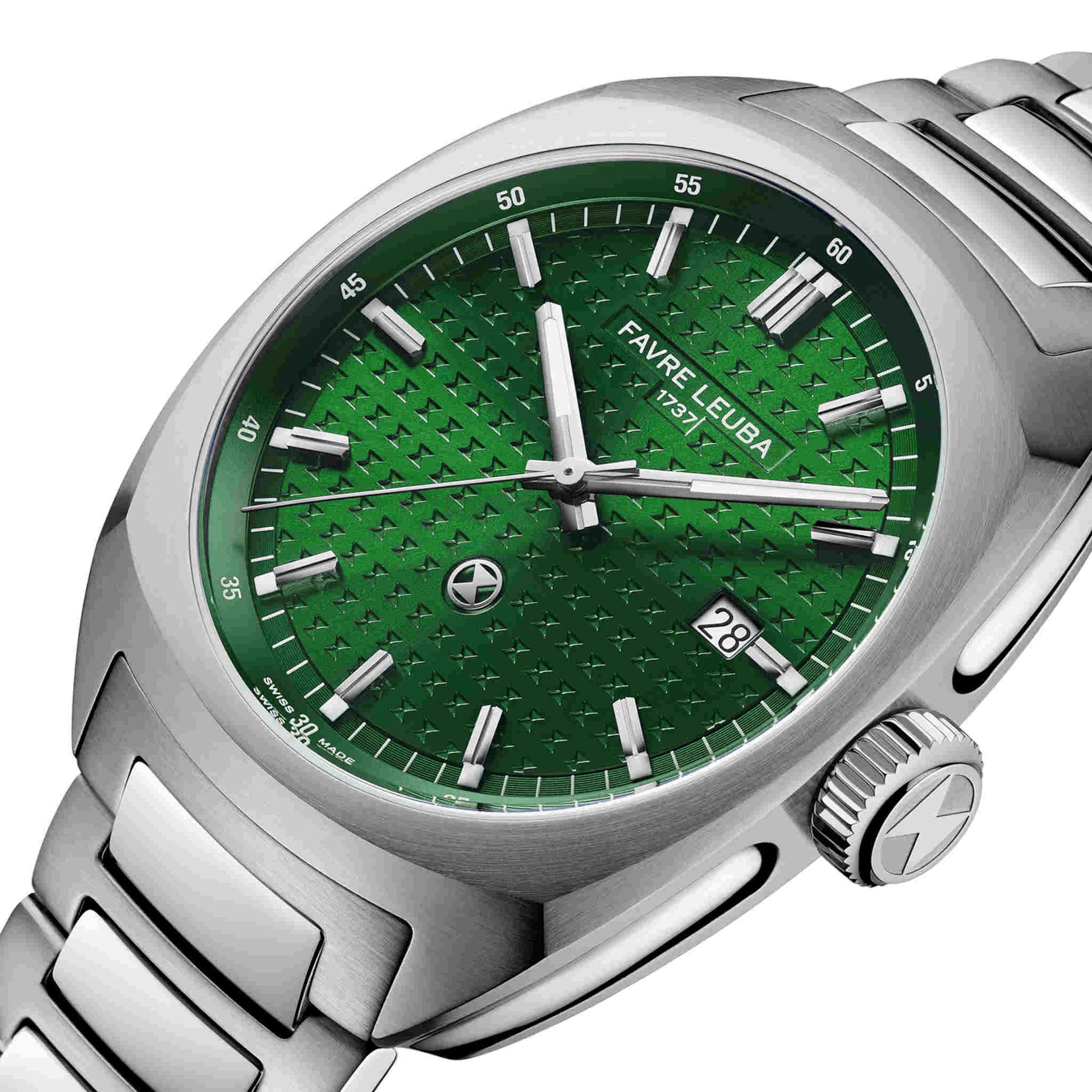 森林を思わせるグリーンダイヤルにステンレスブレスレットを合わせたチーフ・デイト。40mm径・厚さ10.8mmのクッションケースにはサファイアクリスタル風防を備え、タペストリー模様とサンレイ仕上げのダイヤルが深みのある色彩を放ちます。ムーブメントはLa Joux-Perret G100をベースとしたキャリバー FLD03で、約68時間のパワーリザーブを実現。サファイアケースバック越しに美しいジュネーブストライプやブルースクリューを鑑賞可能。100m防水の堅牢性と洗練を兼ね備えた万能な一本です。