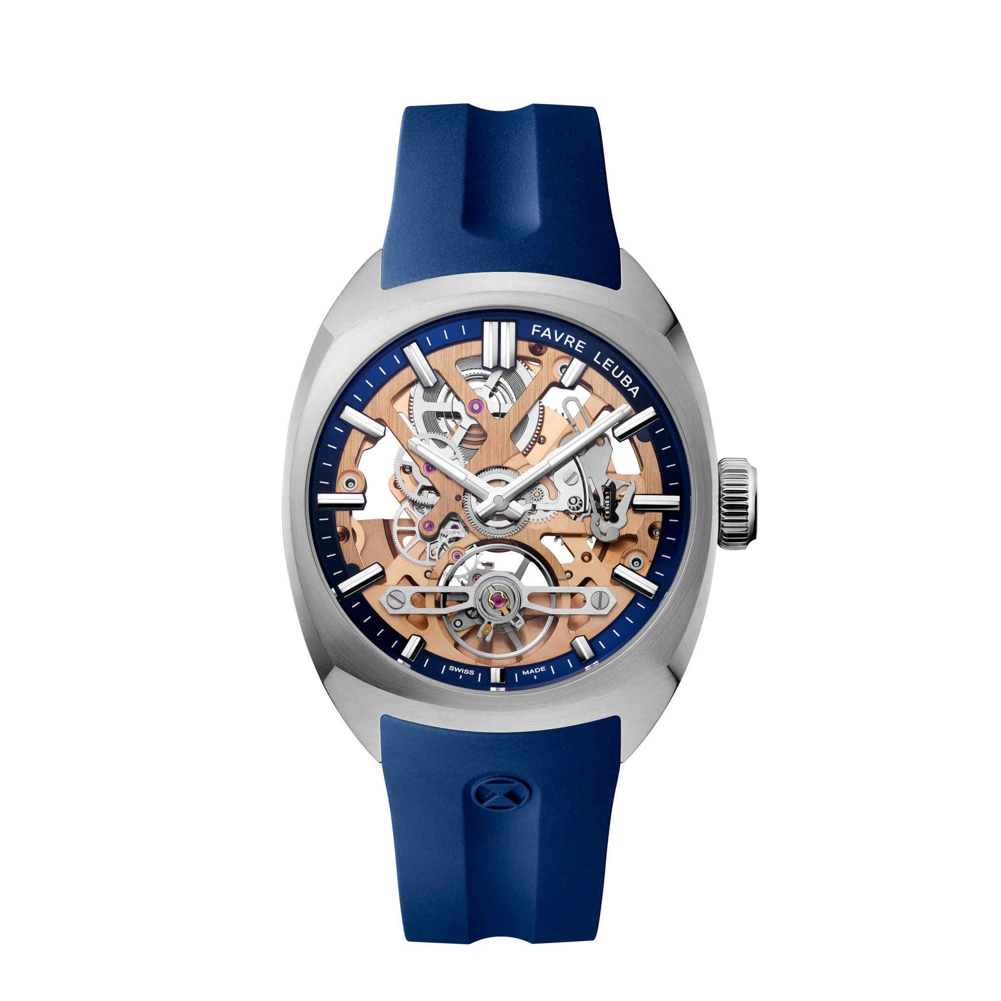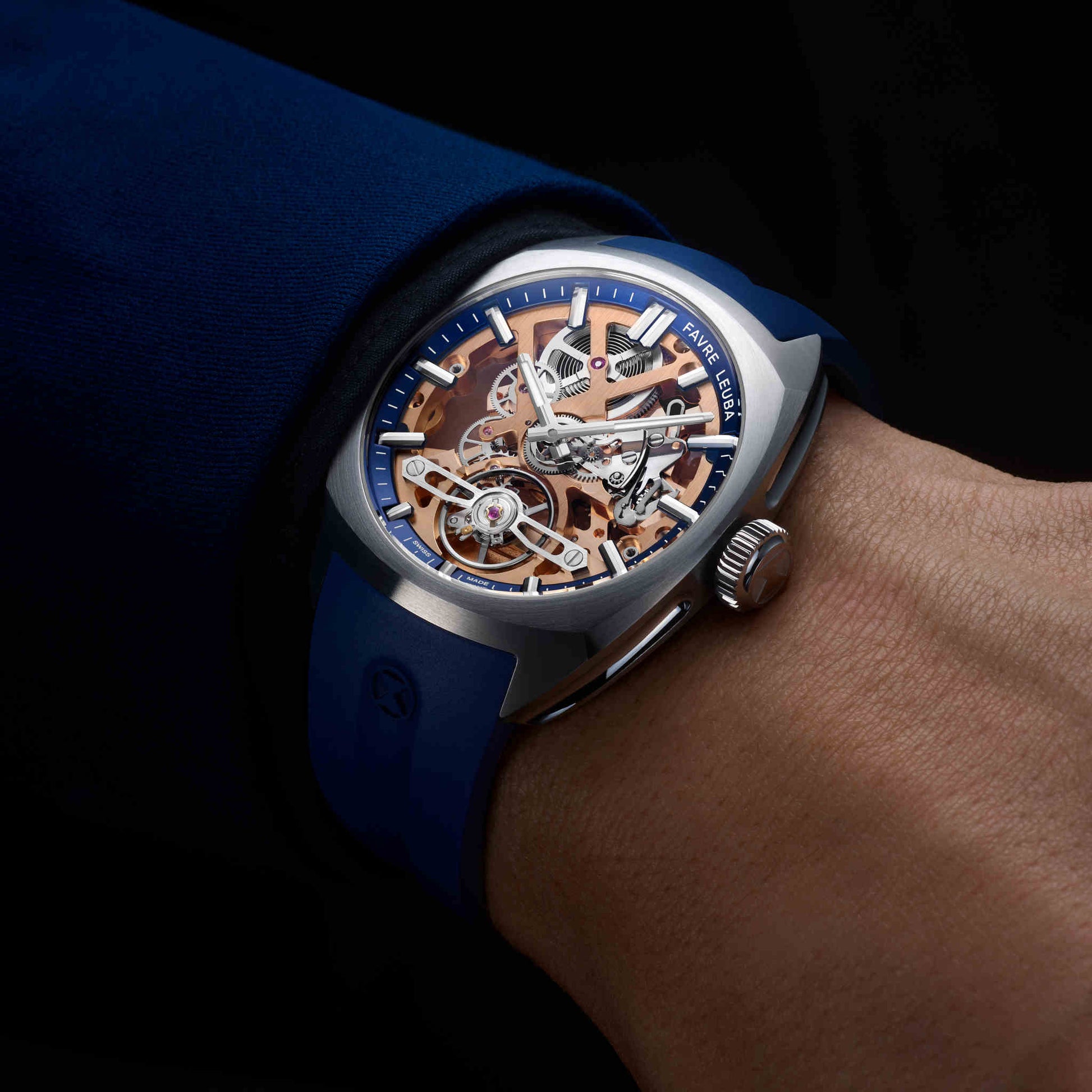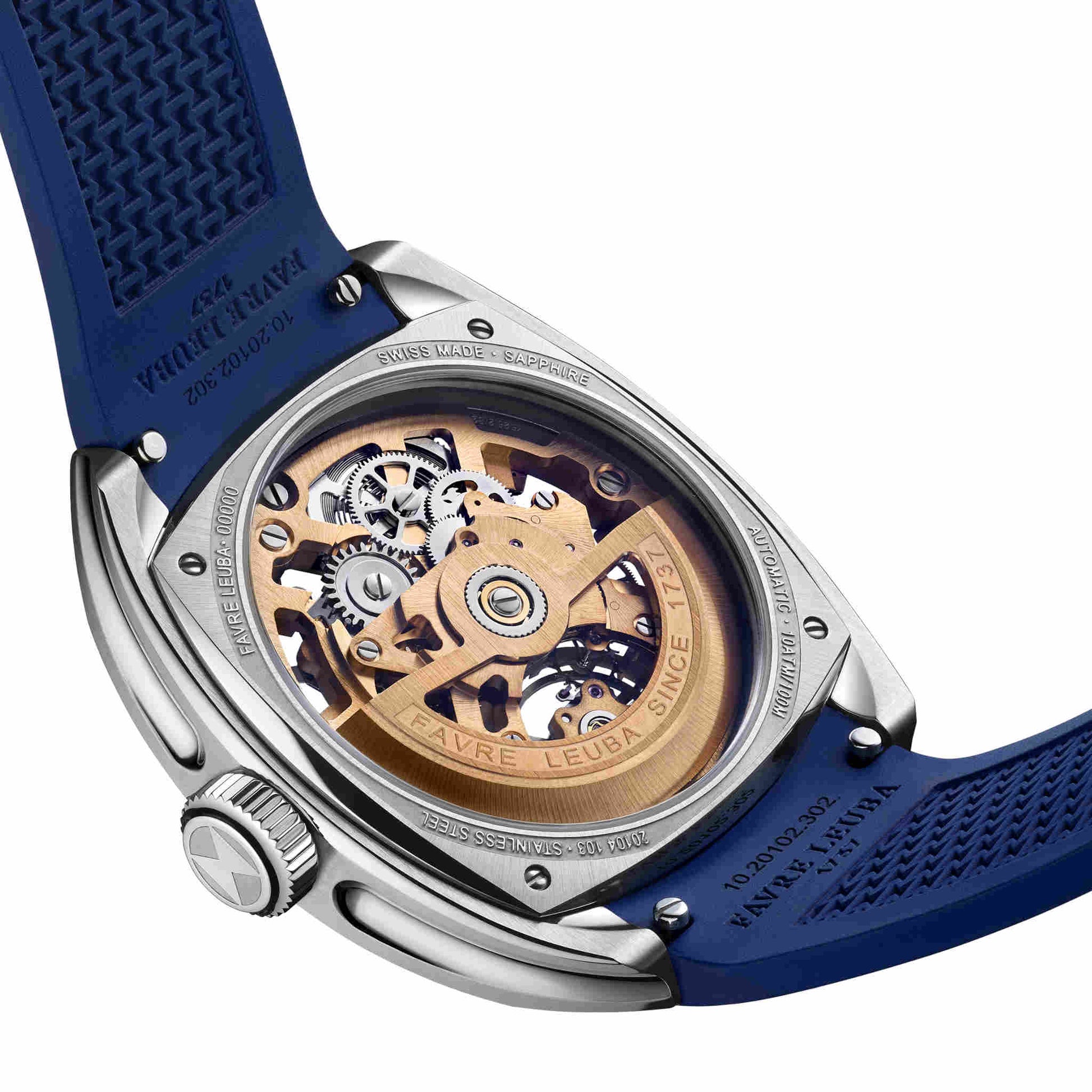 ファーブル・ルーバの象徴であるクッションケースはステンレススティール製で、適度な重量感と耐久性を備えながら、スケルトンムーブメントの精密な造形を余すことなく見せる設計となっています。