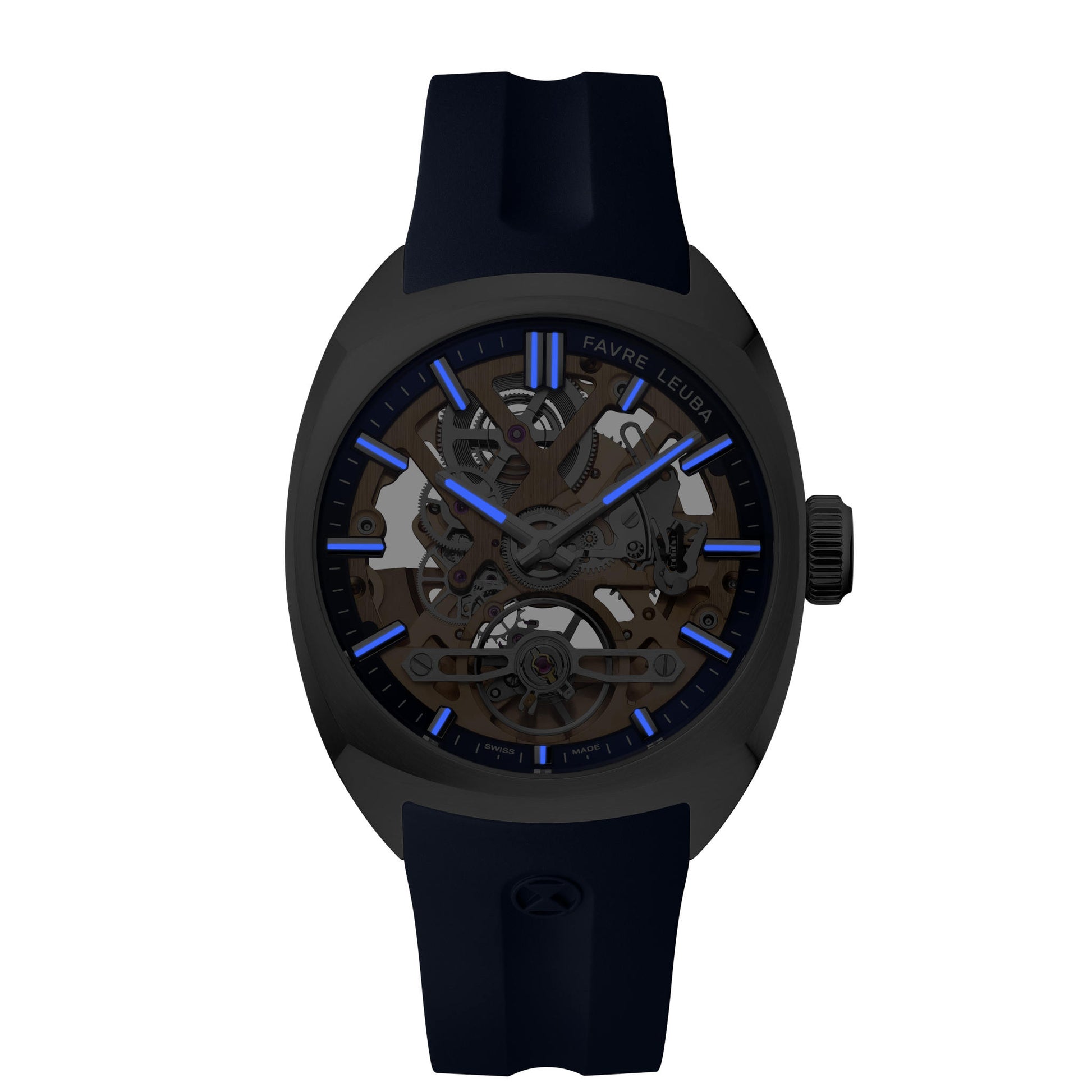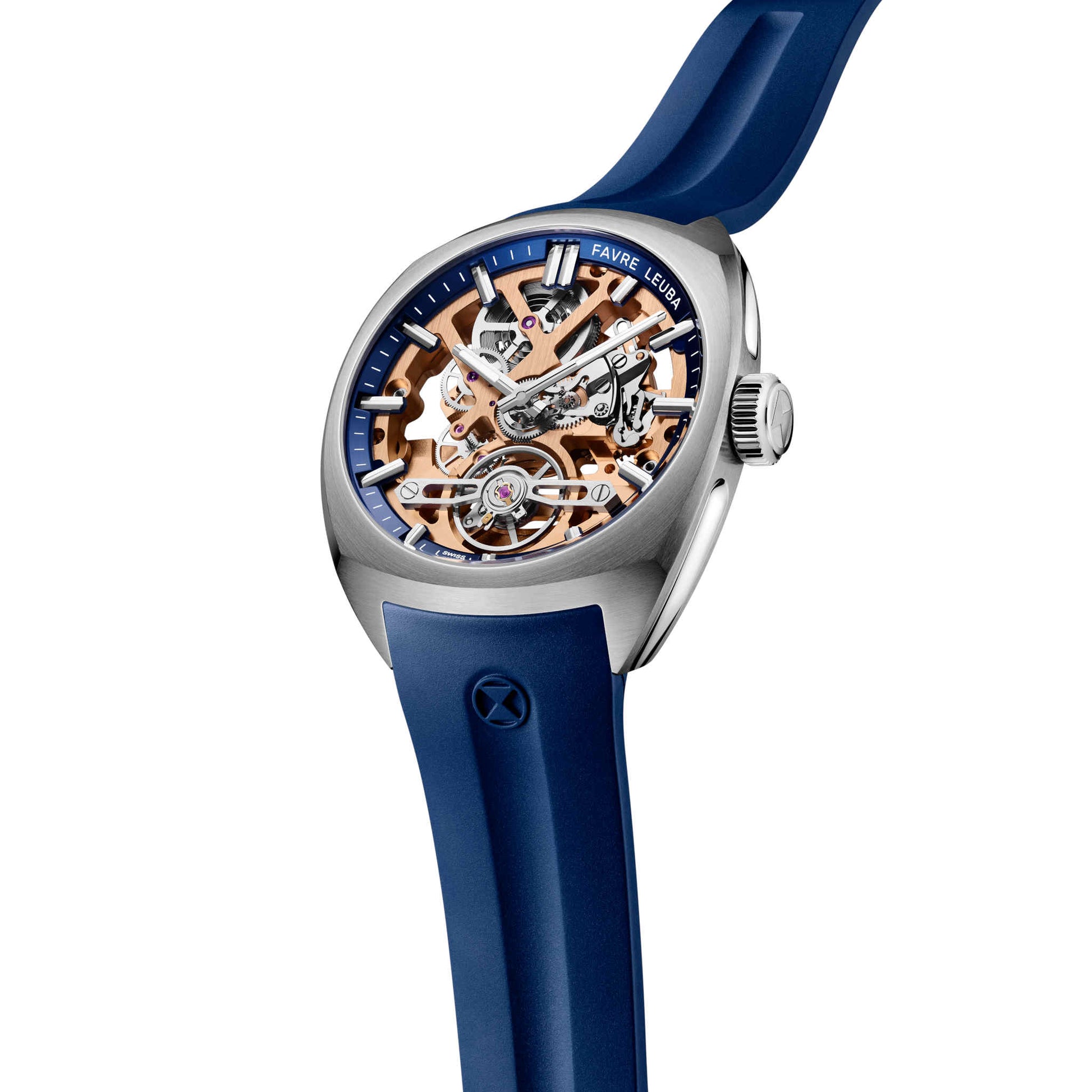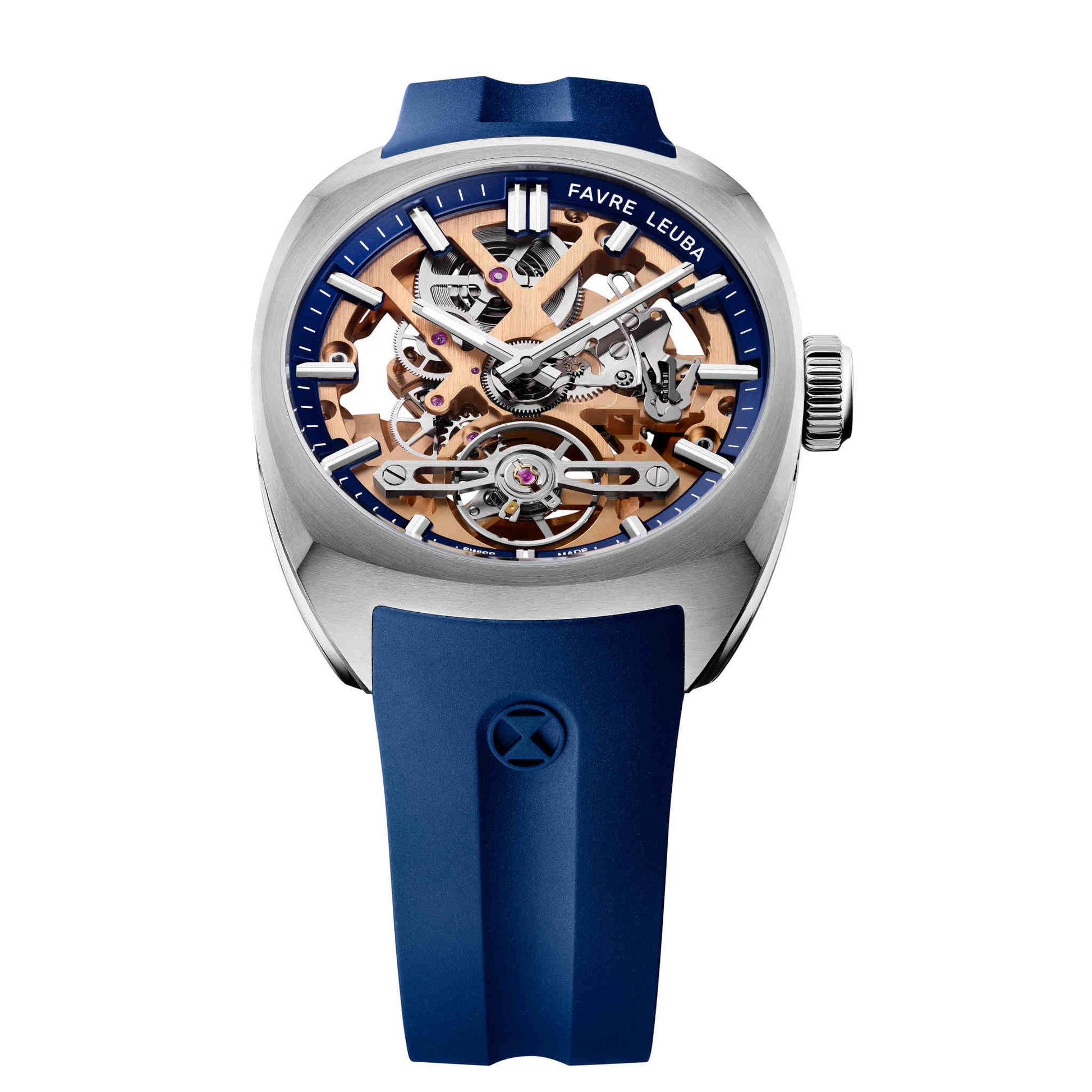 ファーブル・ルーバの象徴であるクッションケースはステンレススティール製で、適度な重量感と耐久性を備えながら、スケルトンムーブメントの精密な造形を余すことなく見せる設計となっています。