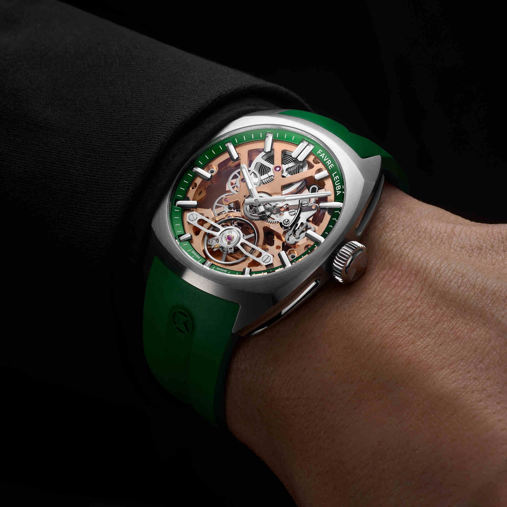鮮烈なグリーンのミニッツトラックは、スケルトン化されたムーブメントの奥行きを際立たせ、香箱とテンプのシンメトリー構造を引き立てます。