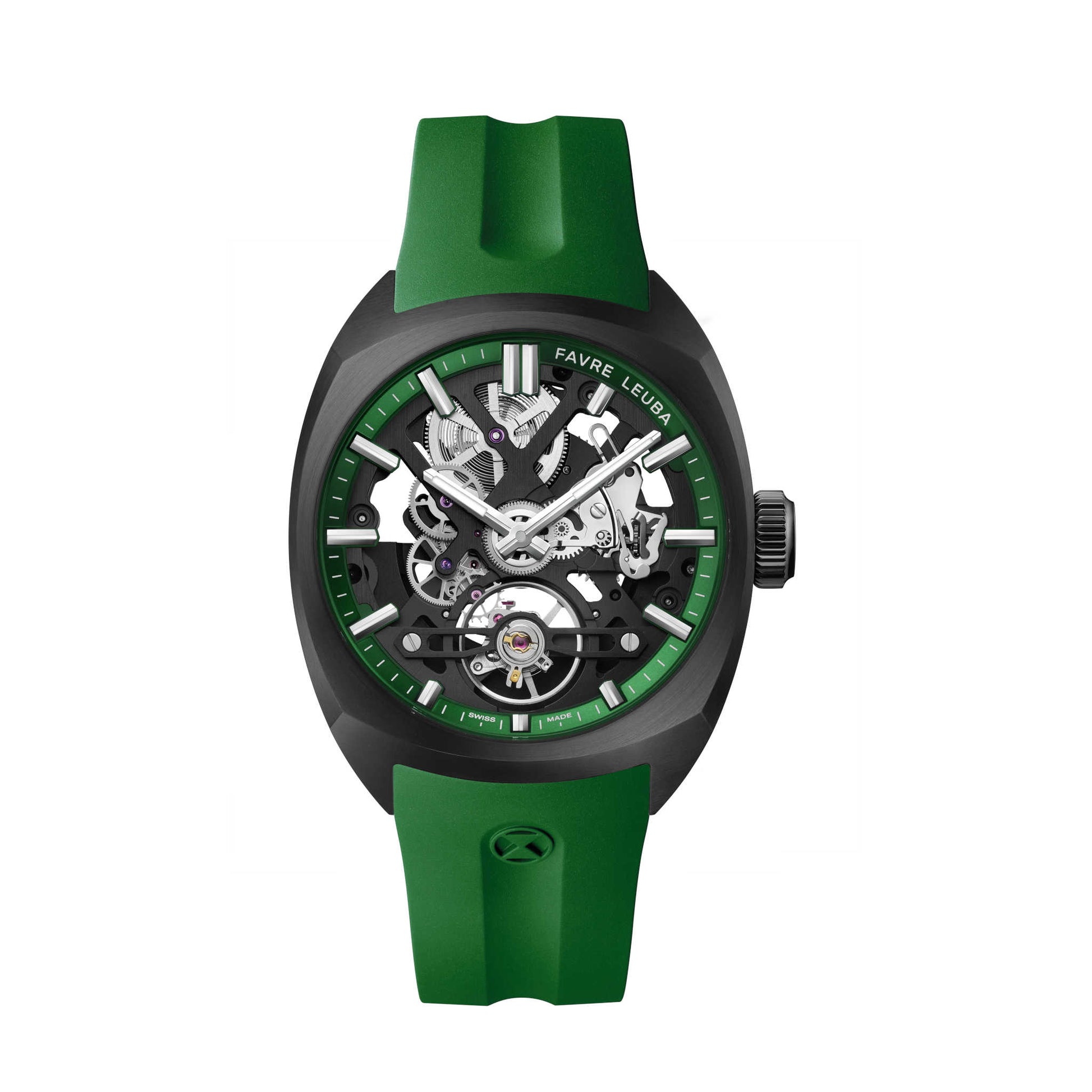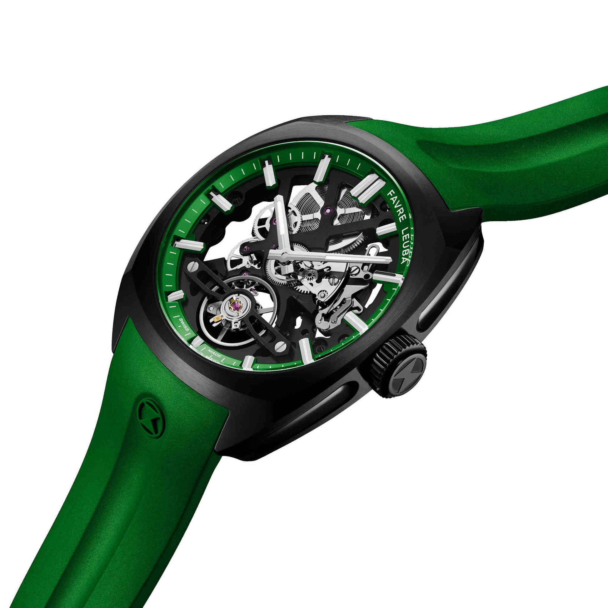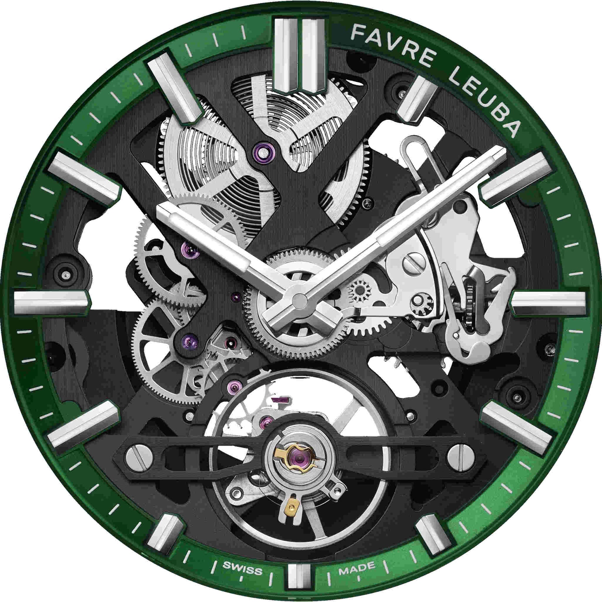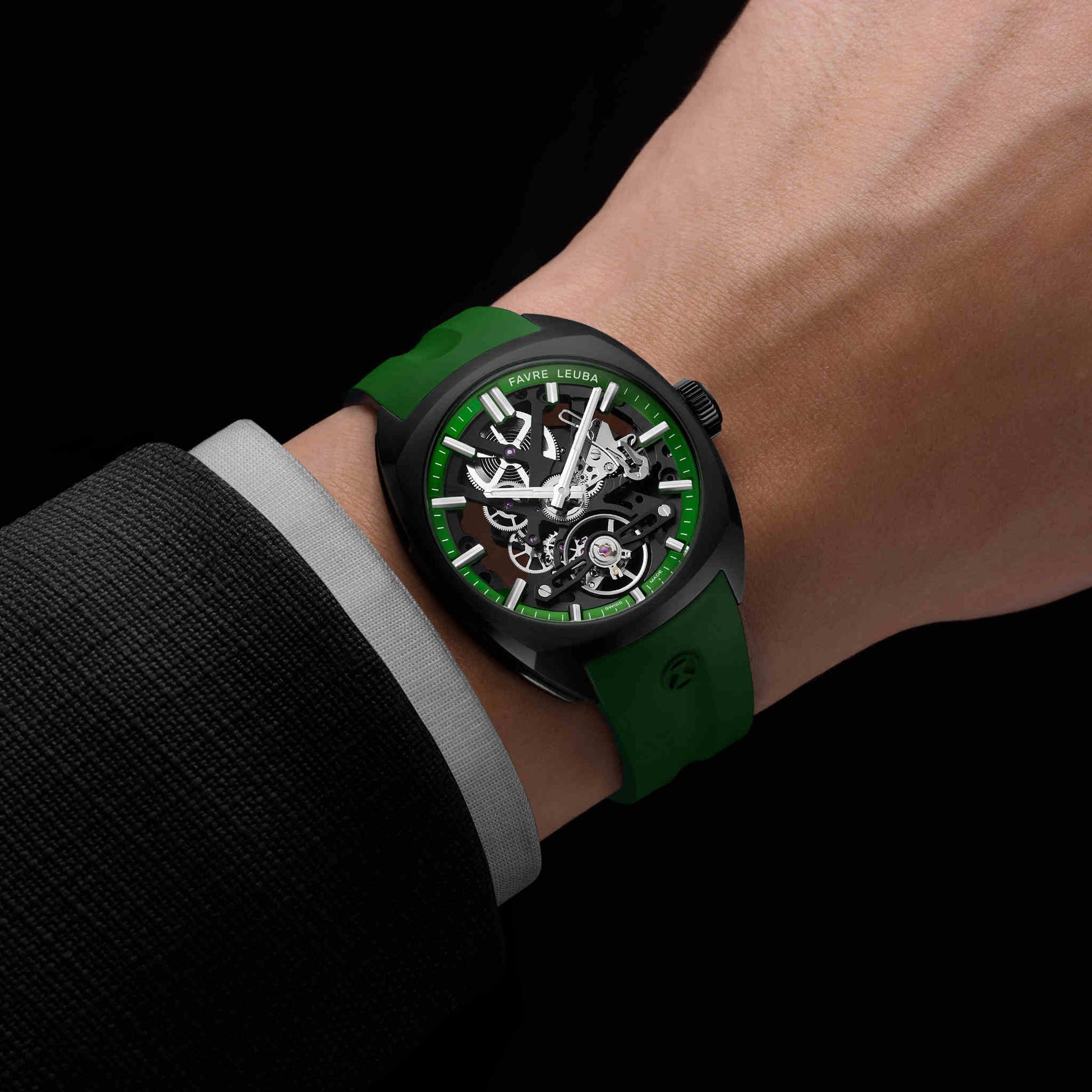 鮮やかなグリーンのミニッツトラックは視認性を高めつつ、ブラッククロームのムーブメントと強いコントラストを形成。