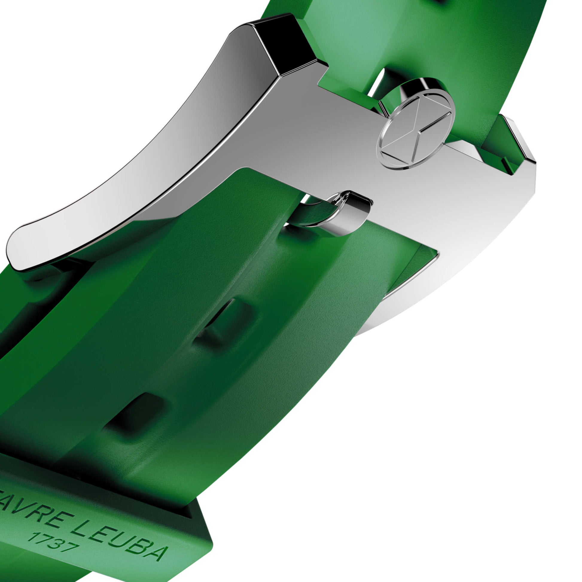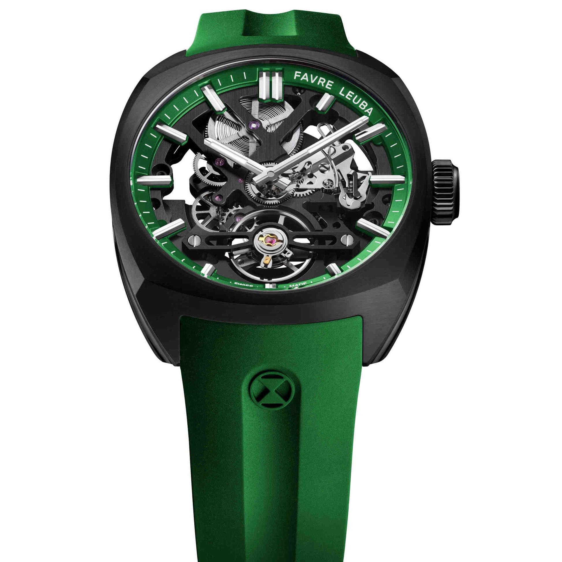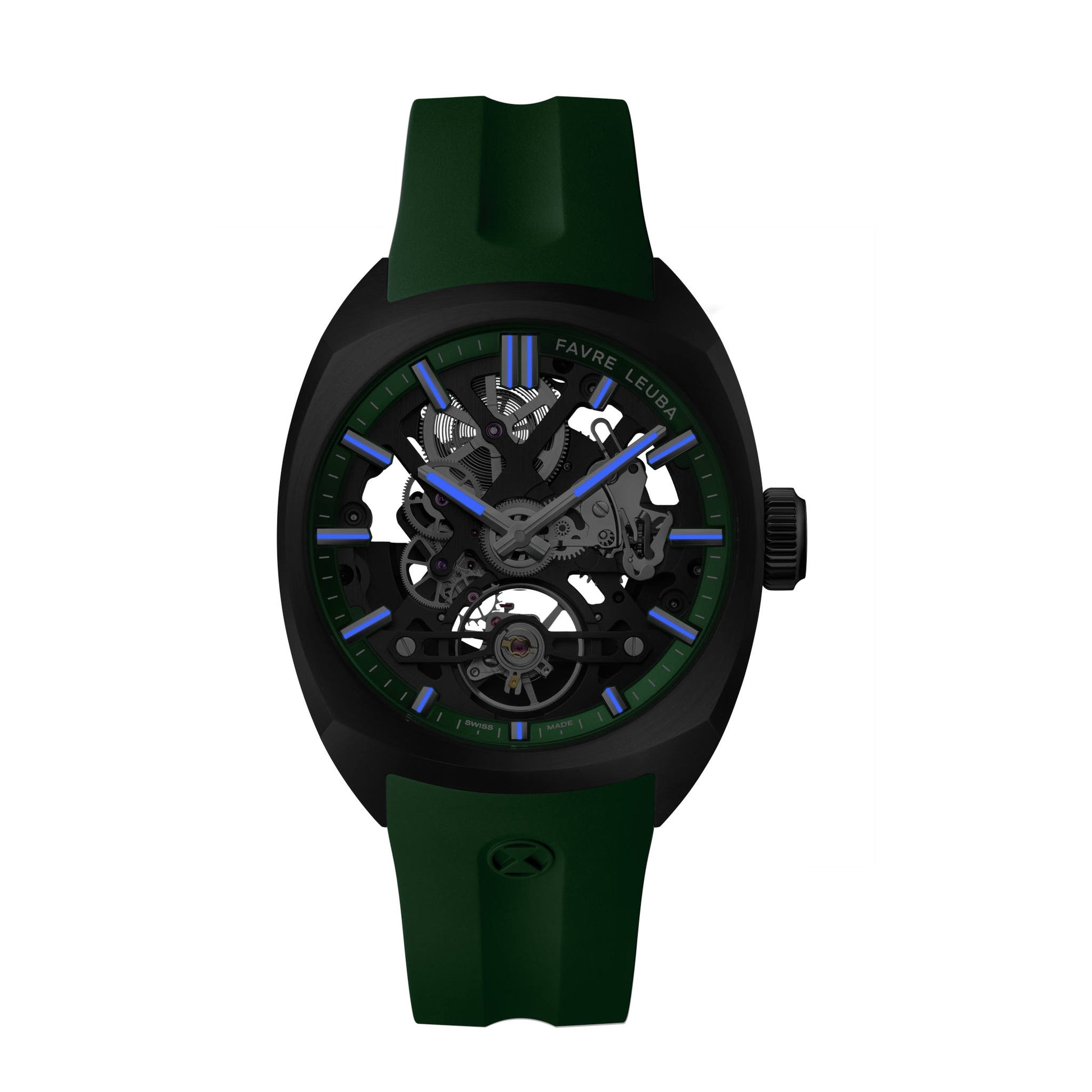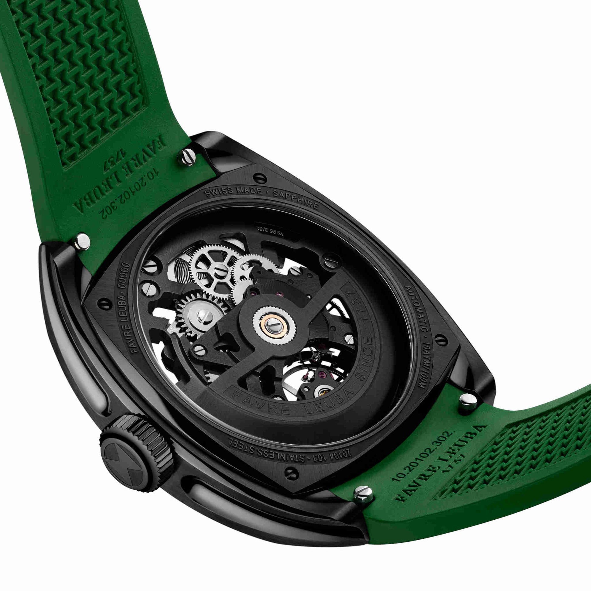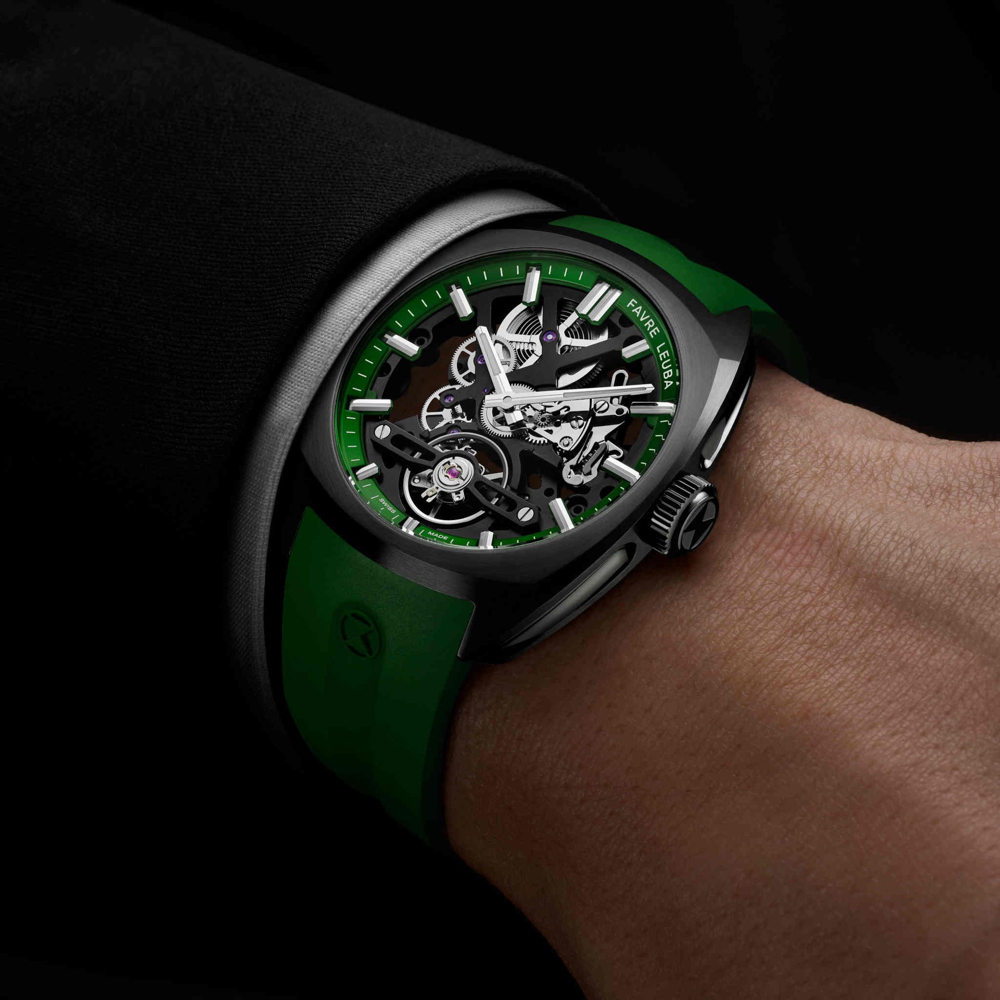 鮮やかなグリーンのミニッツトラックは視認性を高めつつ、ブラッククロームのムーブメントと強いコントラストを形成。