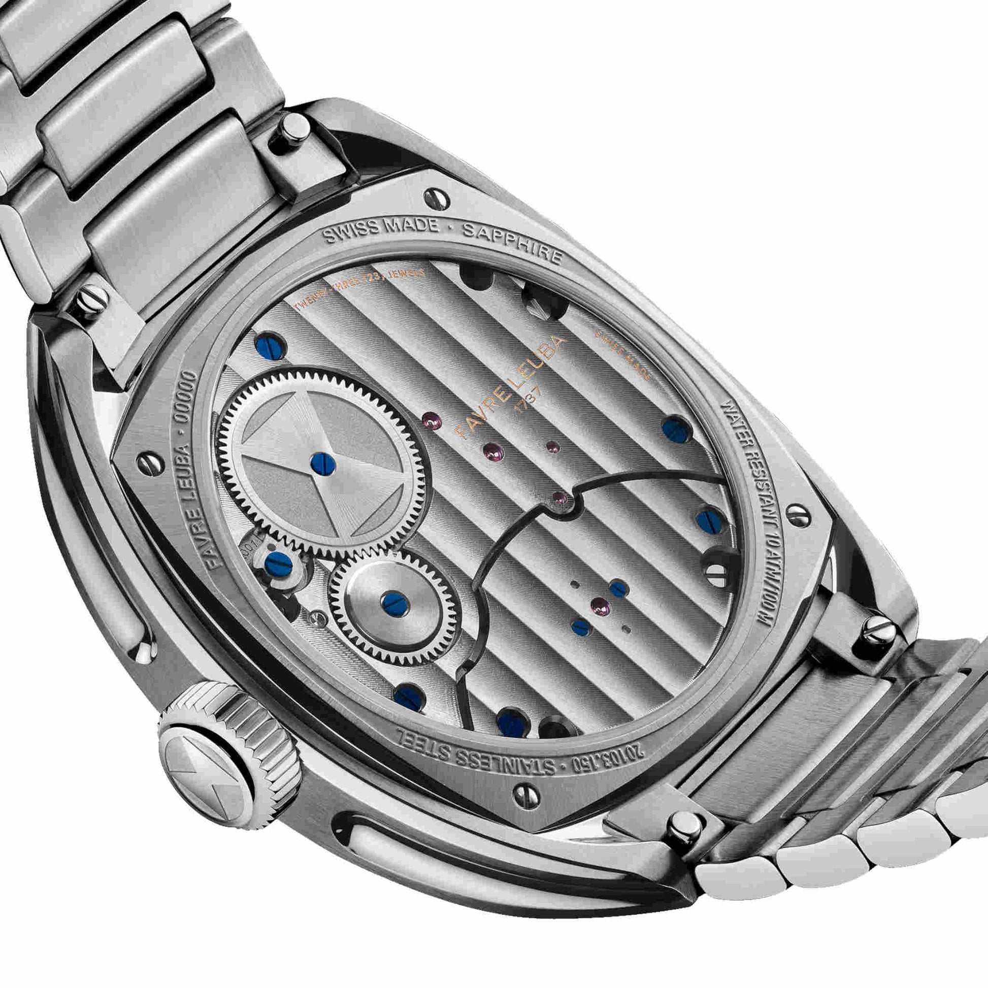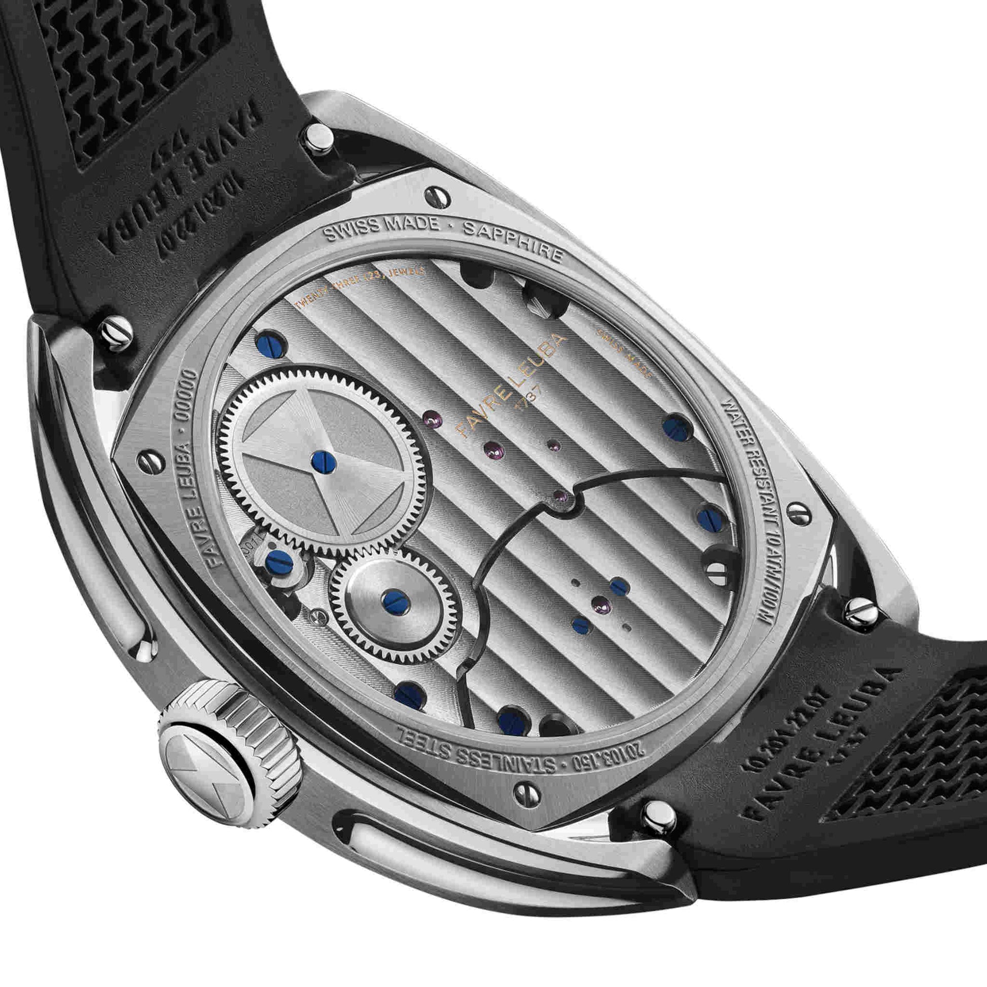 60 時間パワーリザーブを誇り、ブラックラバーストラップとステンレススティール製ブレスレットが付属。限定 25 本。ファーブル・ルーバの復興を象徴する、記念碑的な1本です。