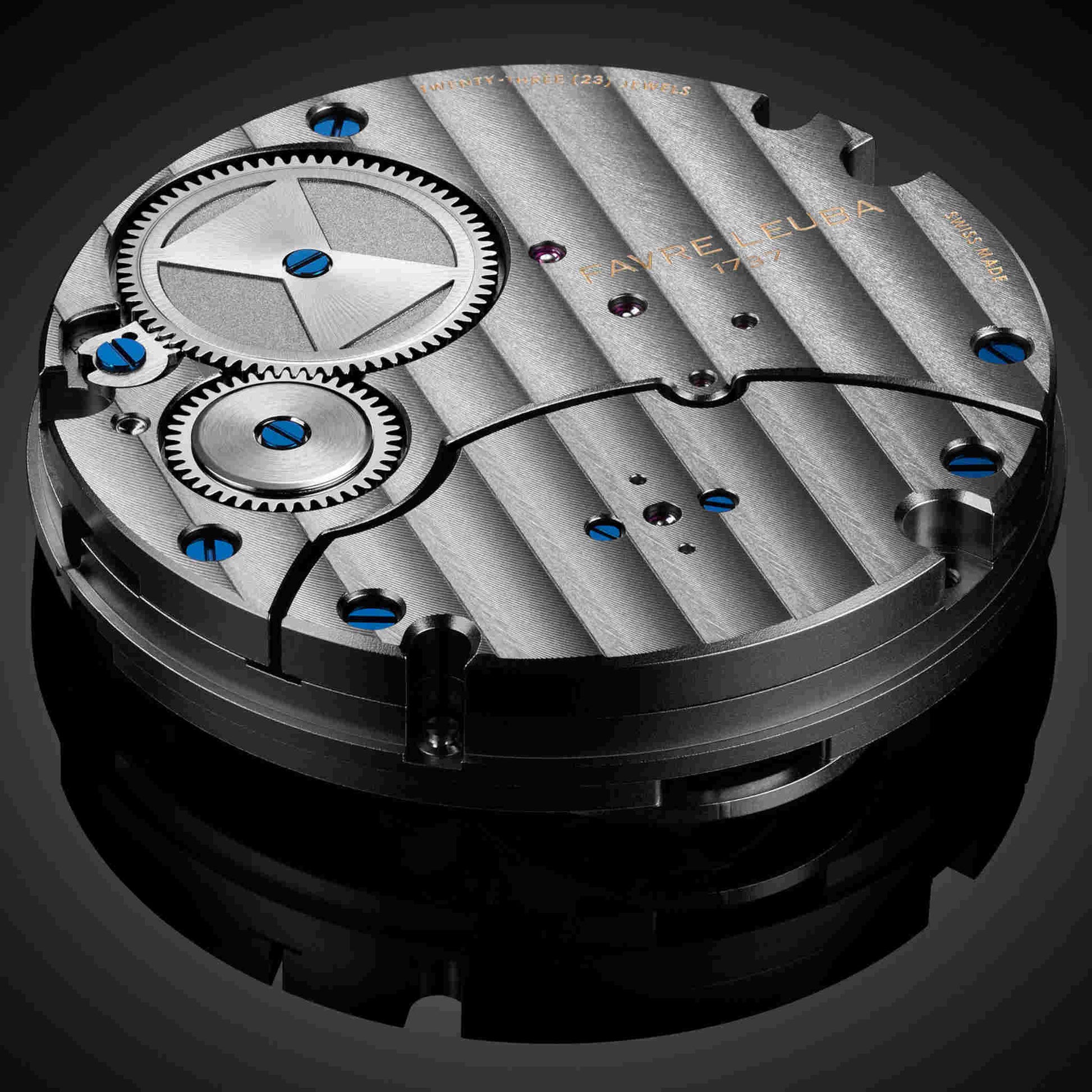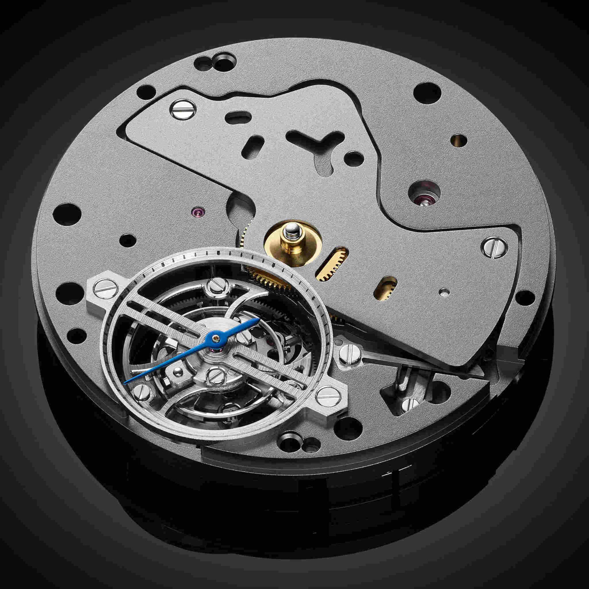 心臓部には、モジョン率いるクロノードが設計した手巻キャリバー FL T01(ベース Chronode C502)を搭載。トゥールビヨンケージのブリッジは砂時計形状を描き、小秒針とリュウズ軸を支える構造美を兼ね備えています。