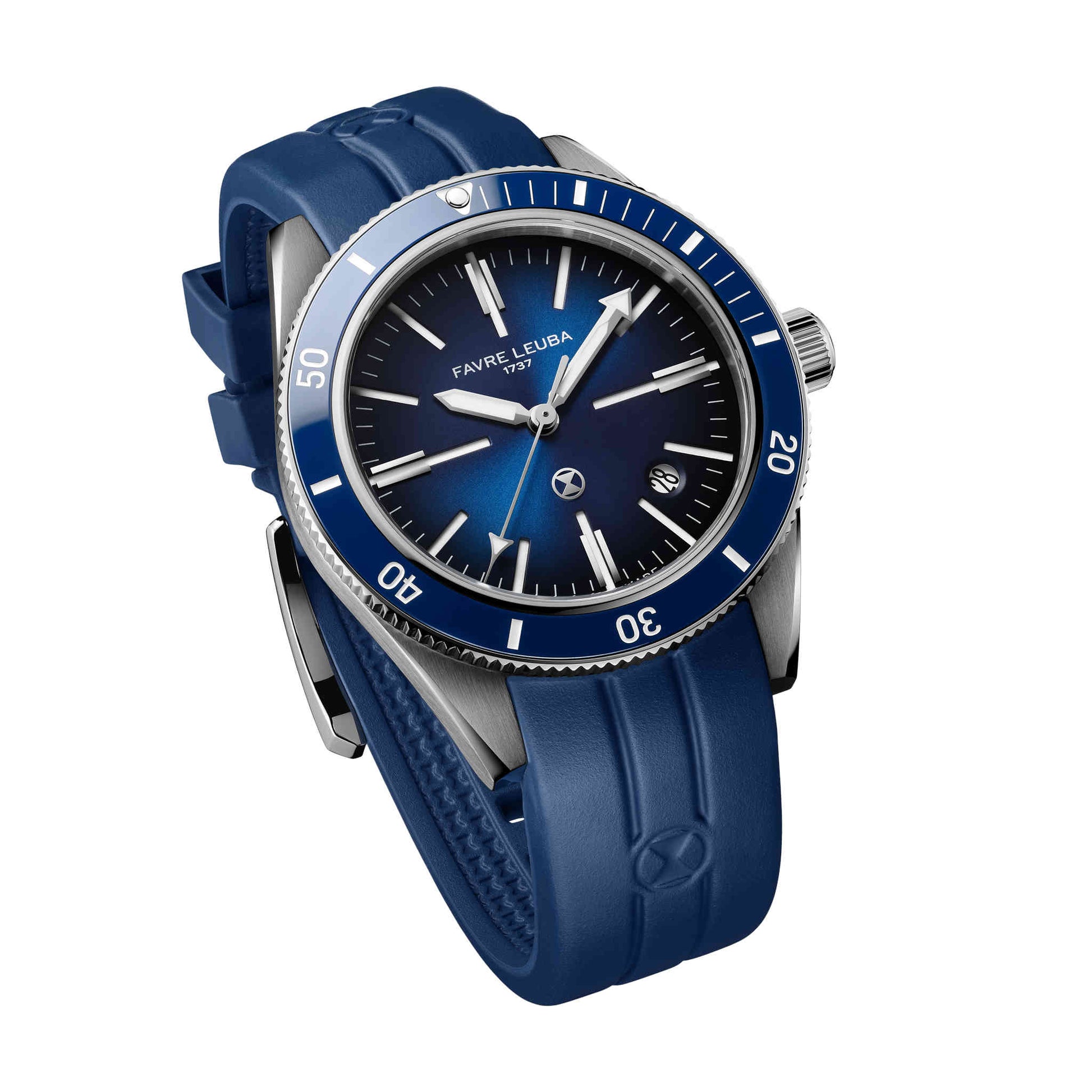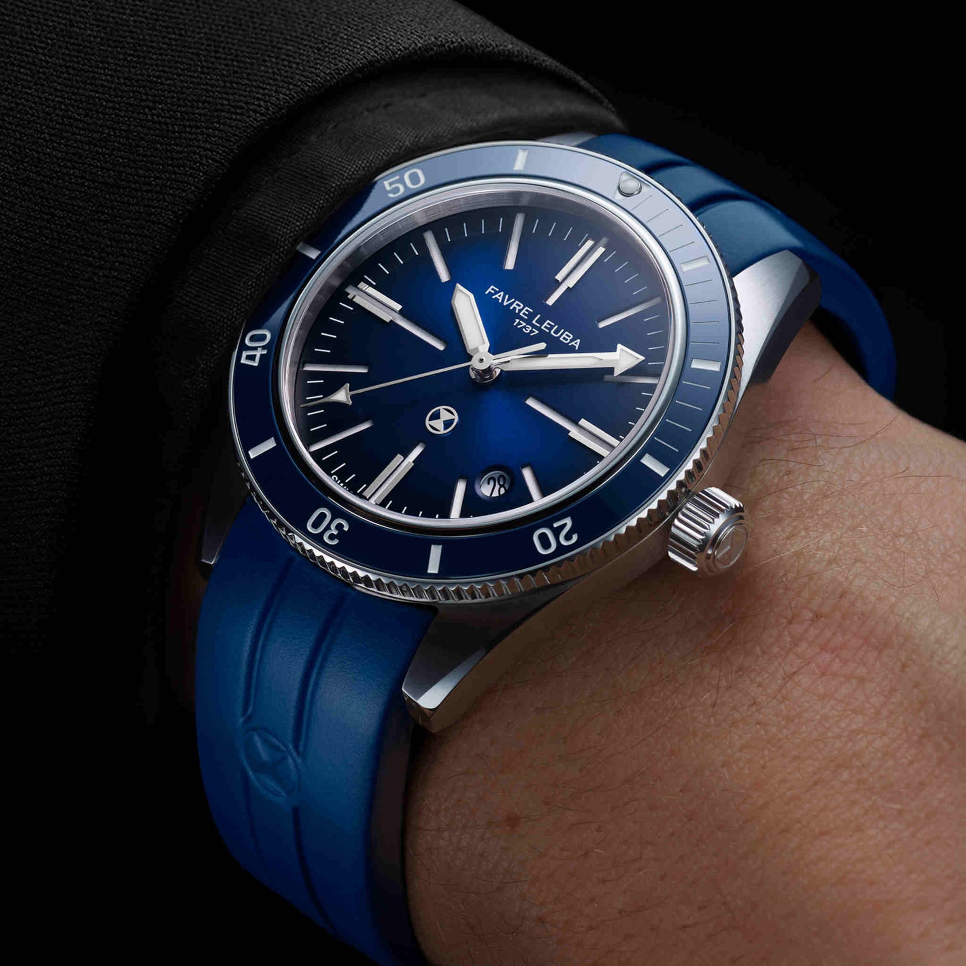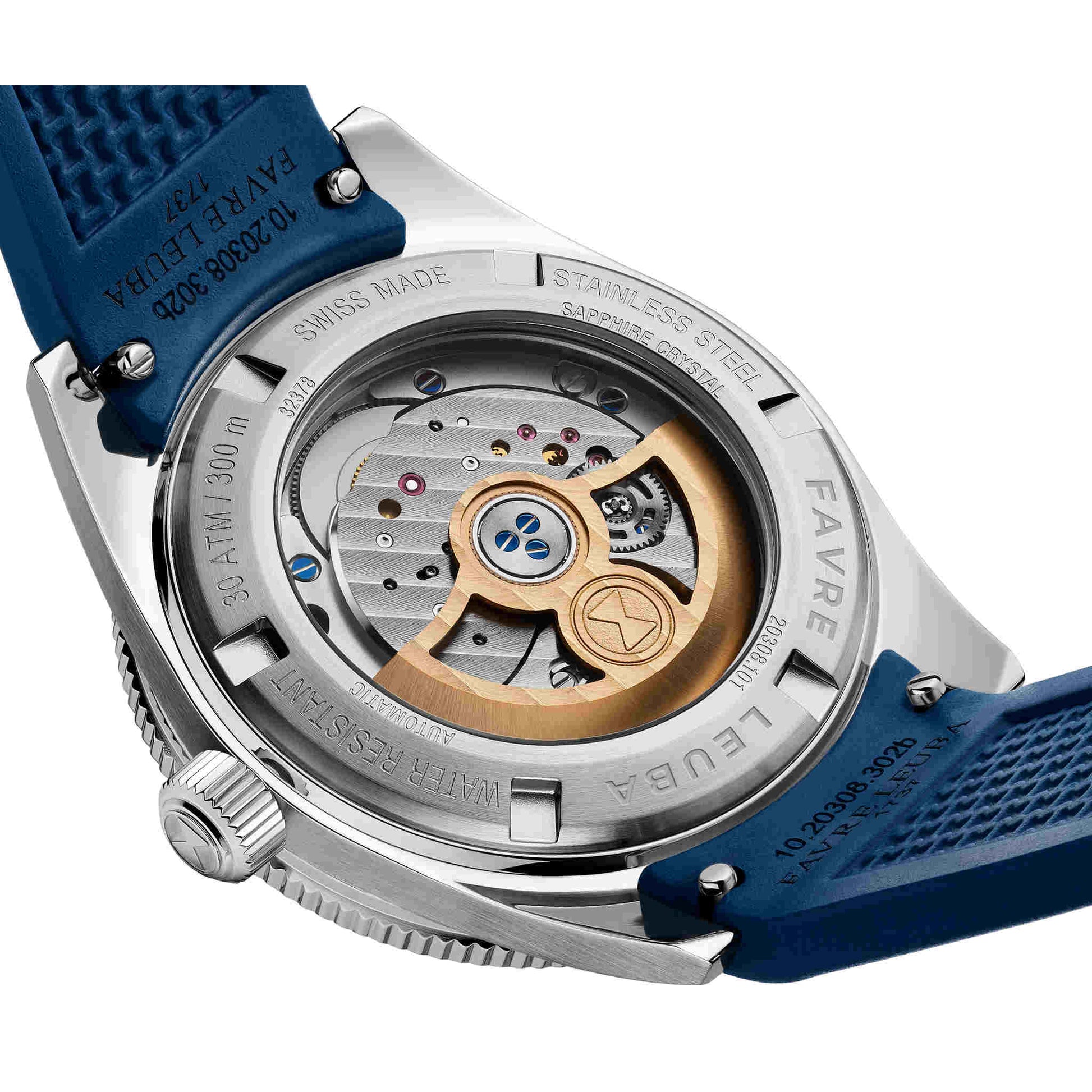 このモデルは、ステンレススティール製ケース(ケース径40mm/厚さ約12.7mm)に、サファイアクリスタル風防とシースルーのケースバックを採用。心臓部はLa Joux‑Perret G100をベースとしたキャリバーFLD02で、約68時間のパワーリザーブ。サンドイッチ構造のブルーグラデーションダイヤル、セラミック製逆回転防止ベゼル、夜光アワーマーカーを装備し、300m防水の本格仕様。軽快なラバーストラップがスポーティな魅力を引き立てます。