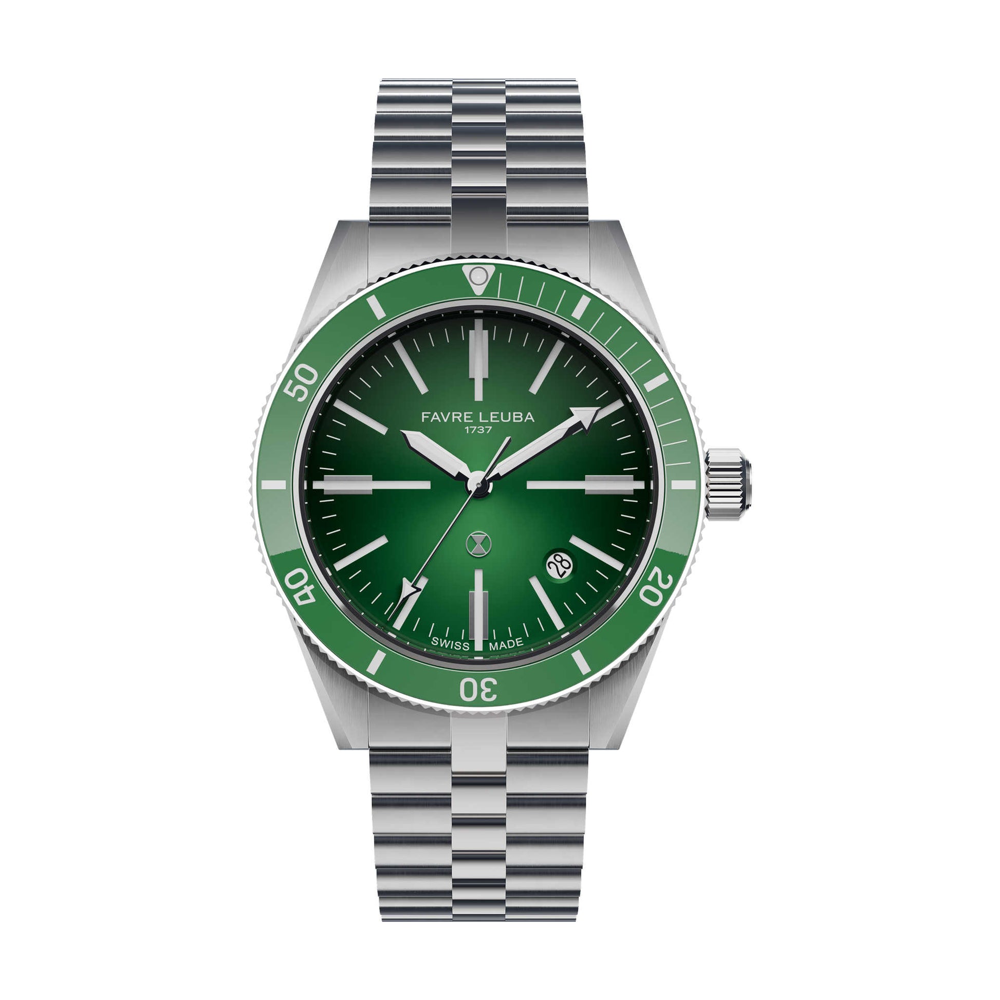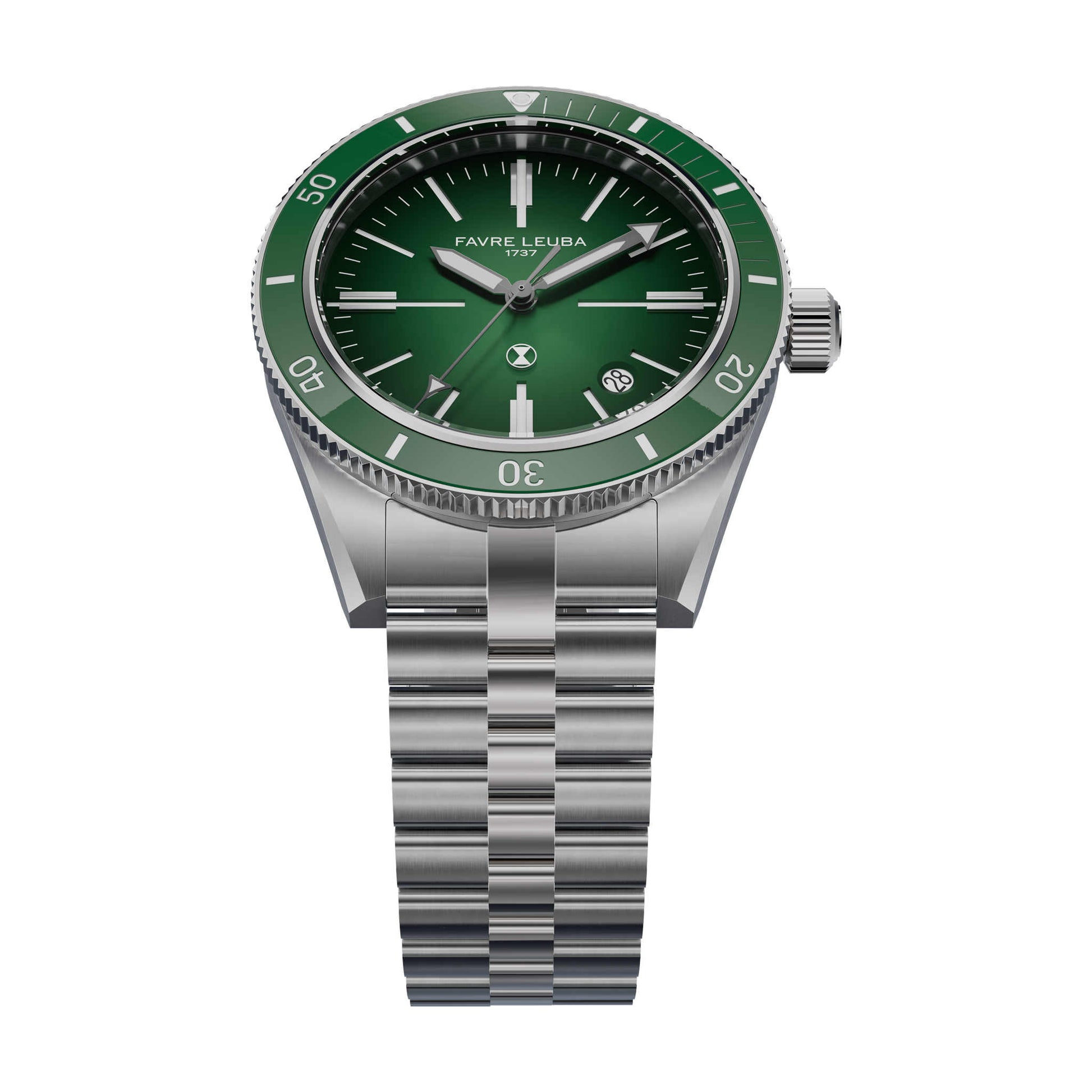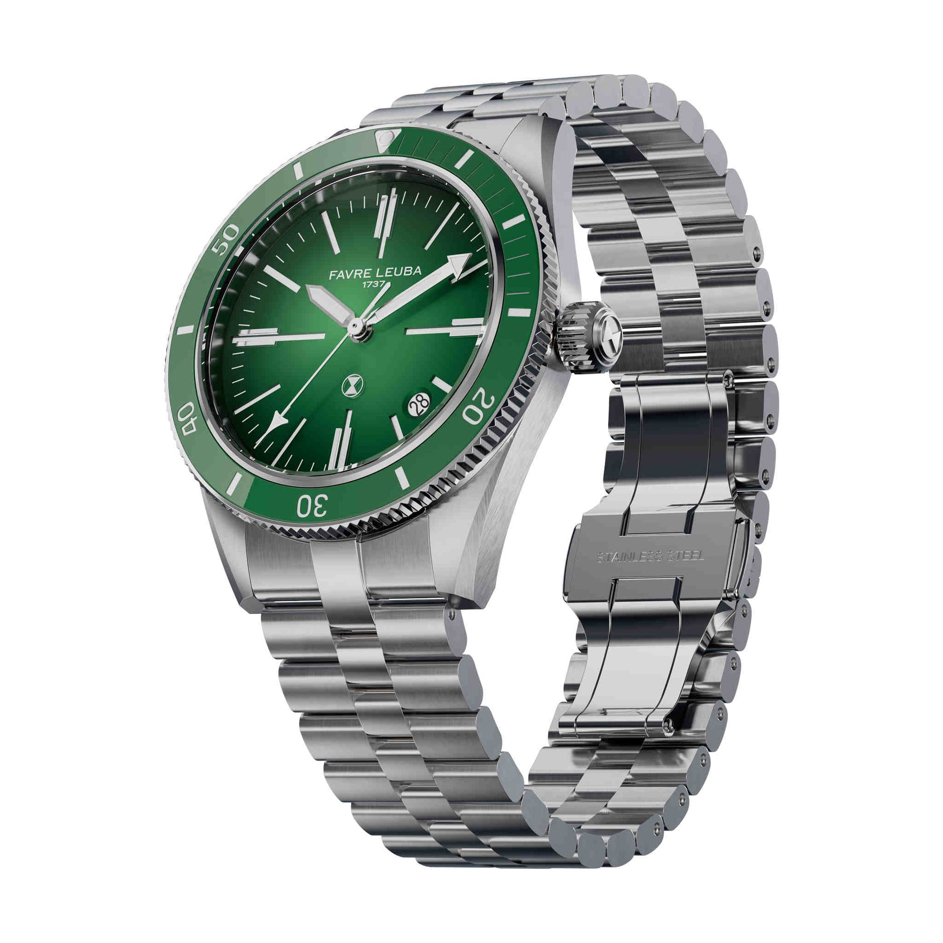 このモデルは、ステンレススティール製の40mmケース(厚さ約12.7mm)に、サファイアクリスタル風防とシースルーのケースバックを装備。La Joux‑Perret G100をベースとしたキャリバーFLD02を搭載し、約68時間のパワーリザーブを実現。サンドイッチ構造のグリーングラデーションダイヤル、セラミック製逆回転防止ベゼル、夜光マーカーが高い視認性を確保。ステンレススティール製ブレスレットが自然な色調に都会的な洗練を添えます。