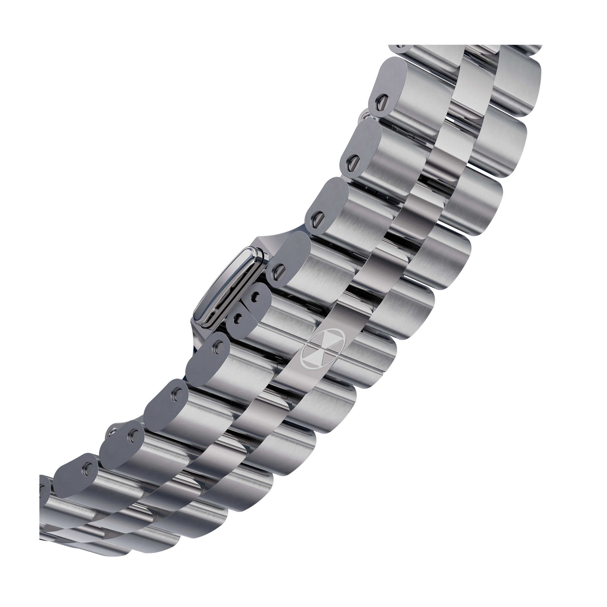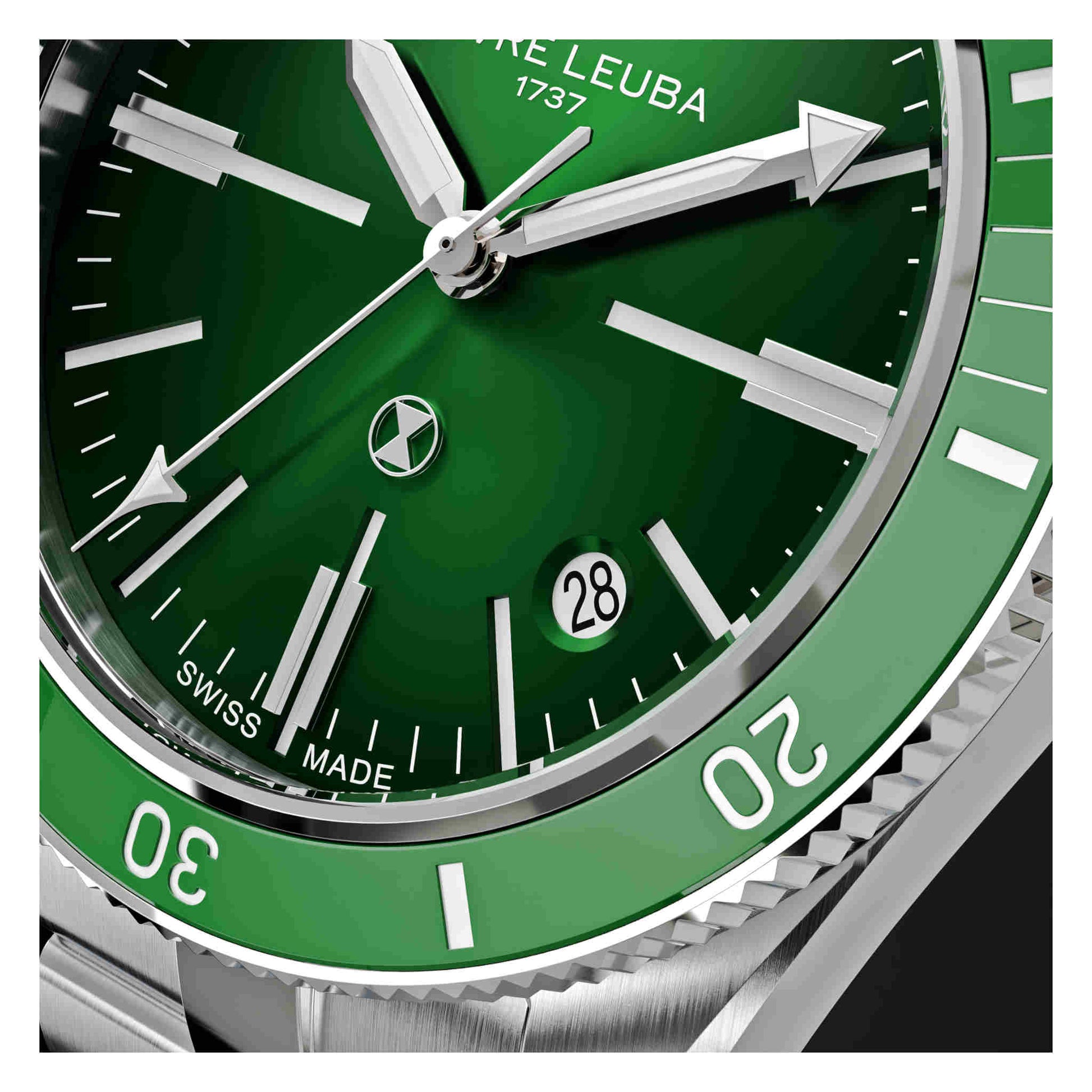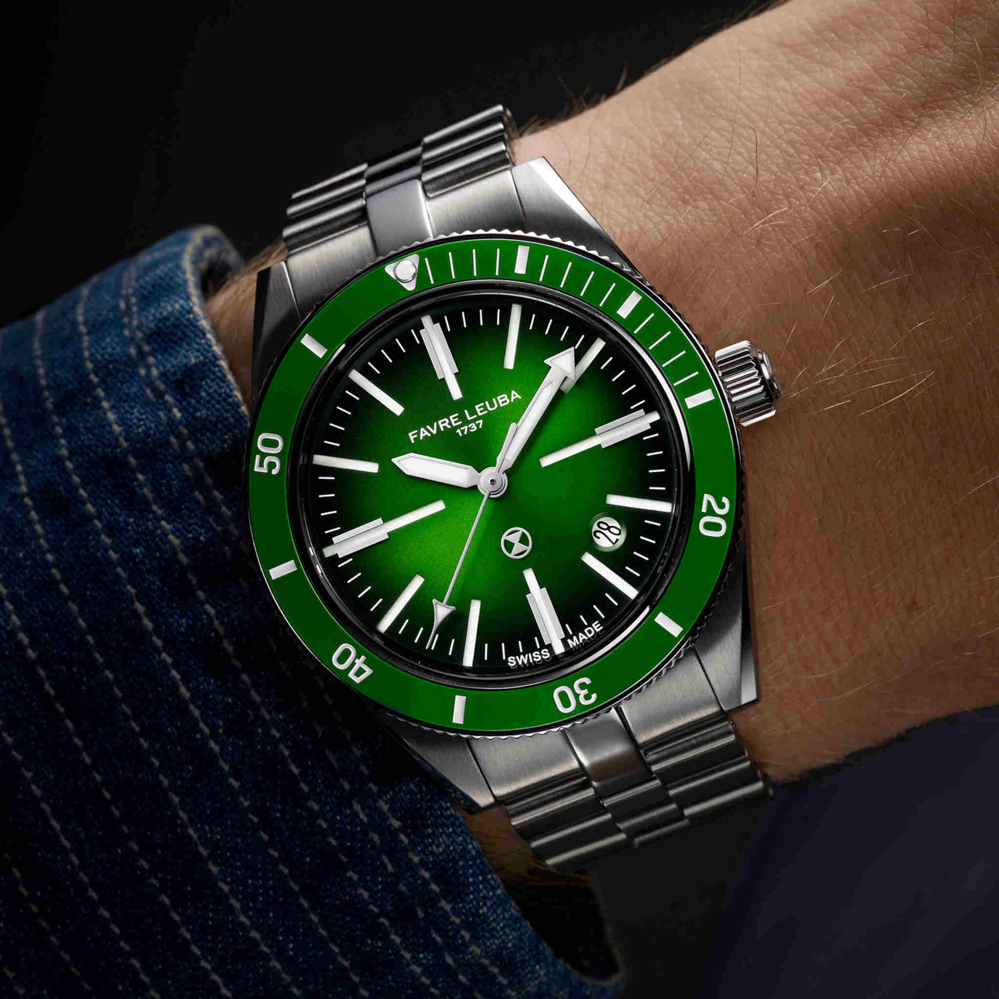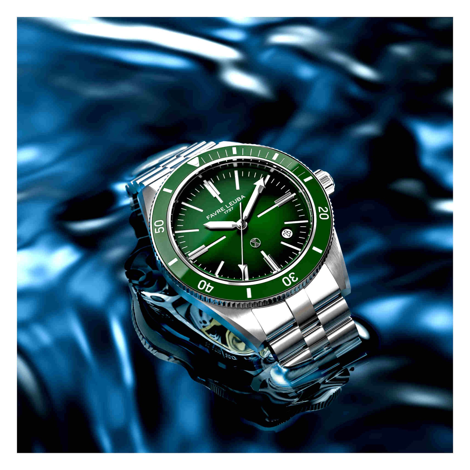 このモデルは、ステンレススティール製の40mmケース(厚さ約12.7mm)に、サファイアクリスタル風防とシースルーのケースバックを装備。La Joux‑Perret G100をベースとしたキャリバーFLD02を搭載し、約68時間のパワーリザーブを実現。サンドイッチ構造のグリーングラデーションダイヤル、セラミック製逆回転防止ベゼル、夜光マーカーが高い視認性を確保。ステンレススティール製ブレスレットが自然な色調に都会的な洗練を添えます。