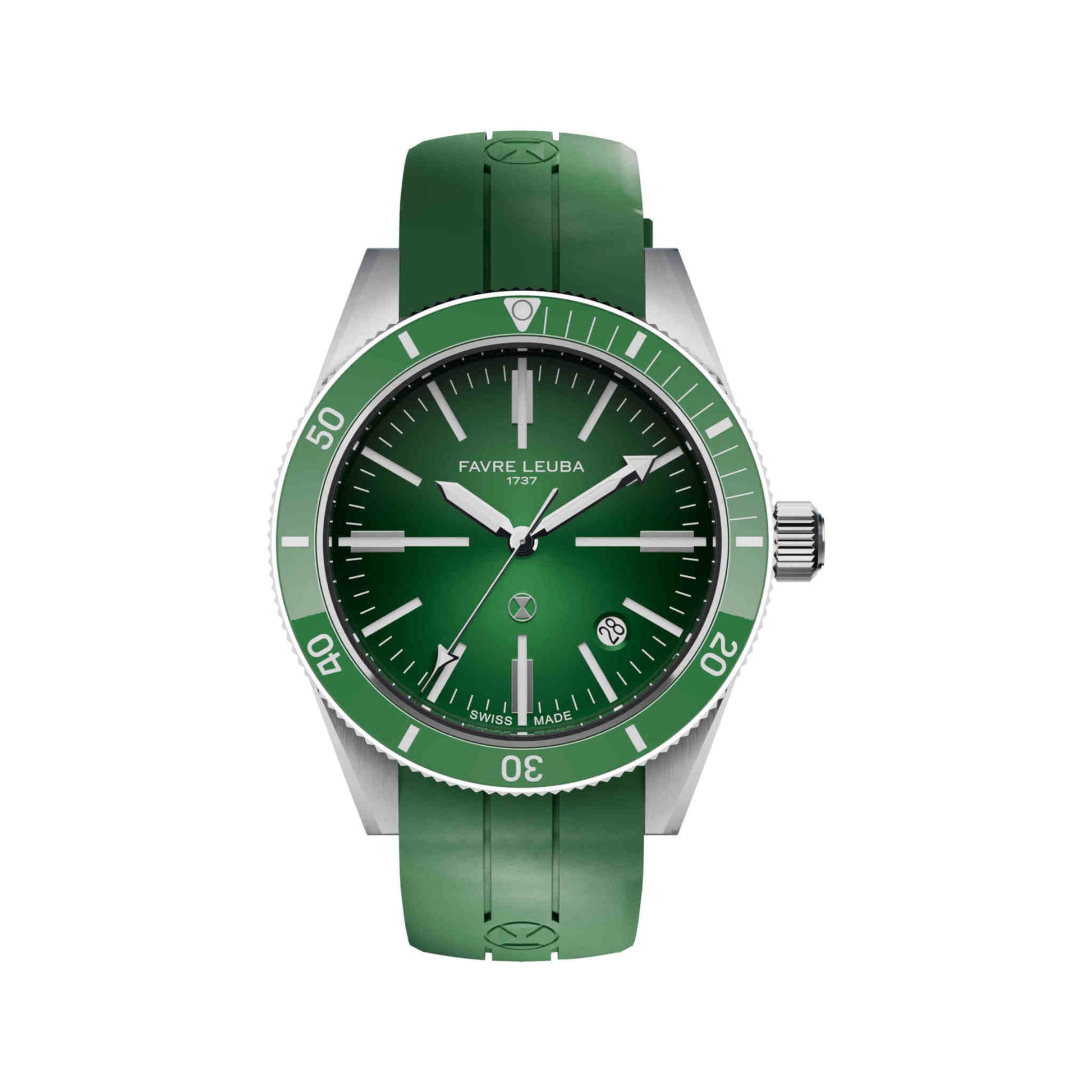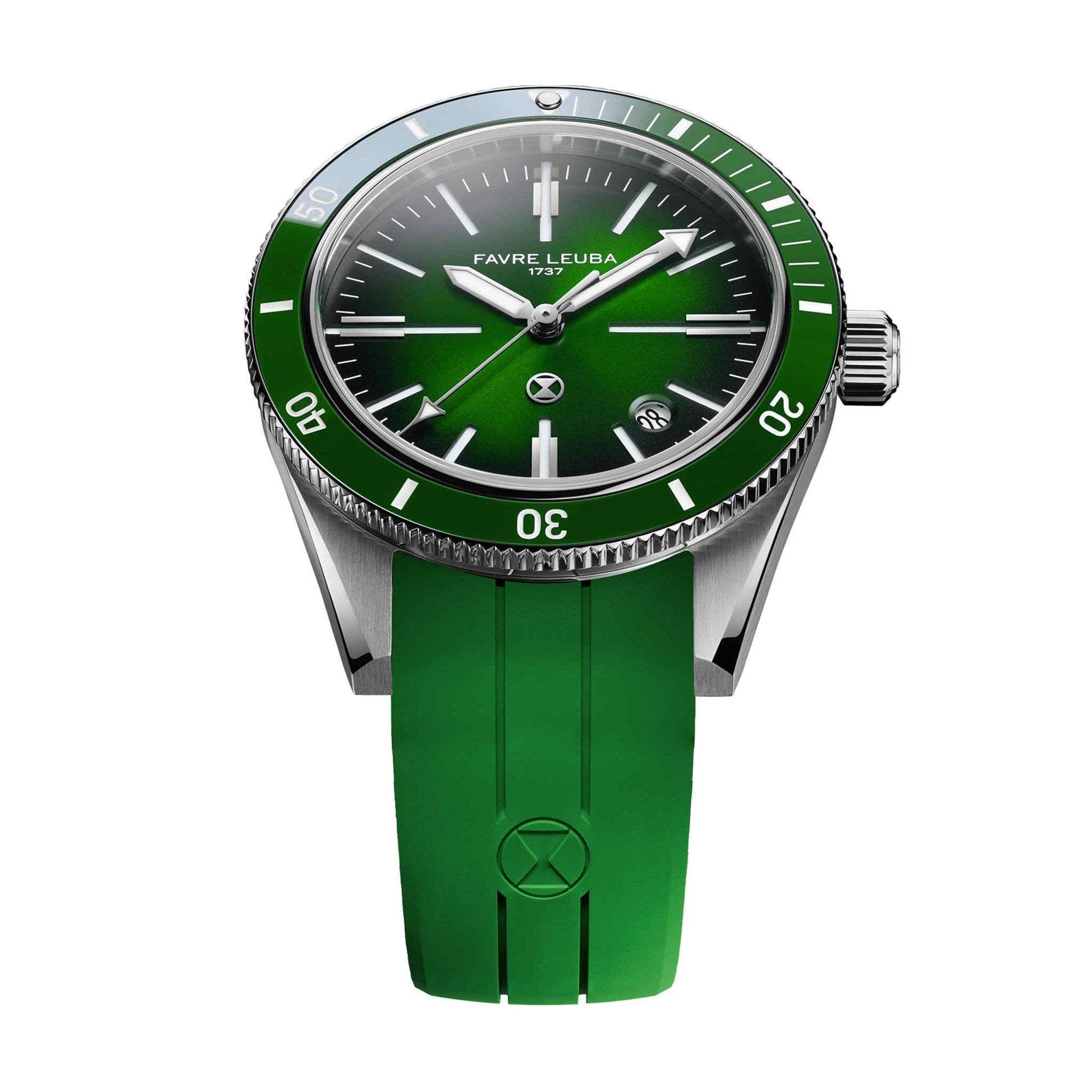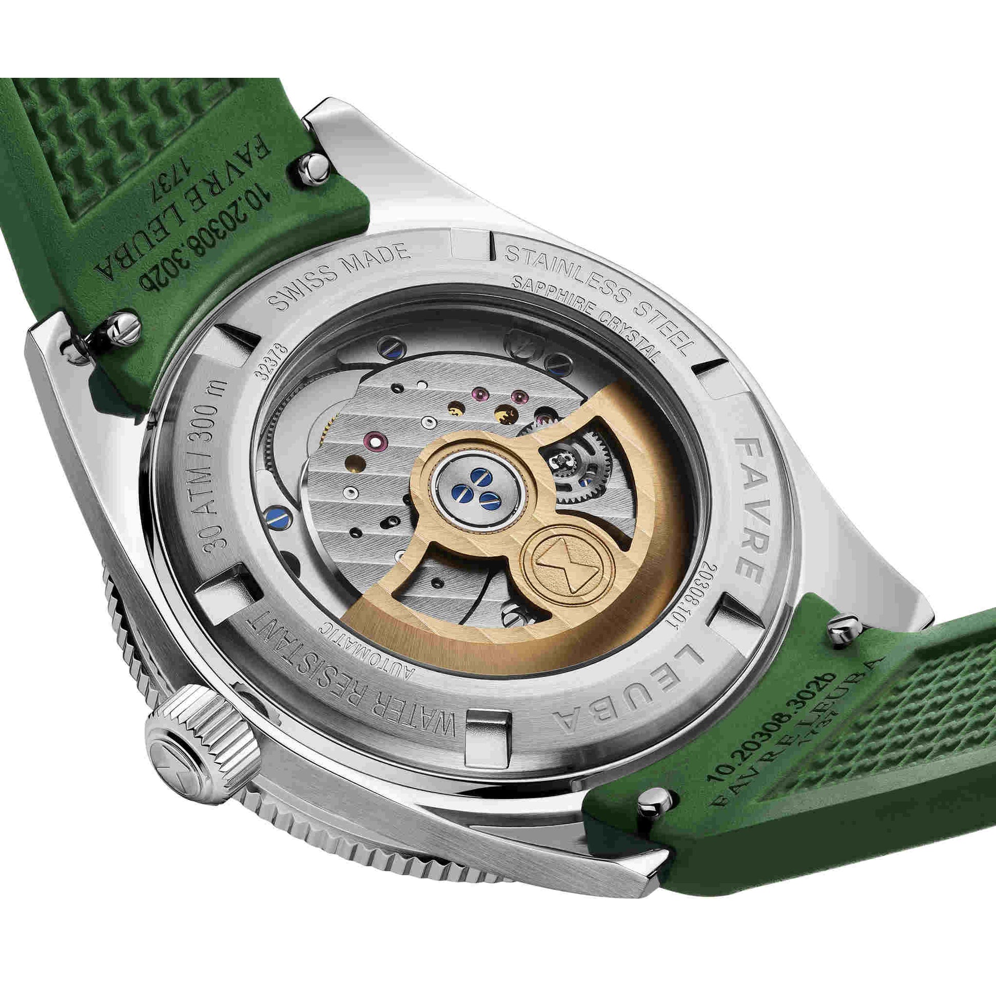 自然の息吹を宿したようなグリーングラデーションが魅力の一本。このモデルは、ケース径40mm/厚さ約12.7mmのステンレススティール製ケースに、サファイアクリスタル風防とシースルーのケースバックを採用。La Joux‑Perret G100をベースとしたキャリバーFLD02が約68時間駆動。サンドイッチ構造のグリーングラデーションダイヤル、セラミック製逆回転防止ベゼル、夜光インデックスで暗所でも高い視認性。300m防水とラバーストラップにより、アウトドアでも頼れる一本です。