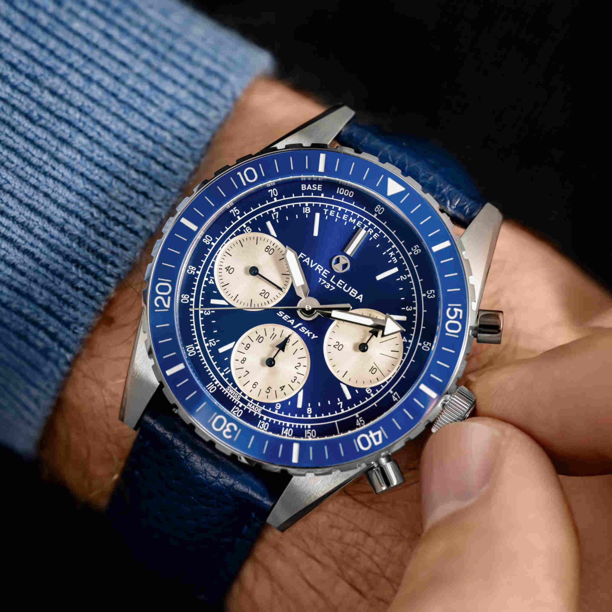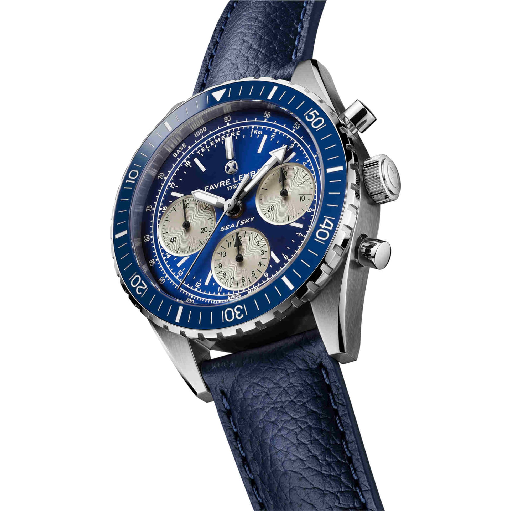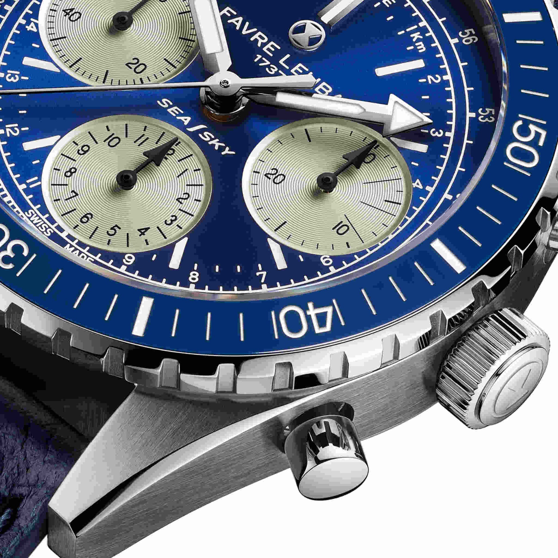 このモデルは、1960年代の名作を現代仕様で忠実に蘇らせた復刻盤であり、、鮮やかなサンレイ仕上げのブルーダイヤルが光を浴びて表情を変える華やかなクロノグラフです。40mmの316Lステンレススティール製ケースにはポリッシュ&ブラッシュ加工を施し、両面にあるサファイアクリスタルとセラミック製逆回転防止ベゼルで高い耐久性と視認性を確保。ムーブメントはLa Joux‑Perret L112をベースとしたキャリバーFLC01(約60時間パワーリザーブ)を採用し、タキメーターとテレメーターとテレメーター機能で実用性も高い構成。3,6,9時の位置に3つのホワイトのカウンターが付いています。幅広のアロー・シェイプの針とヴィンテージ風のインデックスにより、時計のクラシックな魅力がさらに高まります。