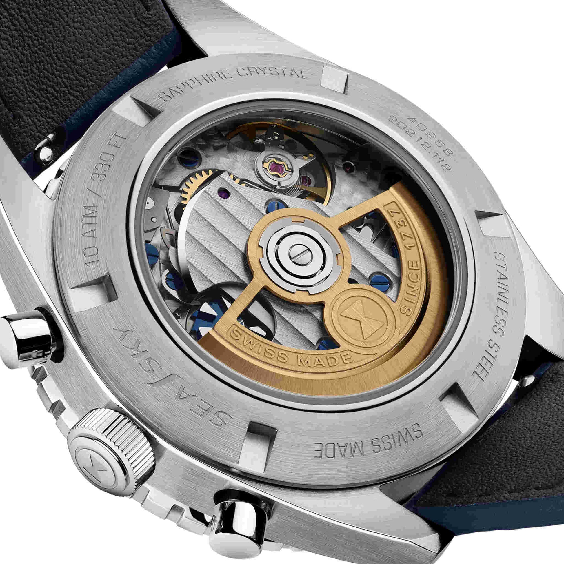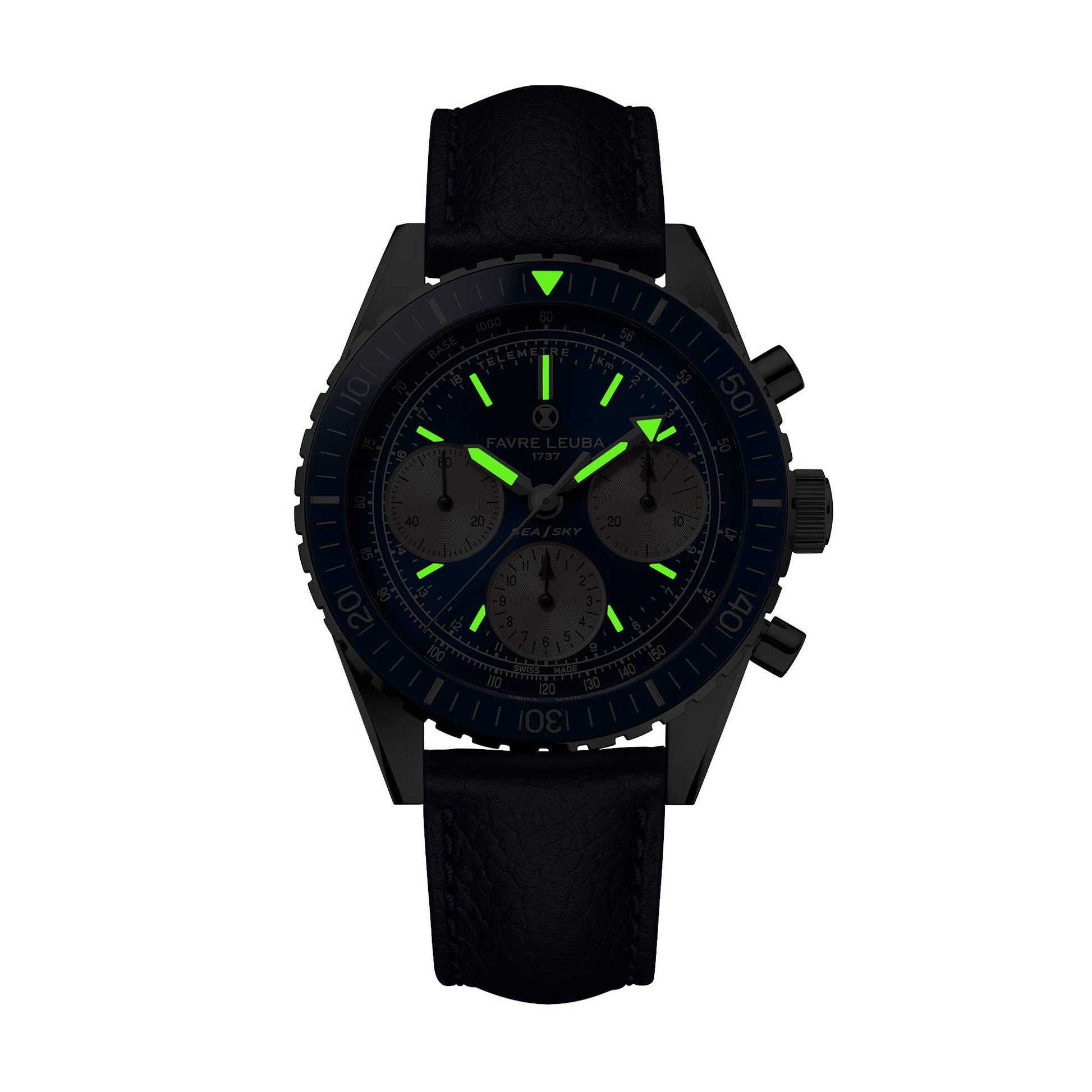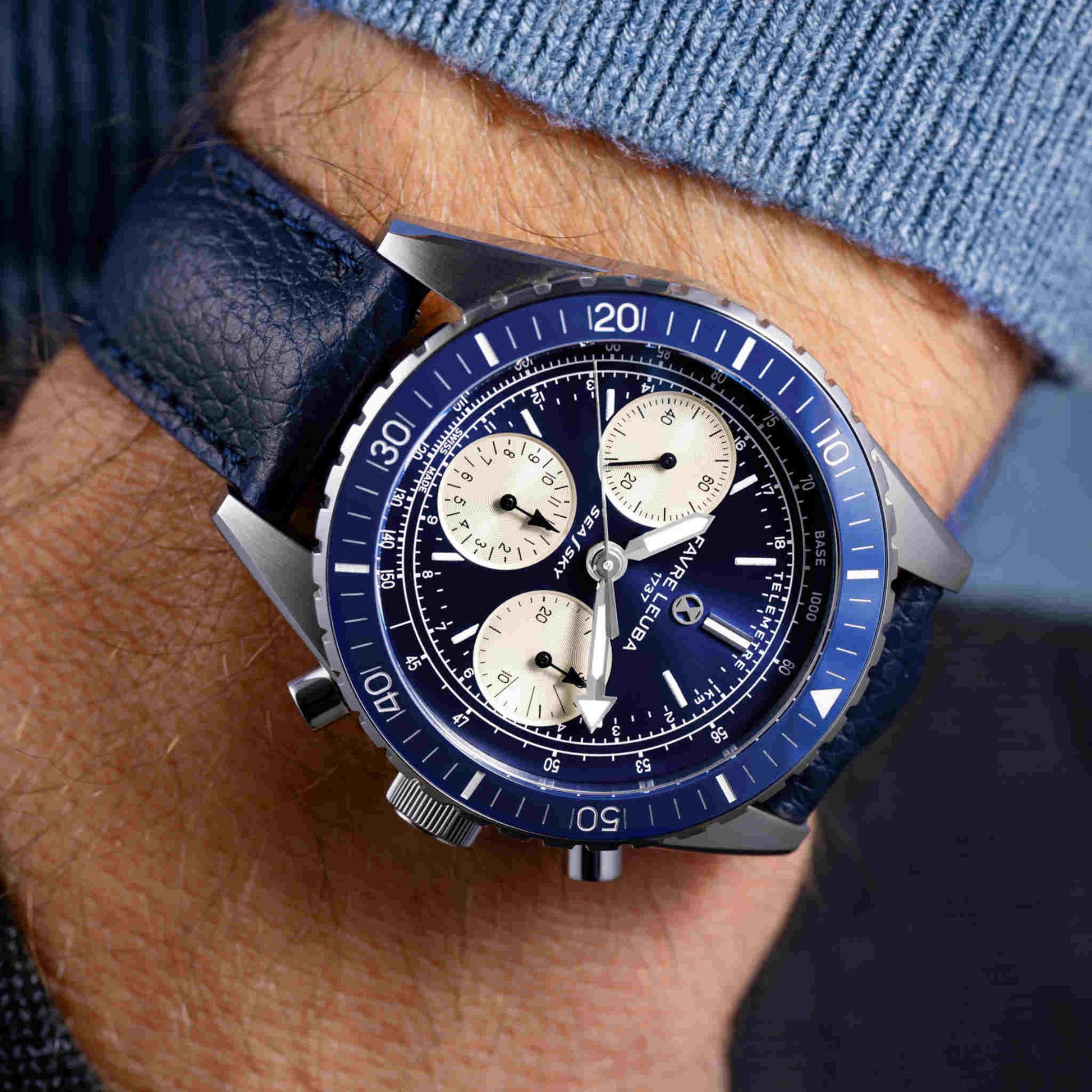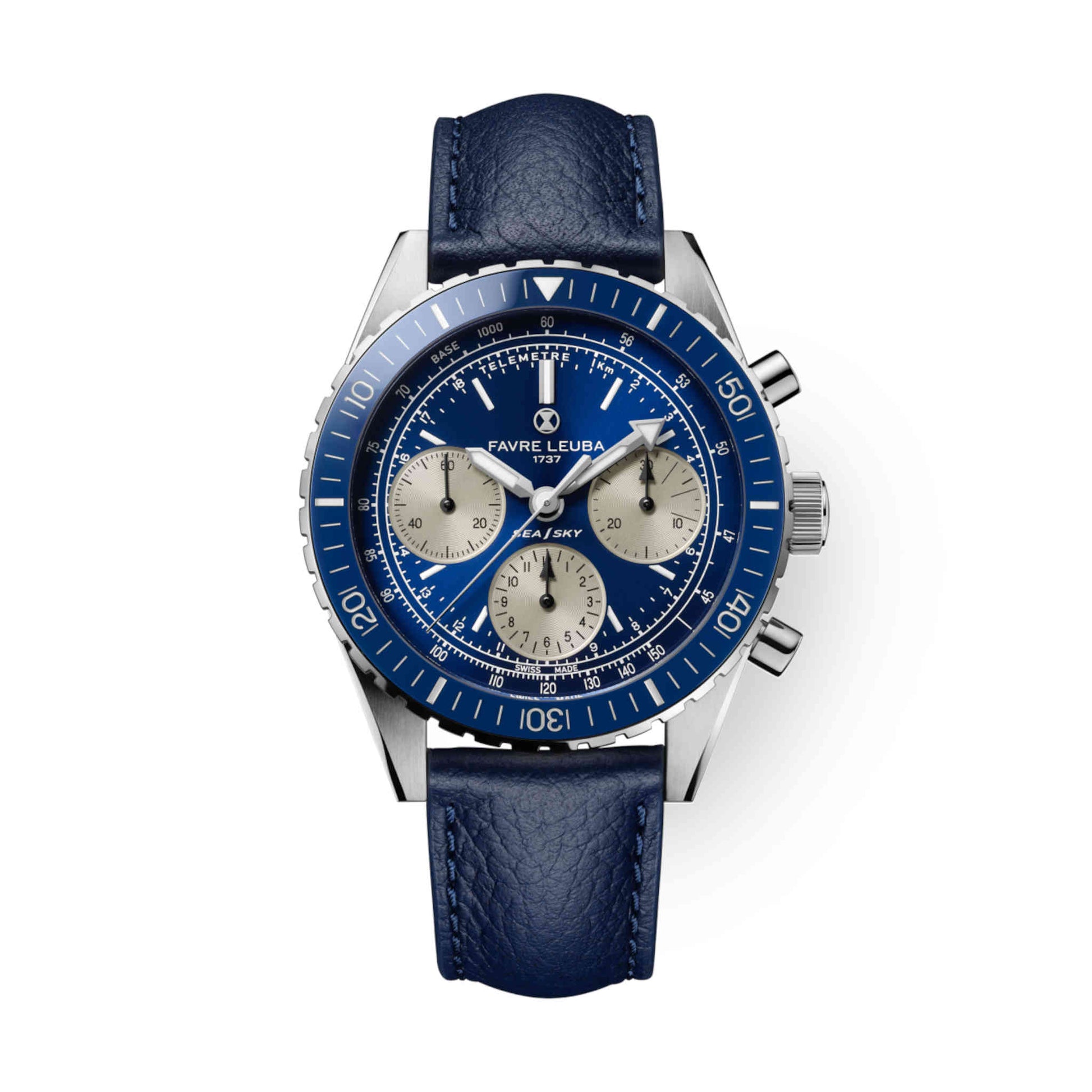 このモデルは、1960年代の名作を現代仕様で忠実に蘇らせた復刻盤であり、、鮮やかなサンレイ仕上げのブルーダイヤルが光を浴びて表情を変える華やかなクロノグラフです。40mmの316Lステンレススティール製ケースにはポリッシュ&ブラッシュ加工を施し、両面にあるサファイアクリスタルとセラミック製逆回転防止ベゼルで高い耐久性と視認性を確保。ムーブメントはLa Joux‑Perret L112をベースとしたキャリバーFLC01(約60時間パワーリザーブ)を採用し、タキメーターとテレメーターとテレメーター機能で実用性も高い構成。3,6,9時の位置に3つのホワイトのカウンターが付いています。幅広のアロー・シェイプの針とヴィンテージ風のインデックスにより、時計のクラシックな魅力がさらに高まります。
